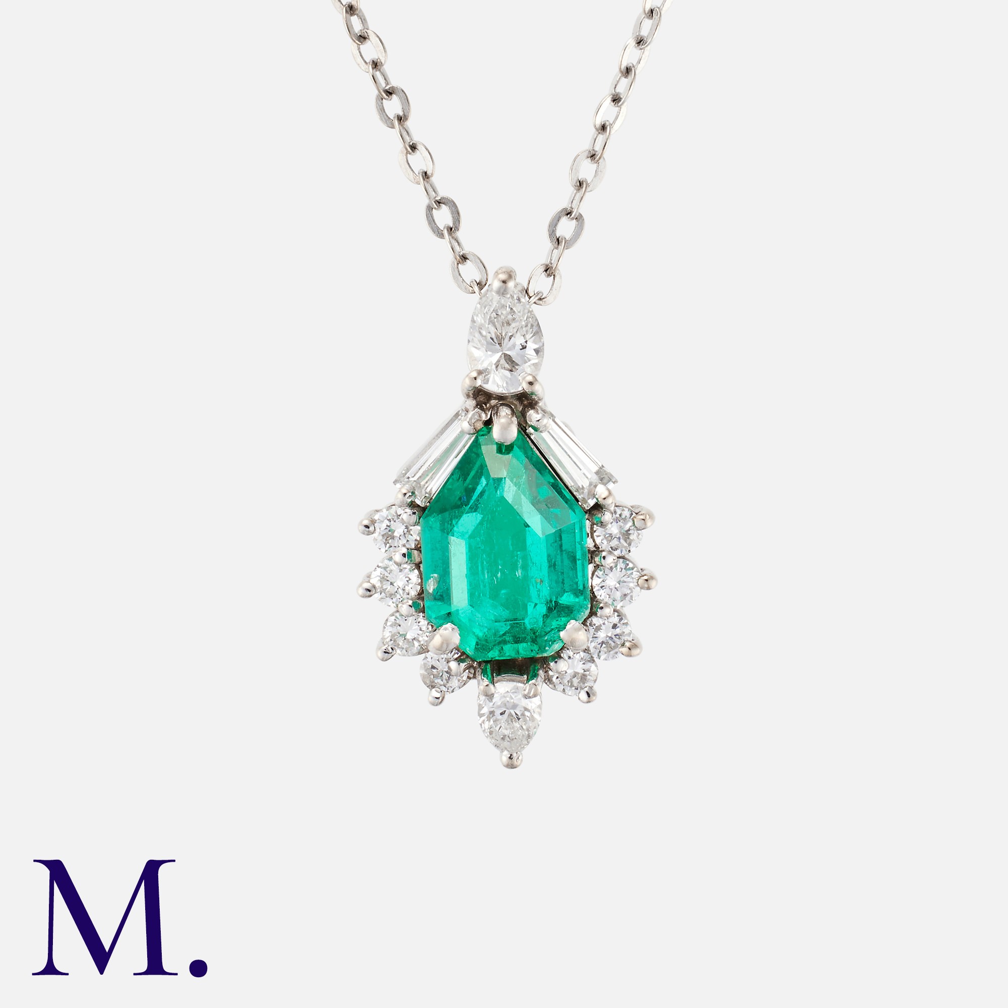 A Colombian Emerald & Diamond Pendant in 18k white gold, set with a principal mixed cut emerald within a border of tapered baguette, round cut and pear shaped diamonds, to a fine trace chain. Stamped 750 for 18 carat gold. Accompanied by a verbal gemmological assessment stating the emerald is of Colombian origin with minor enhancement.