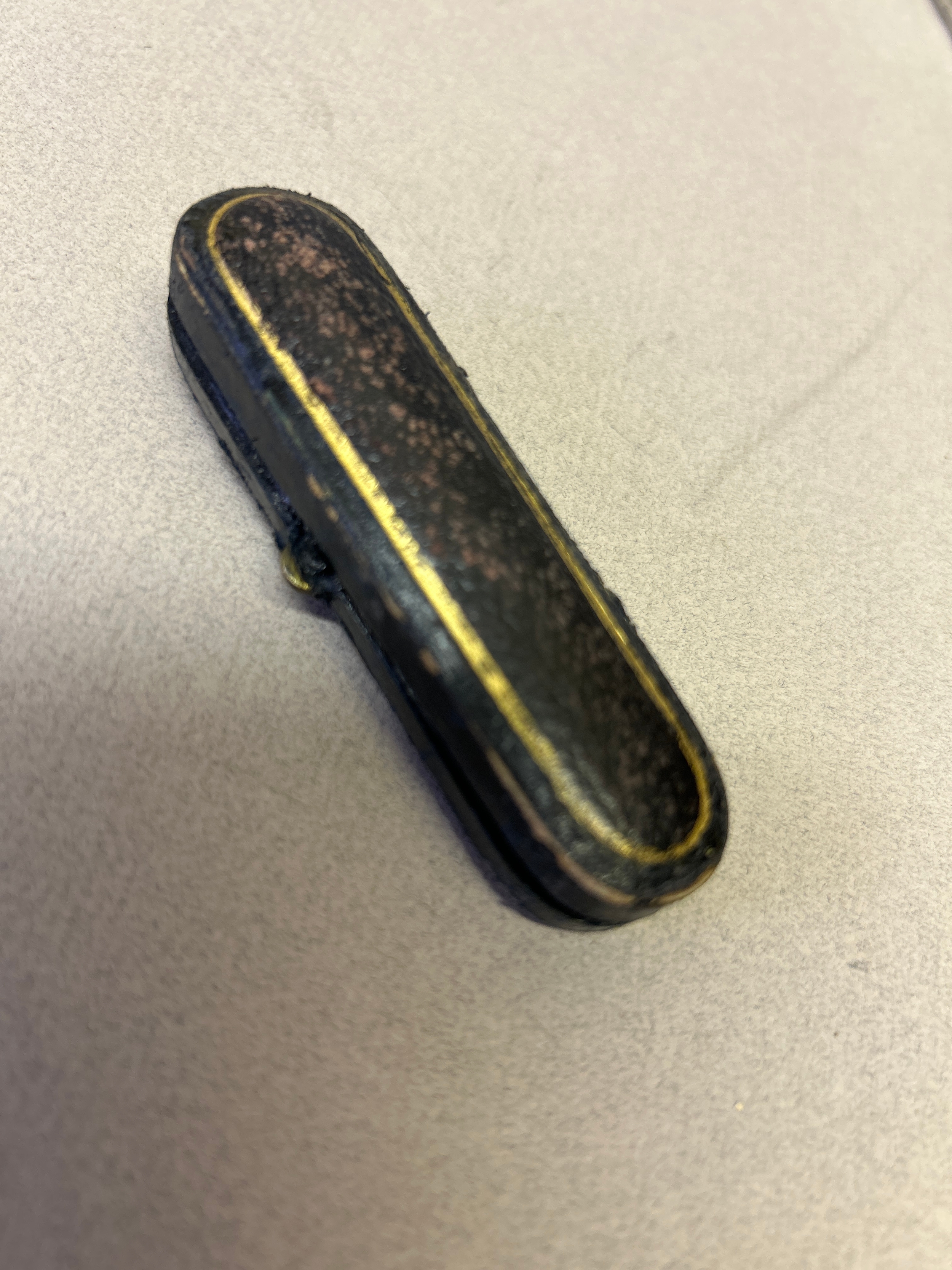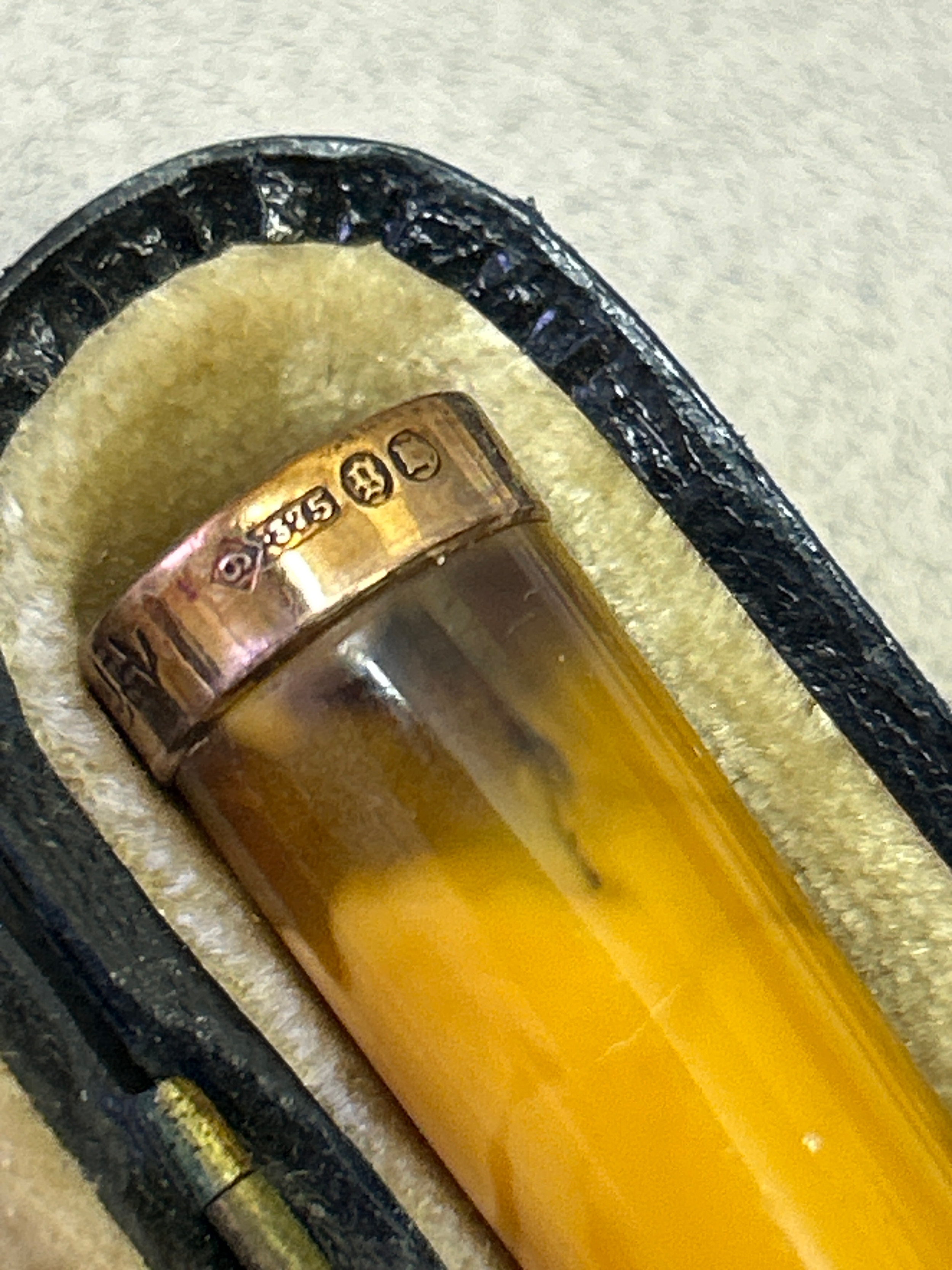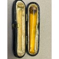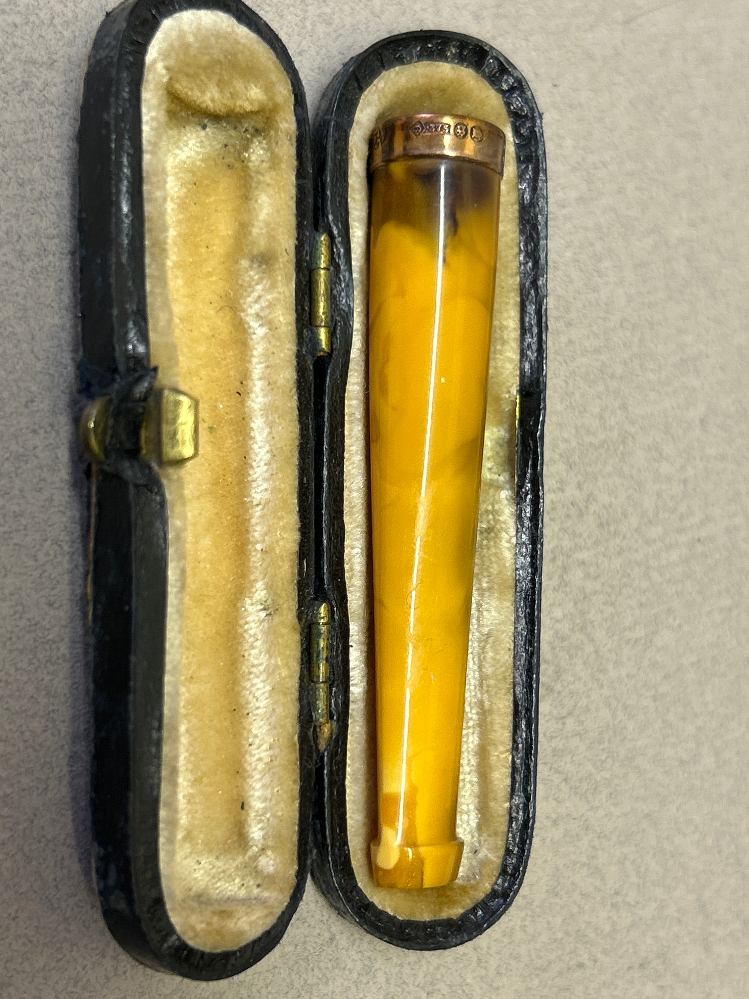 An amber cheroot holder with a 9ct gold tip hallmarked London 1922 with original leather case.