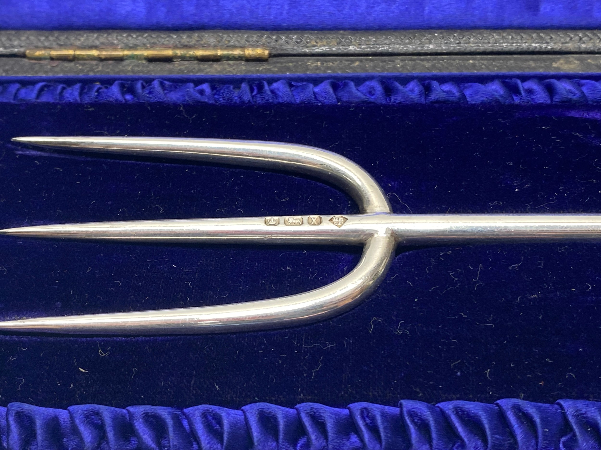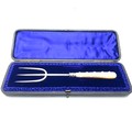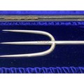 Large 20cm Sterling silver toasting fork in a blue velvet case with mother of pearl, hallmarks for Sheffield 1890 by Martin, Hall & Co (Richard Martin & Ebenezer Hall). Shrewsbury Works, Sheffield.