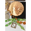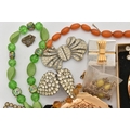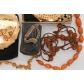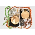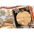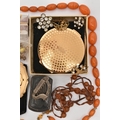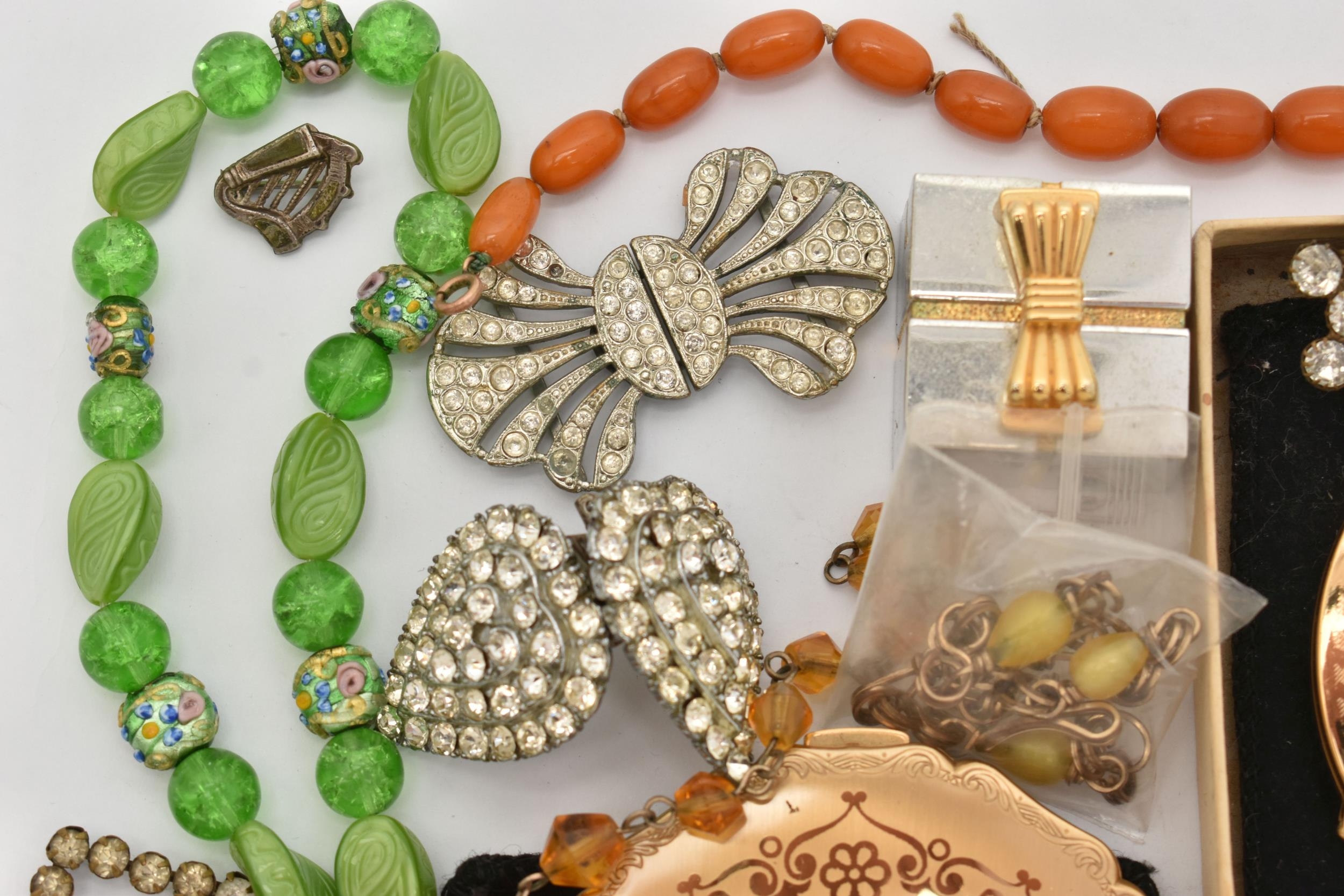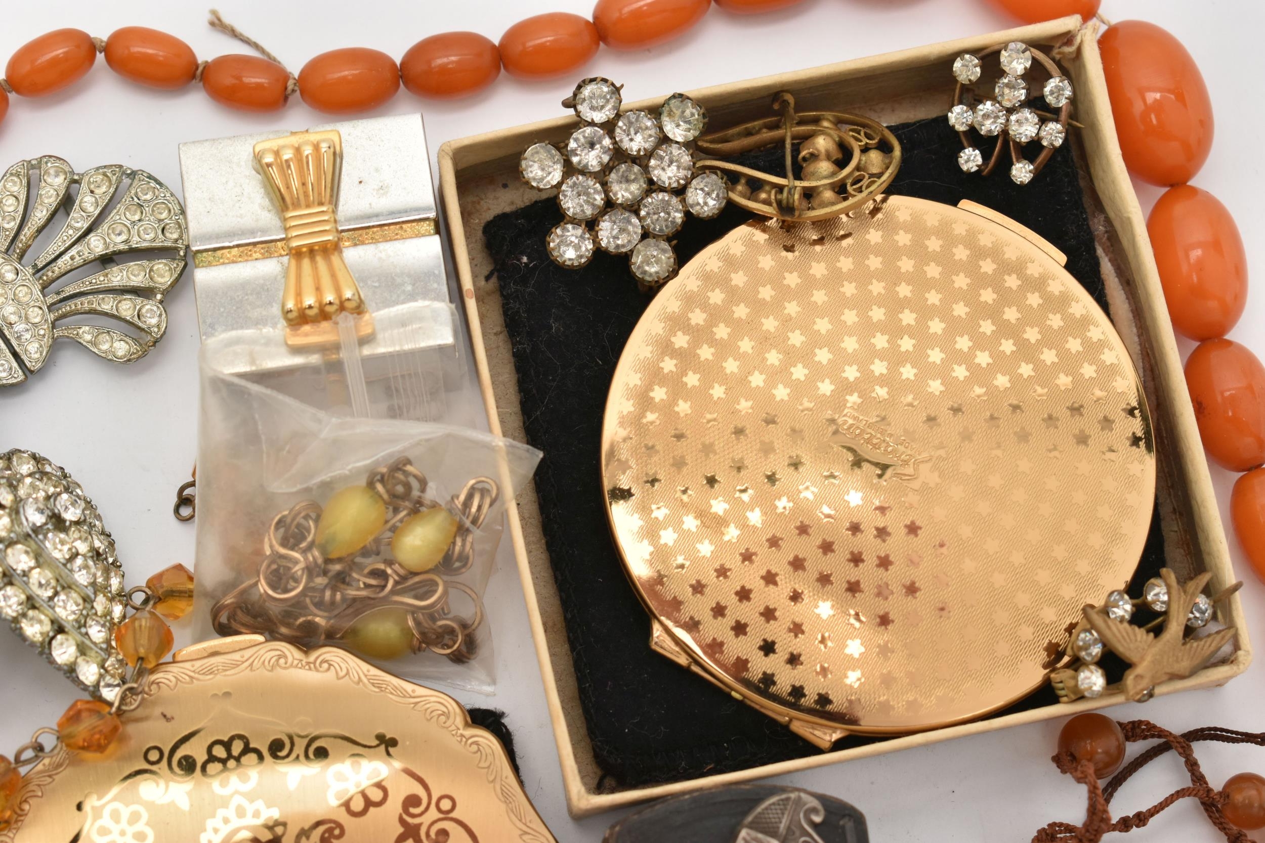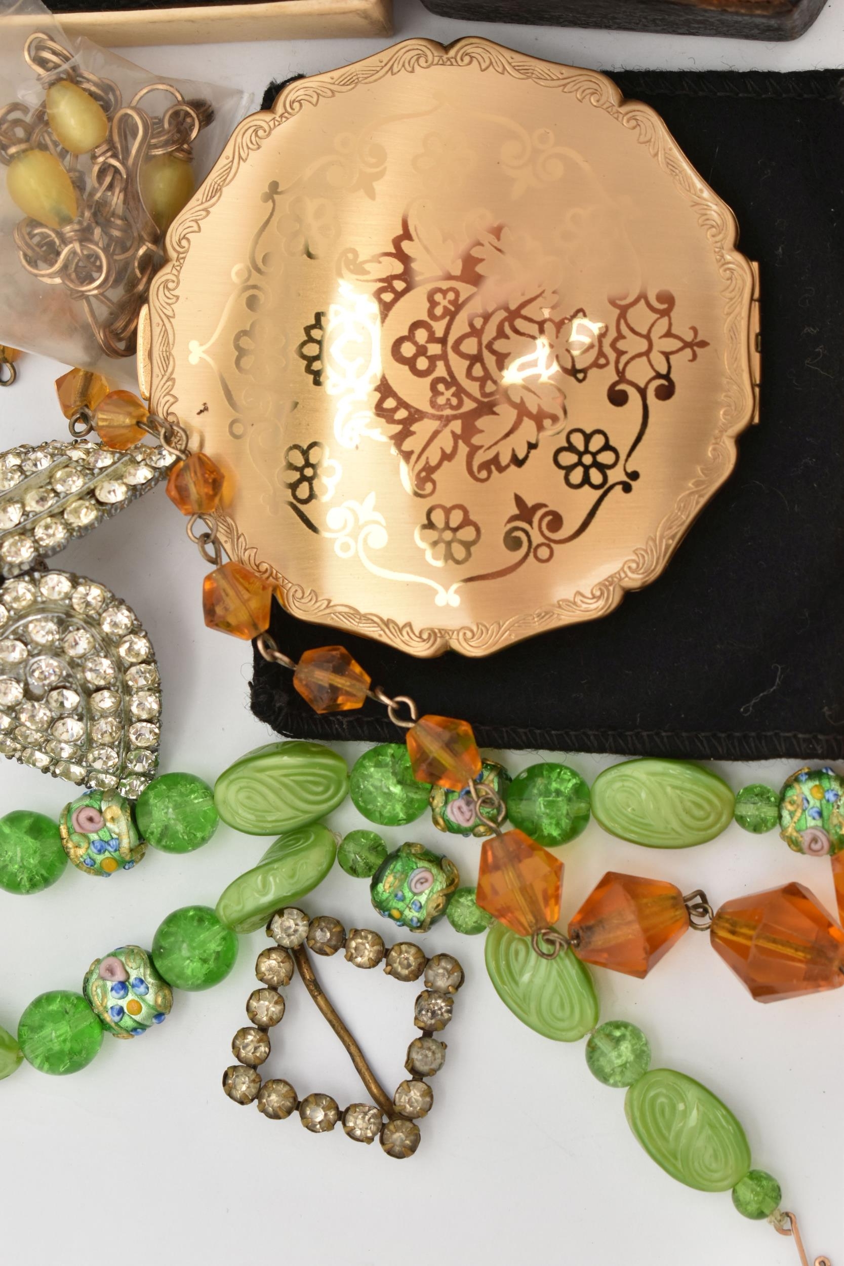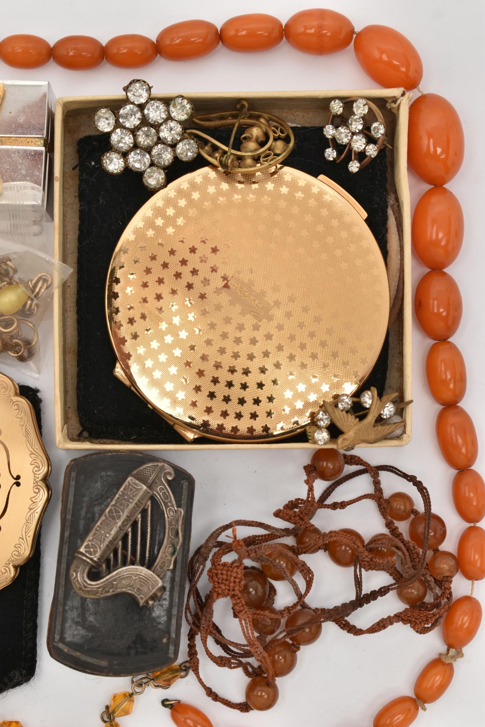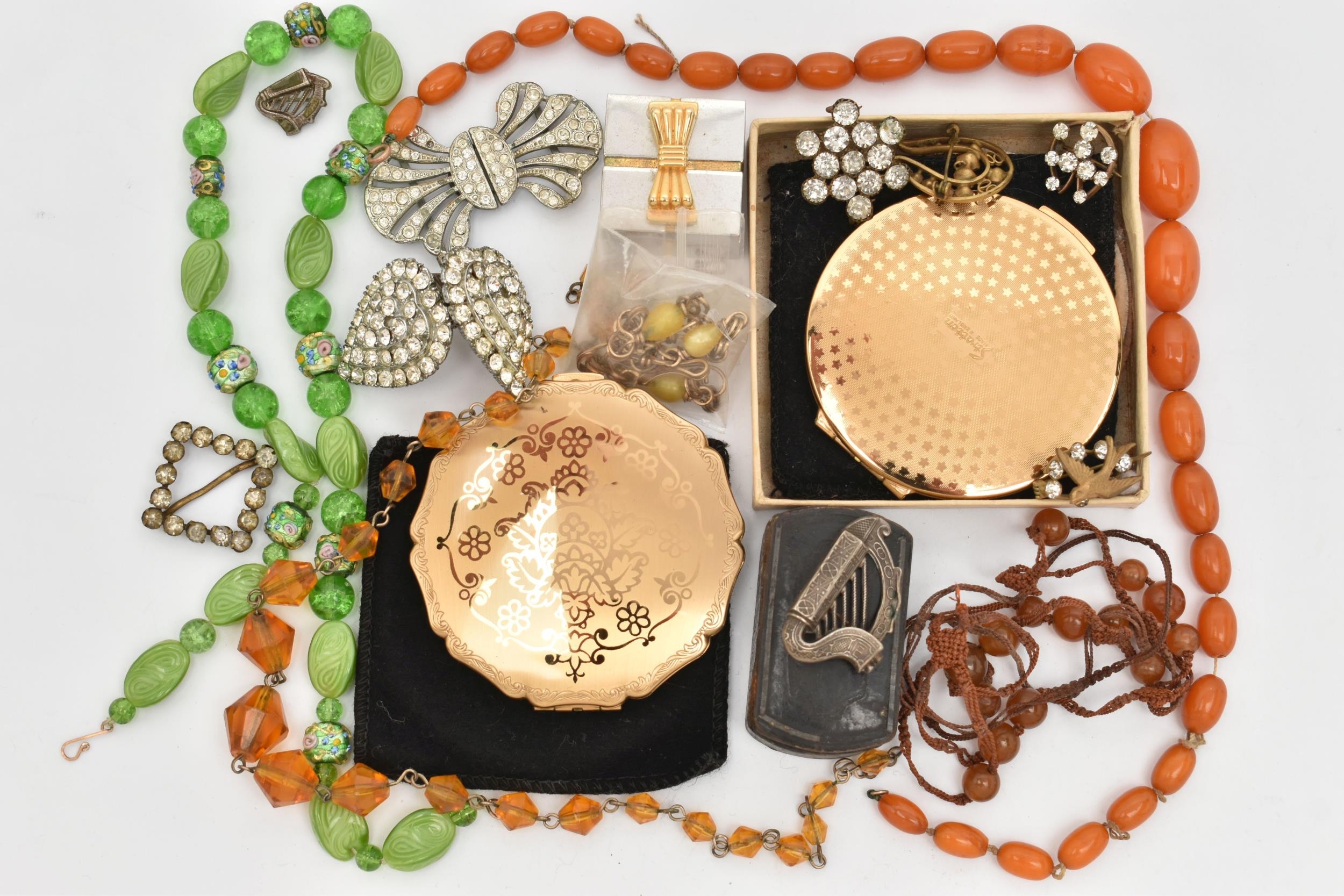 A BOX OF ASSORTED ITEMS, to include a silver harp brooch, hallmarked Birmingham 1888, approximate gross weight 2.9 grams, four early 20th century paste brooches, a paste buckle, two 'Stratton' compacts, a Bakelite beaded necklace, a paper mâché snuff box, and other assorted items