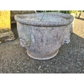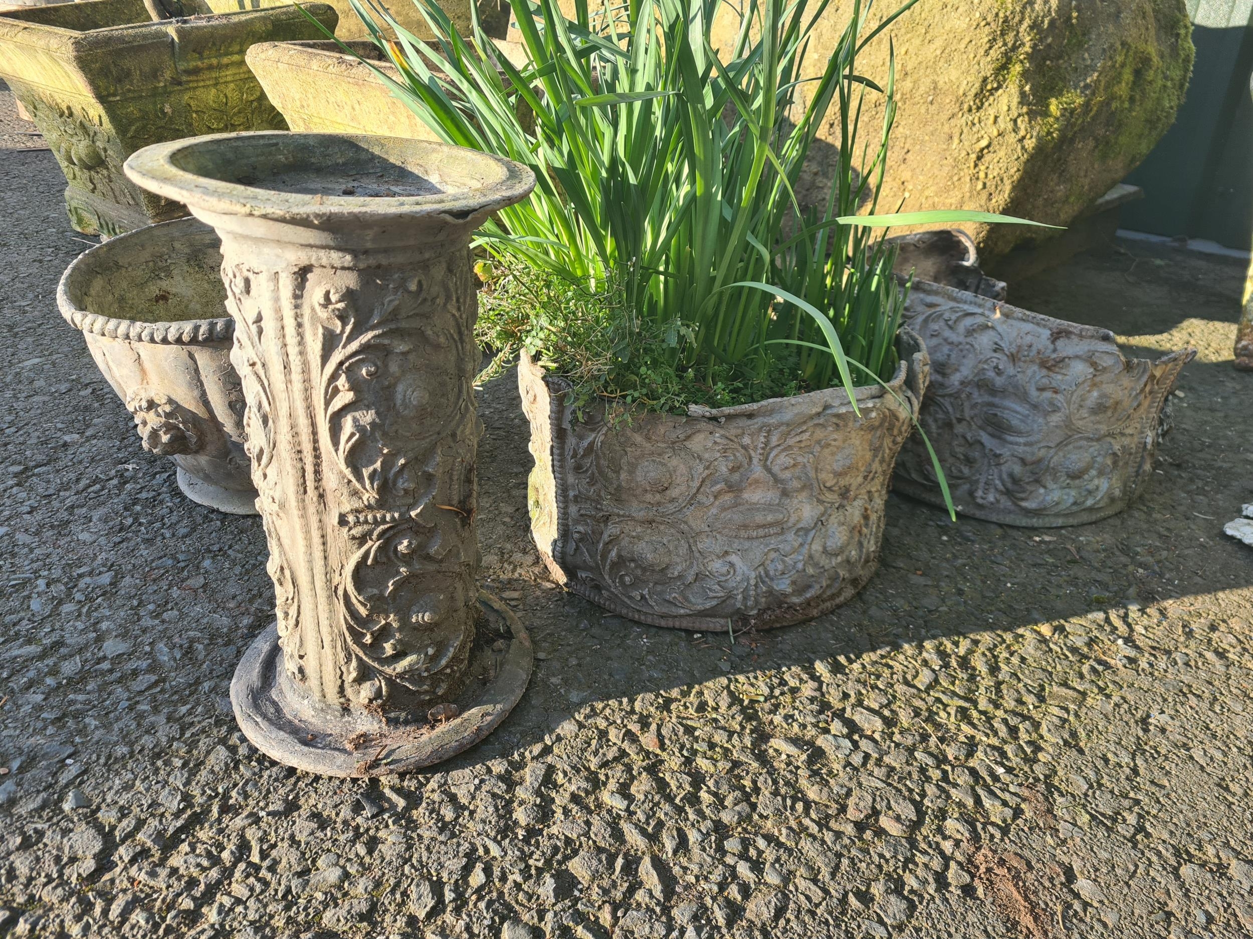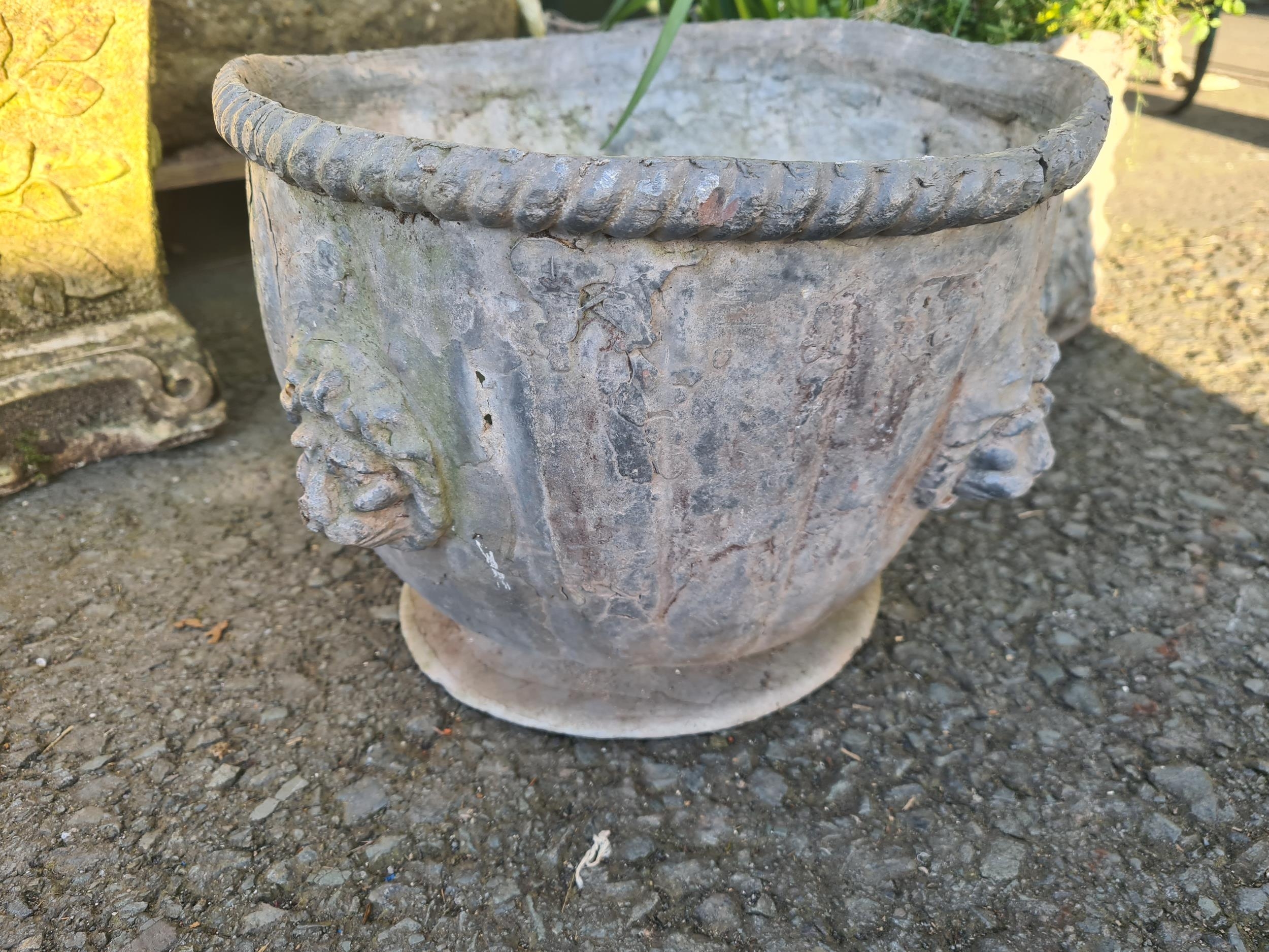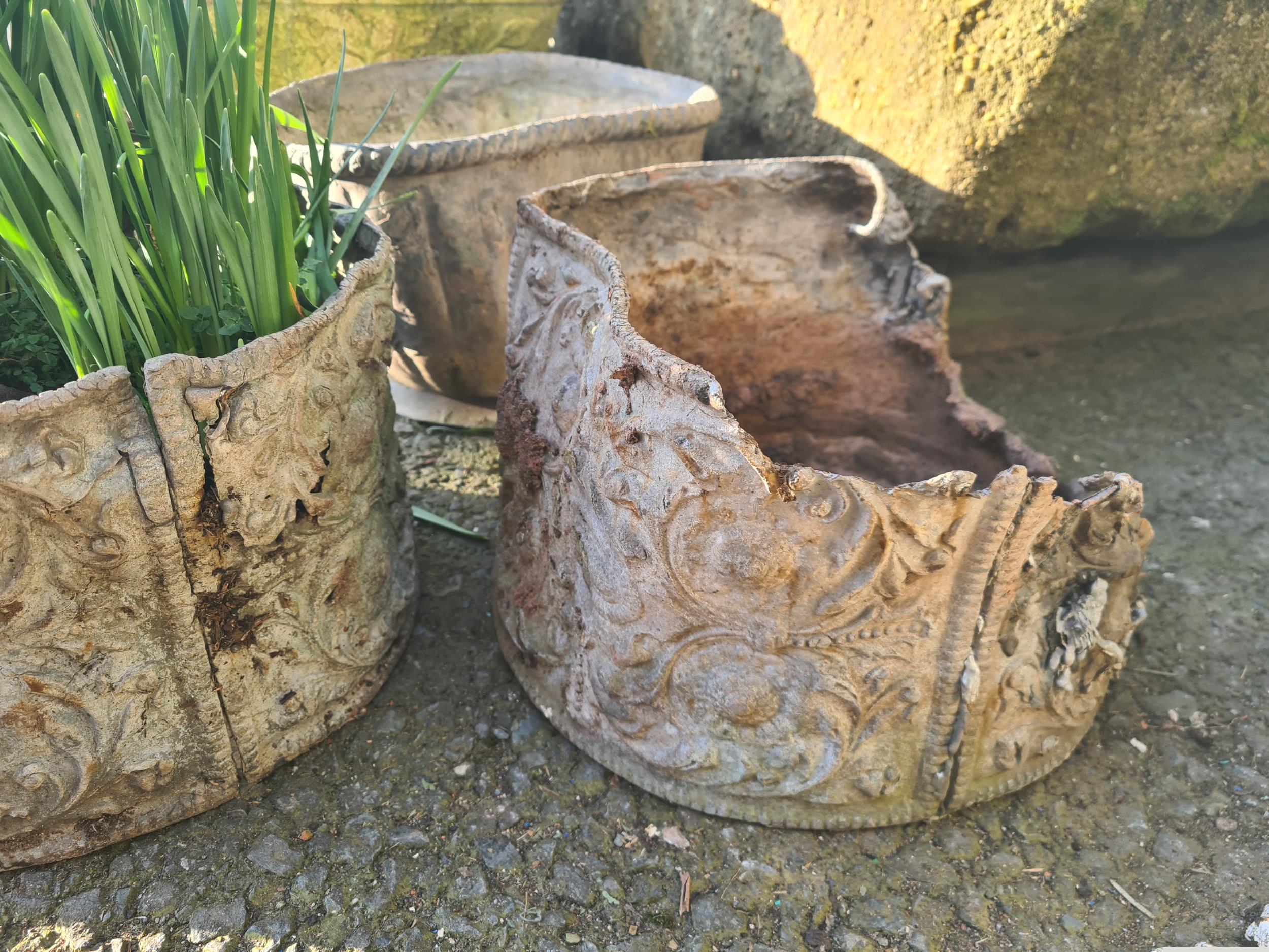 An iron Kettle Stand, 16in, and four small lead Planters, one A/F