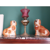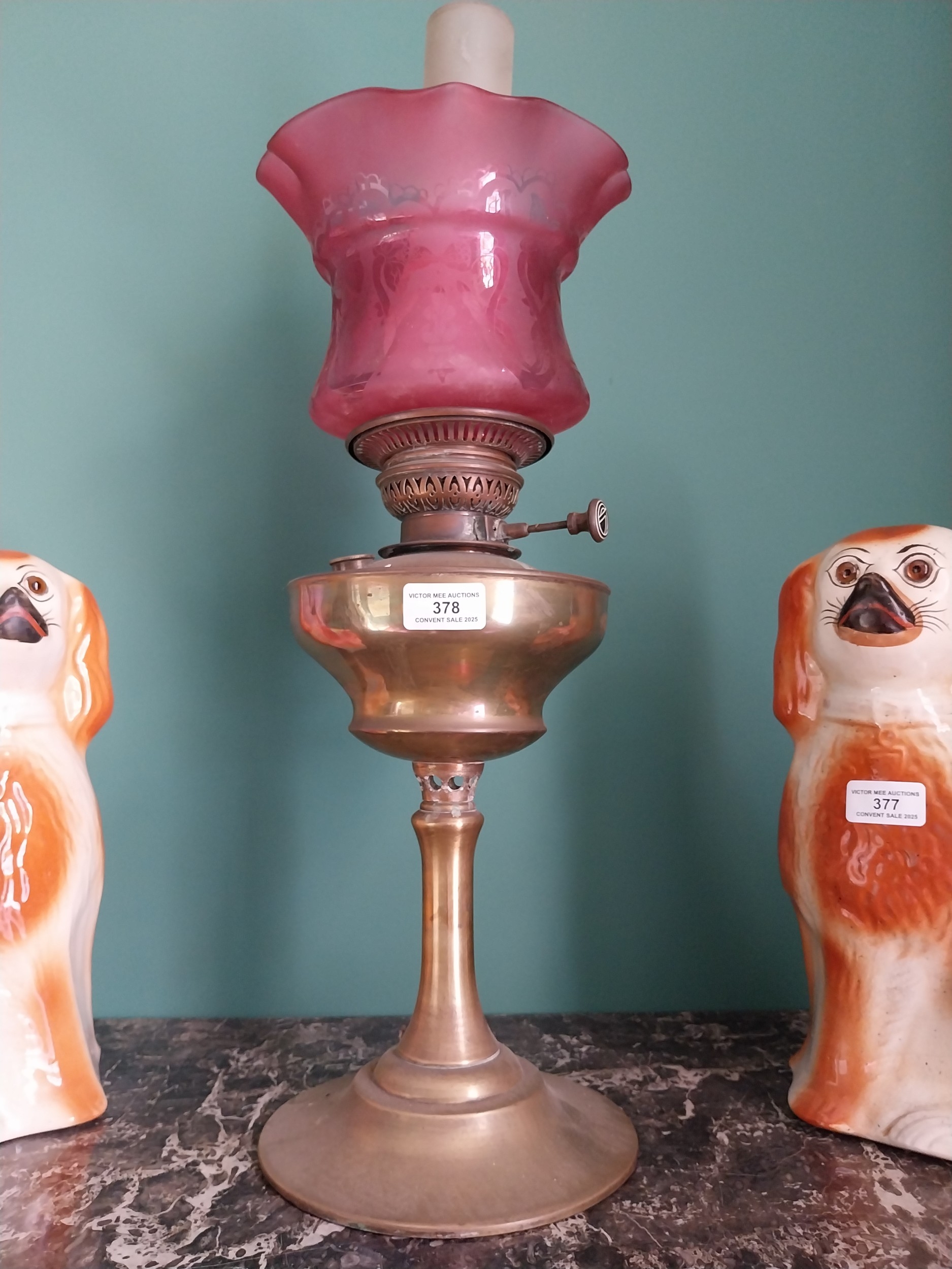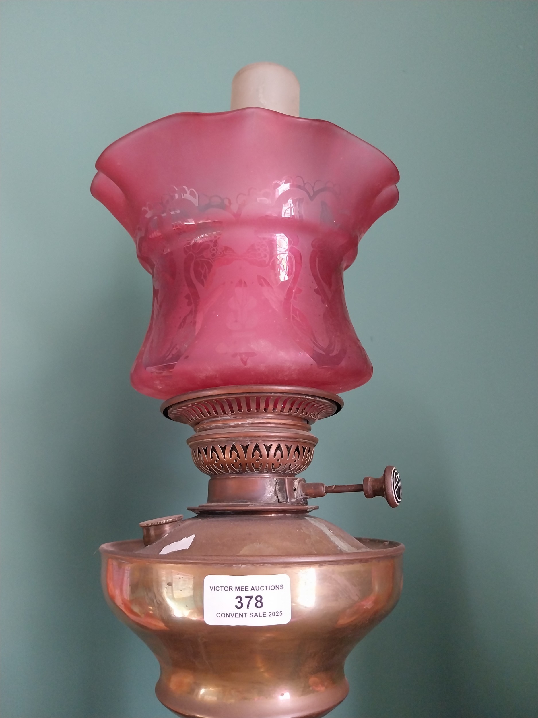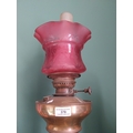 Edwardian brass oil lamp with ruby glass shade. { 60cm H X 22cm Dia }.