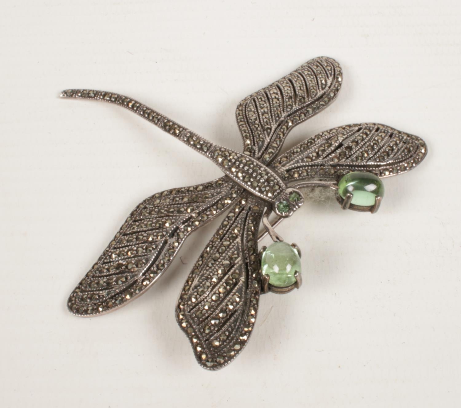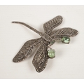 A silver marcasite dragonfly brooch with articulated wings.