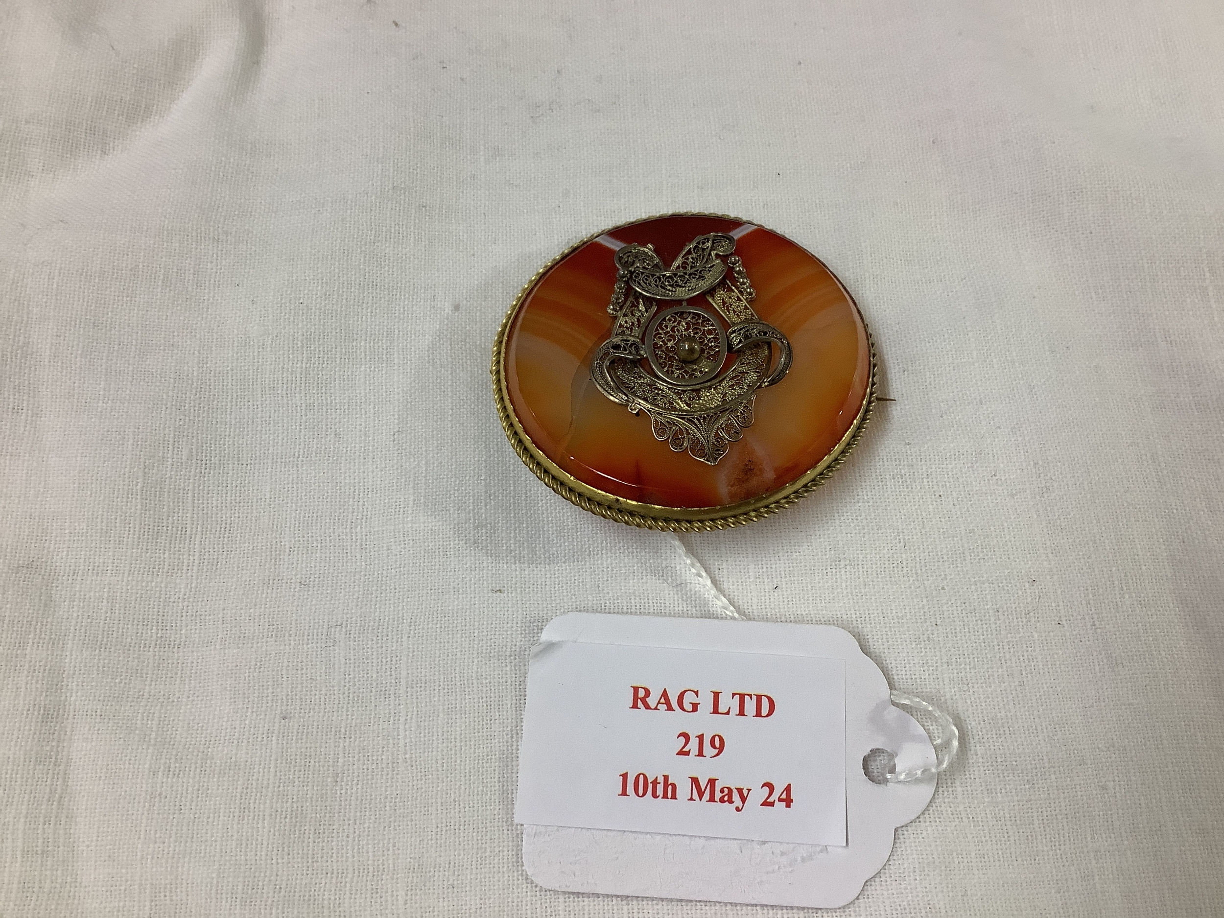 A vintage carnelian agate brooch inset with silver filigree