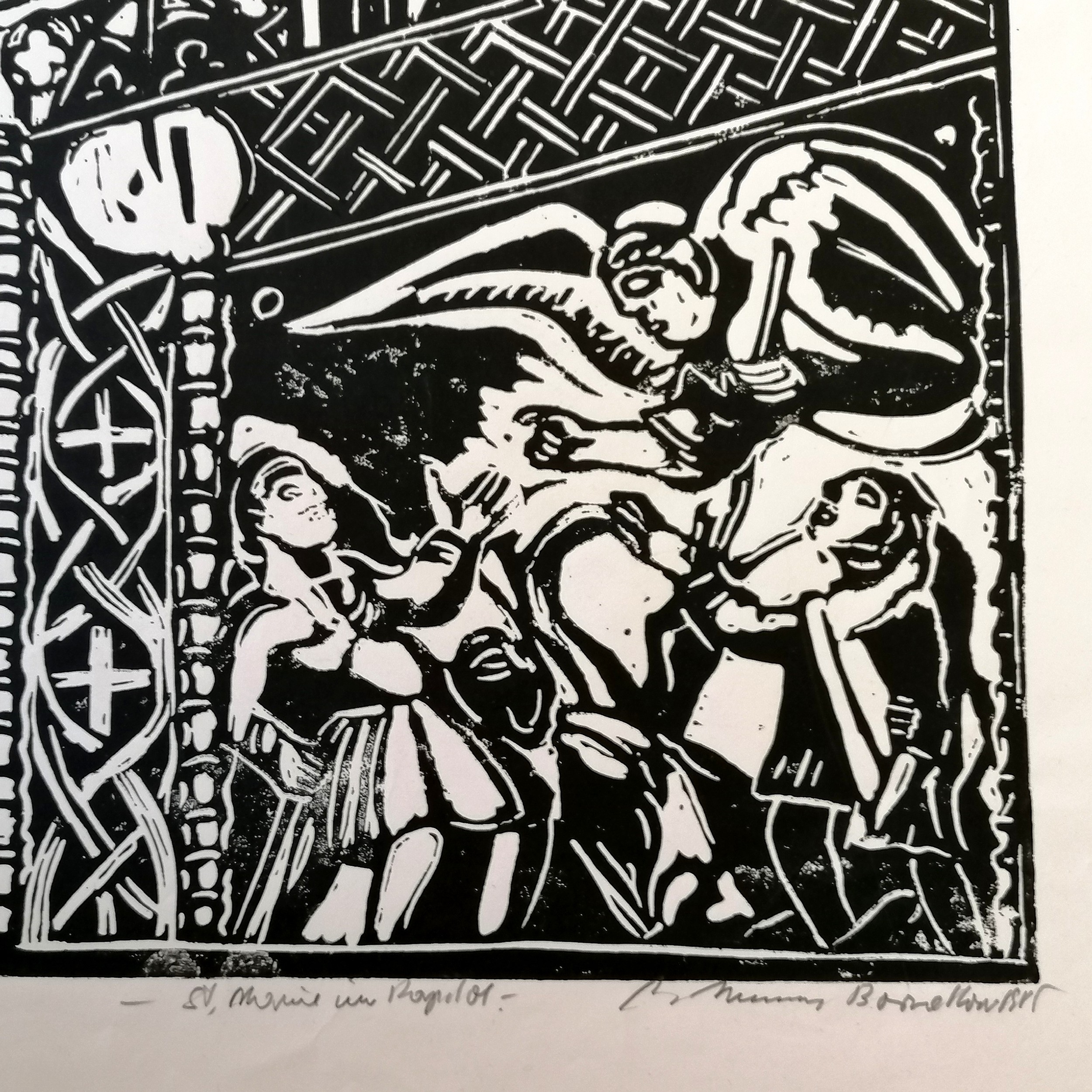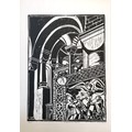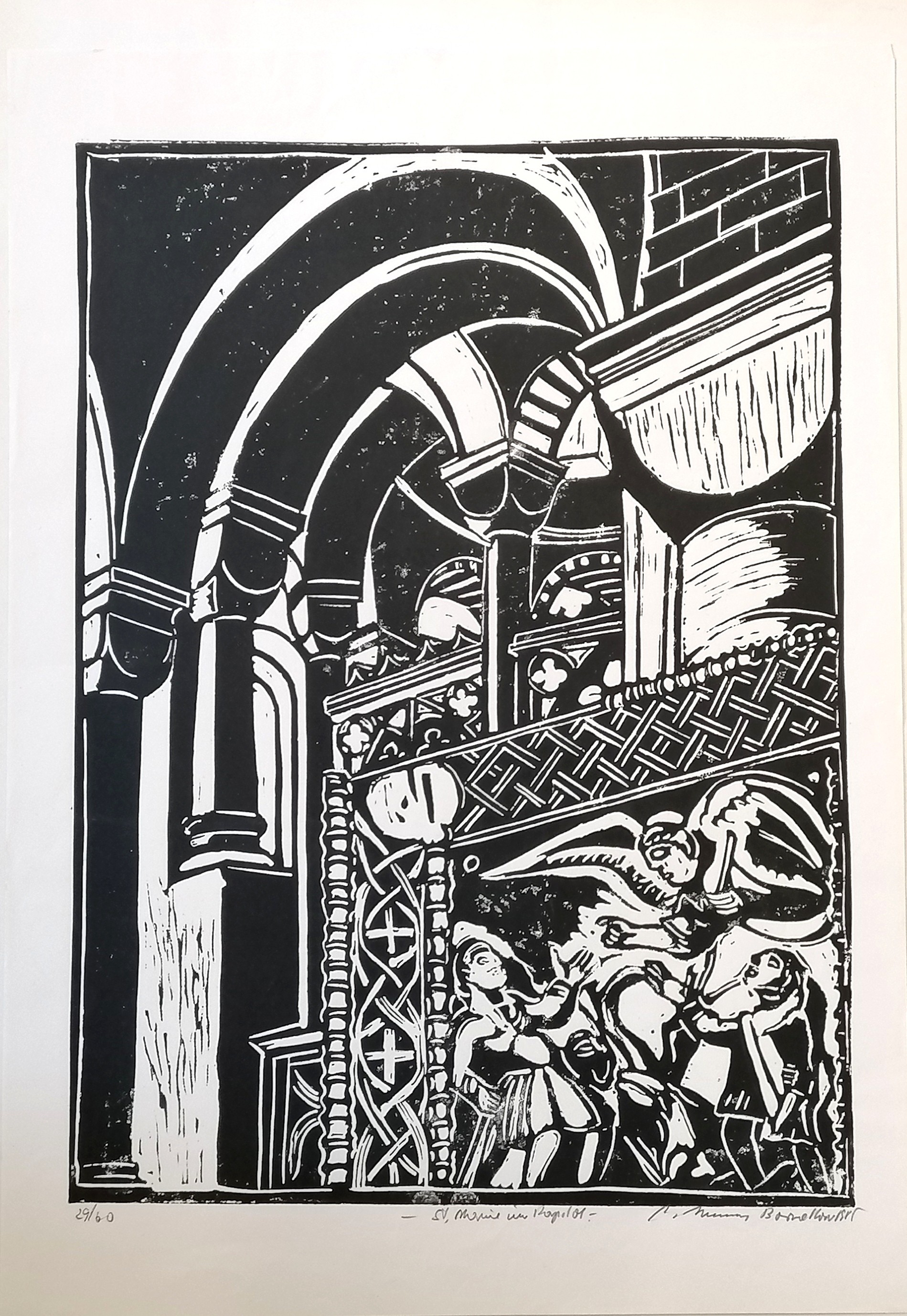 Continental signed linocut of church interior from a ltd ed of 60 - 59cm x 42cm