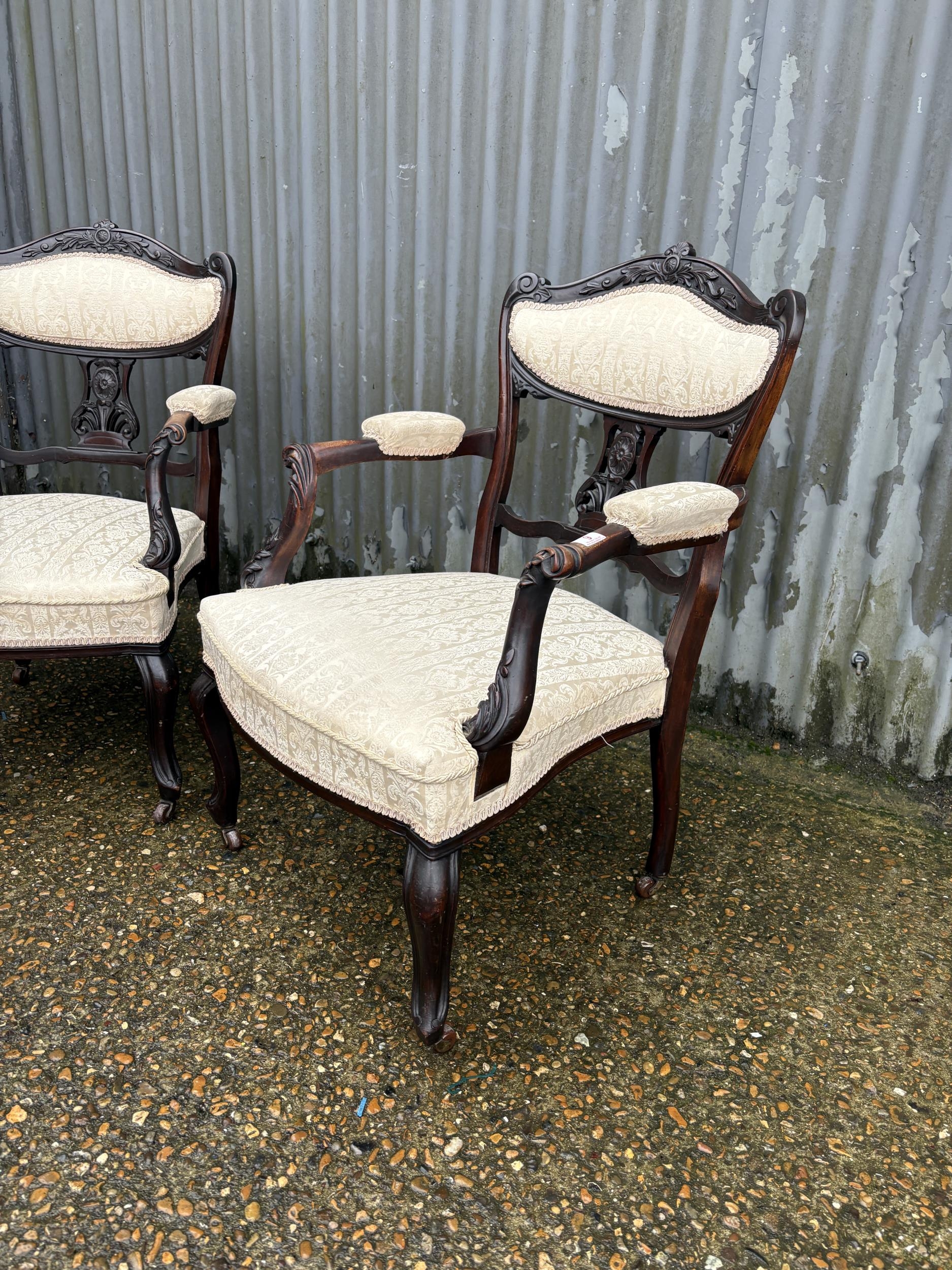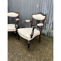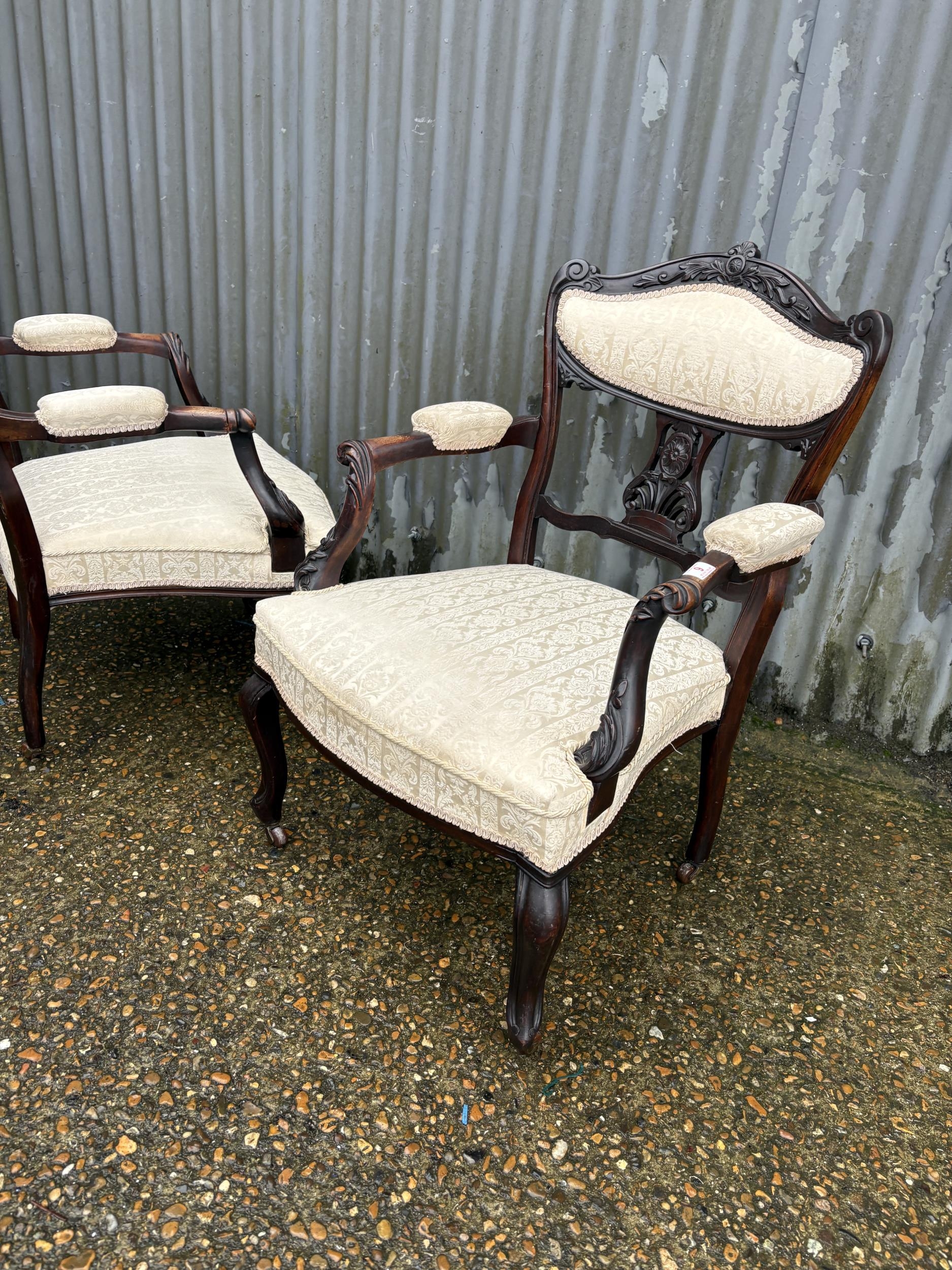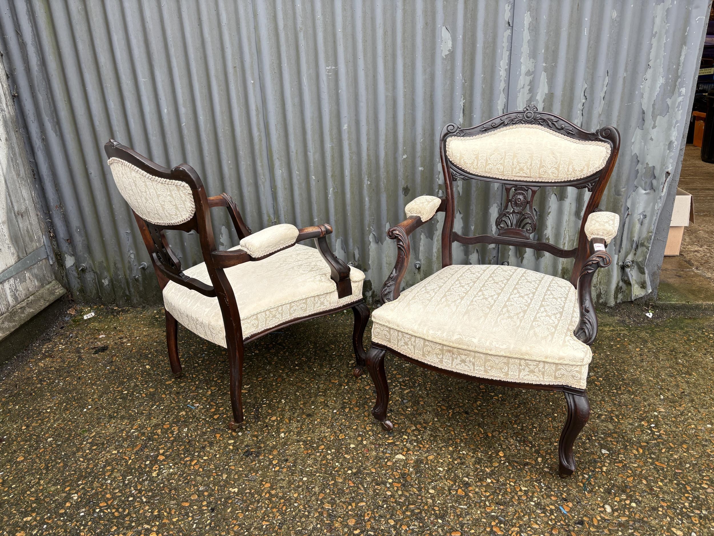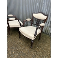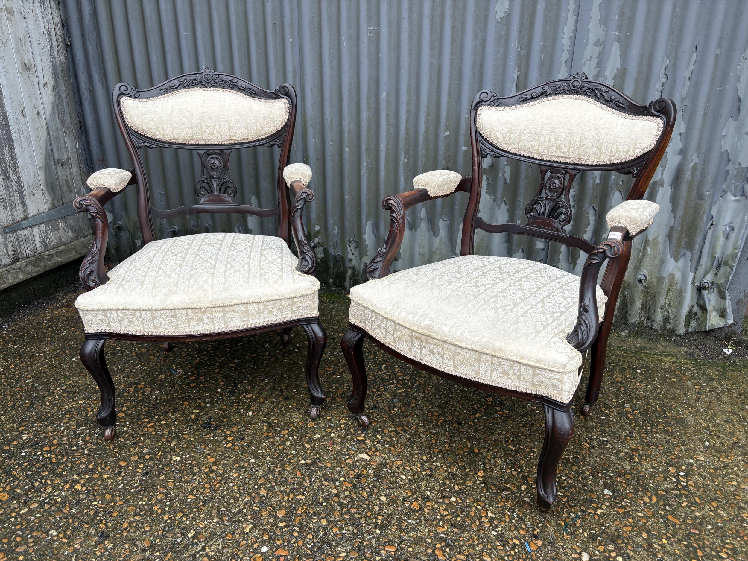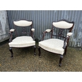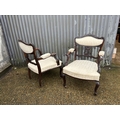 A pair of Edwardian mahogany framed salon armchairs with white upholstery