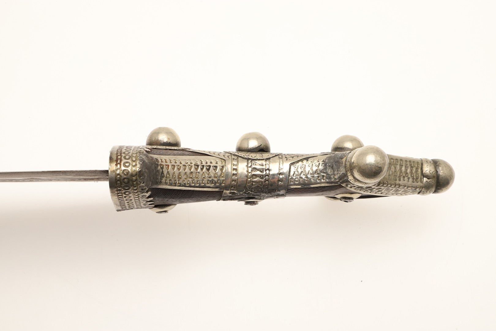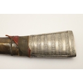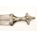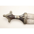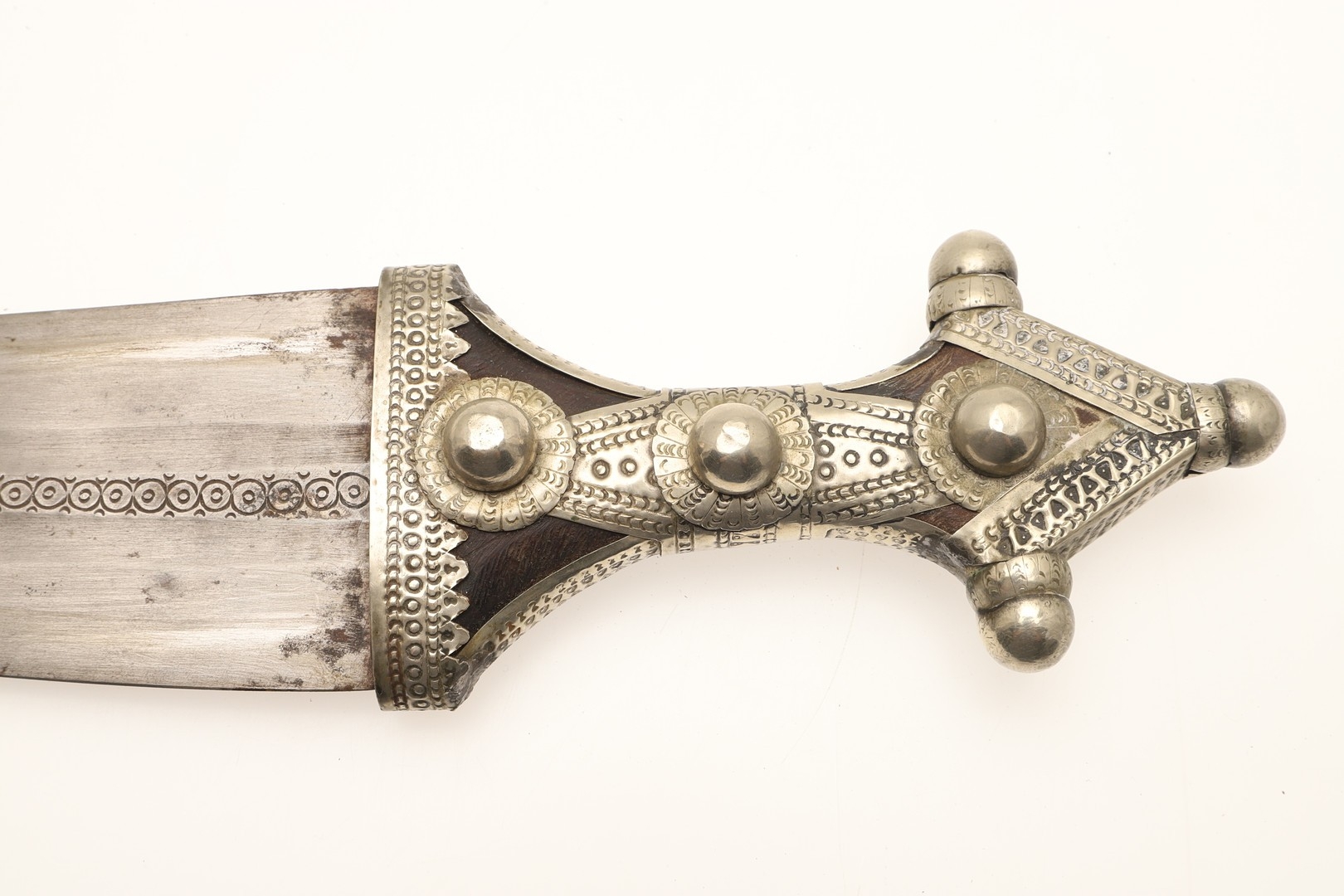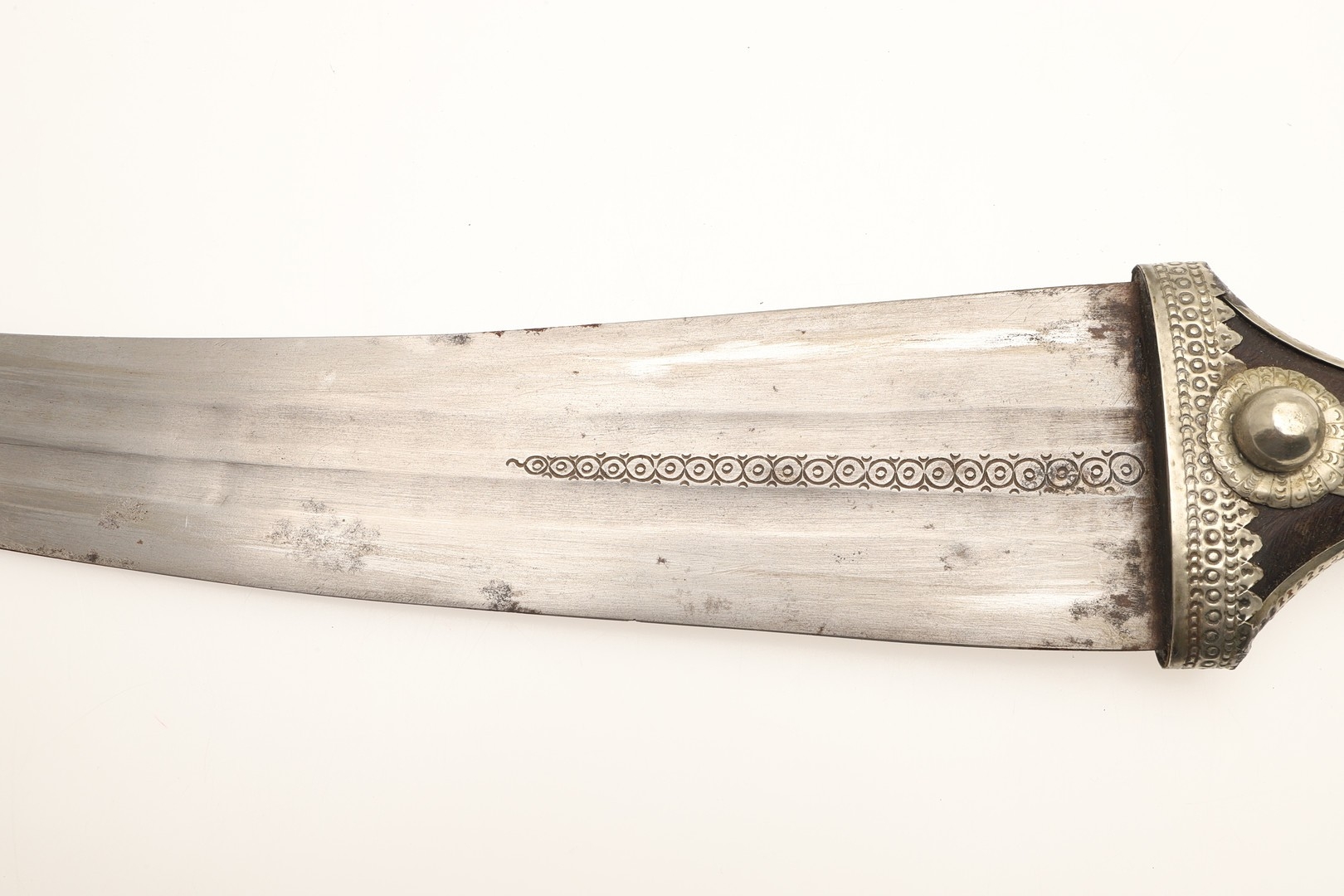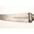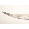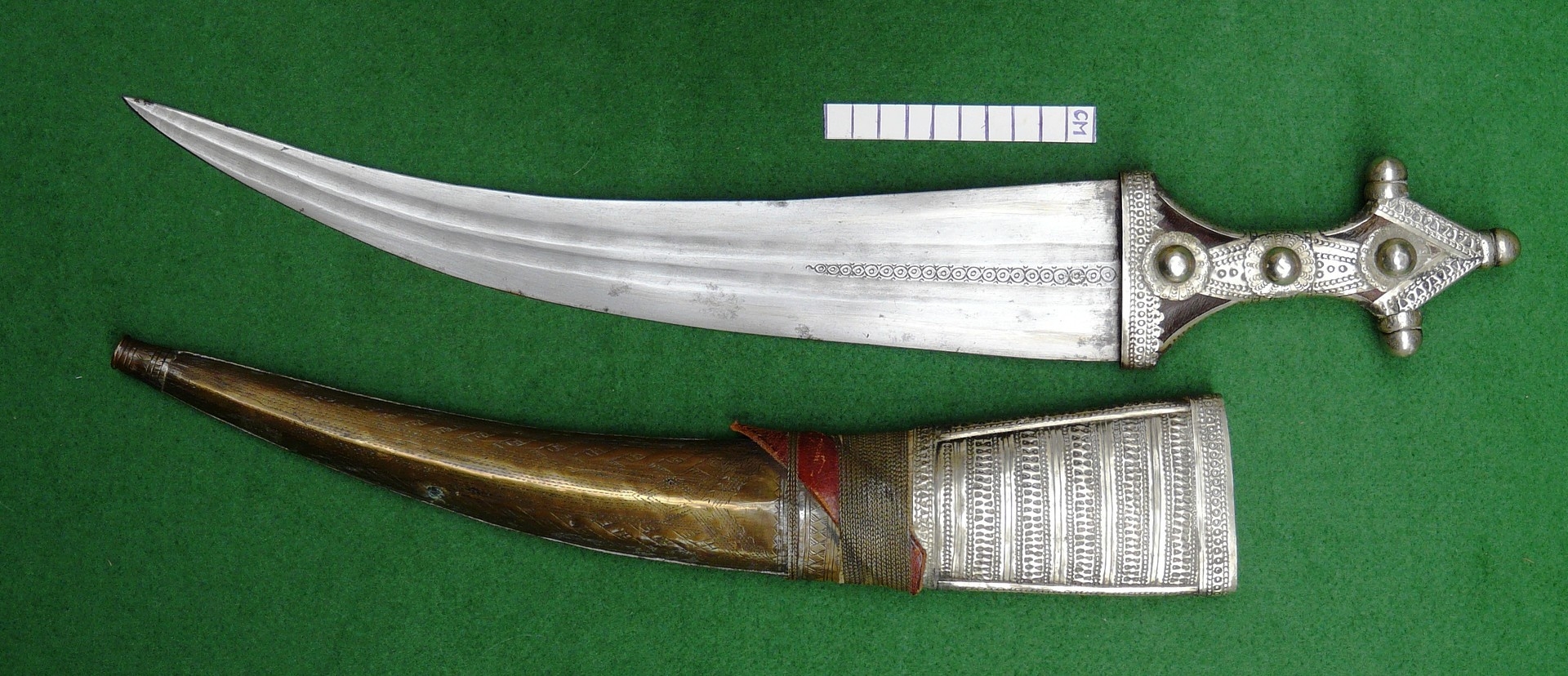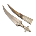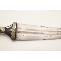 A FINE LONG BLADED JANBIYYA AND SCABBARD. A Janbiyya having a 37 cm curved blade with shallow fullers and repeated circular decoration towards the hilt. The hilt and scabbard with decorated white-metal mounts and bold round-headed fixings. 55 cm. "Janbiyya originate from both Hijaz and Asir Arabia. Bani Malik and Bani Shahr are both Arabia tribes that favoured this form.