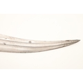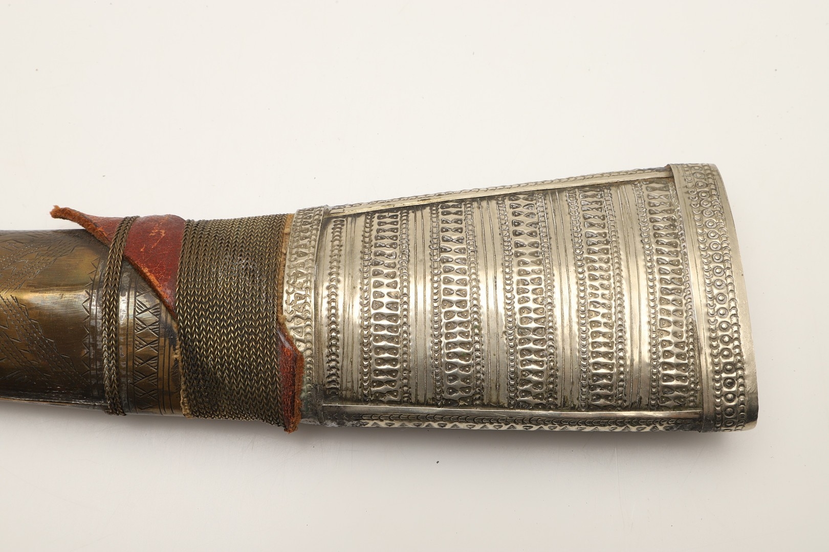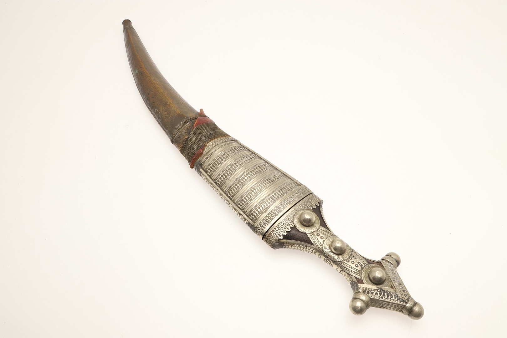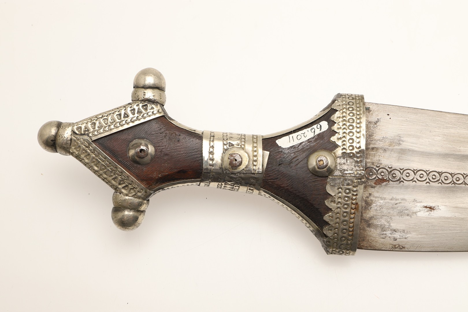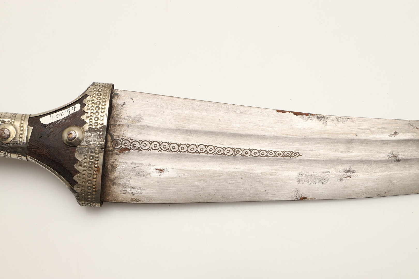 A FINE LONG BLADED JANBIYYA AND SCABBARD. A Janbiyya having a 37 cm curved blade with shallow fullers and repeated circular decoration towards the hilt. The hilt and scabbard with decorated white-metal mounts and bold round-headed fixings. 55 cm. "Janbiyya originate from both Hijaz and Asir Arabia. Bani Malik and Bani Shahr are both Arabia tribes that favoured this form.