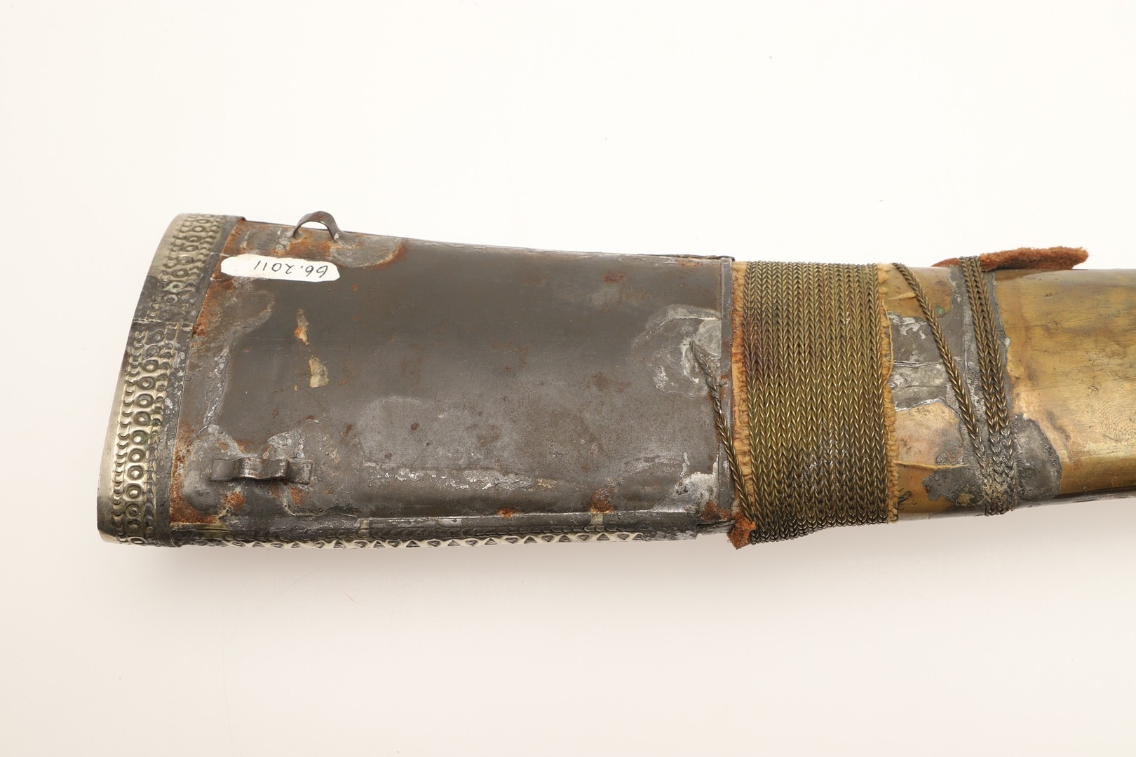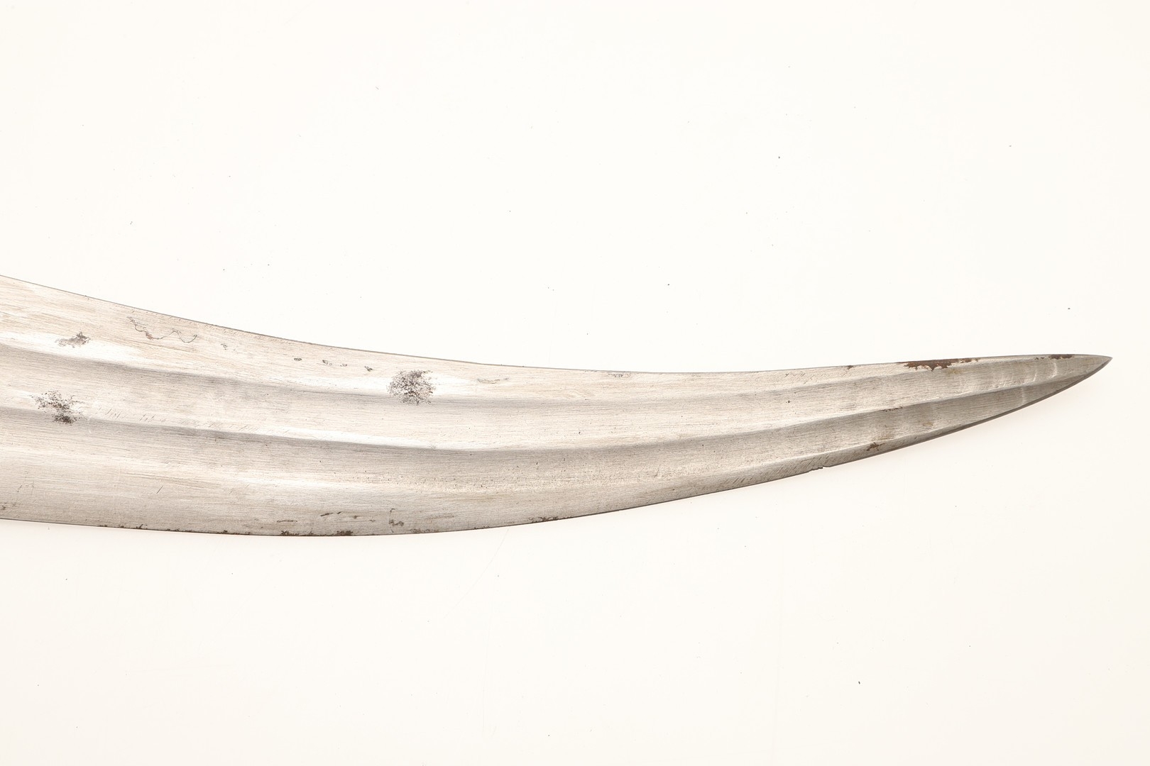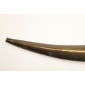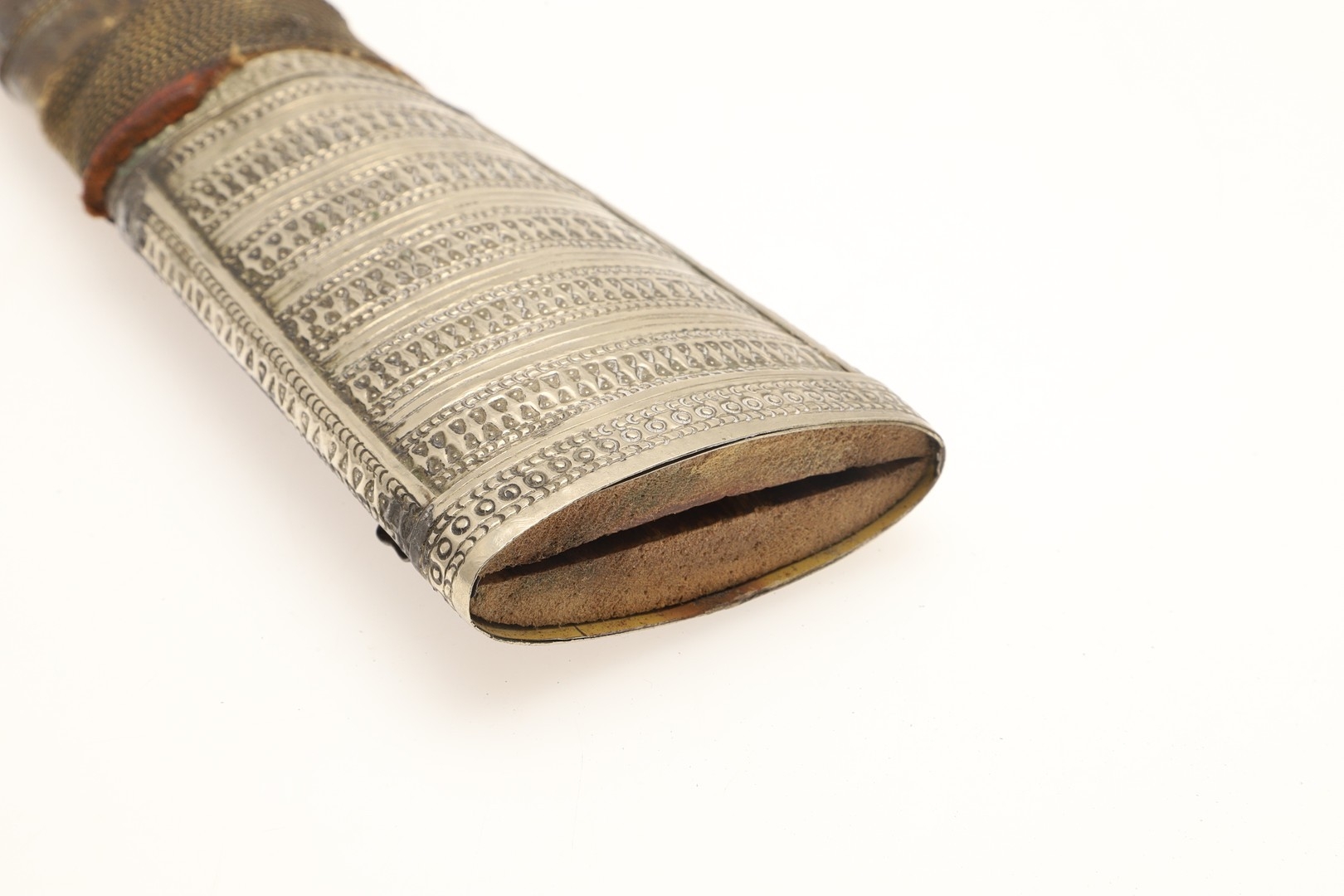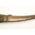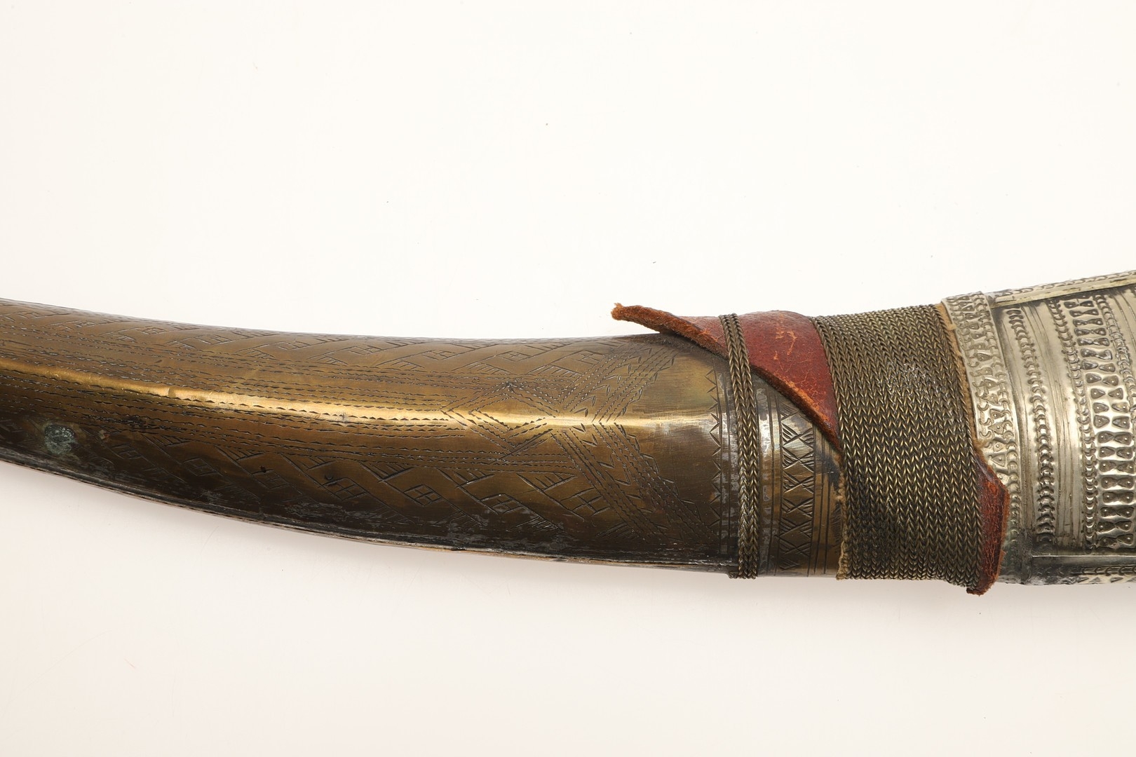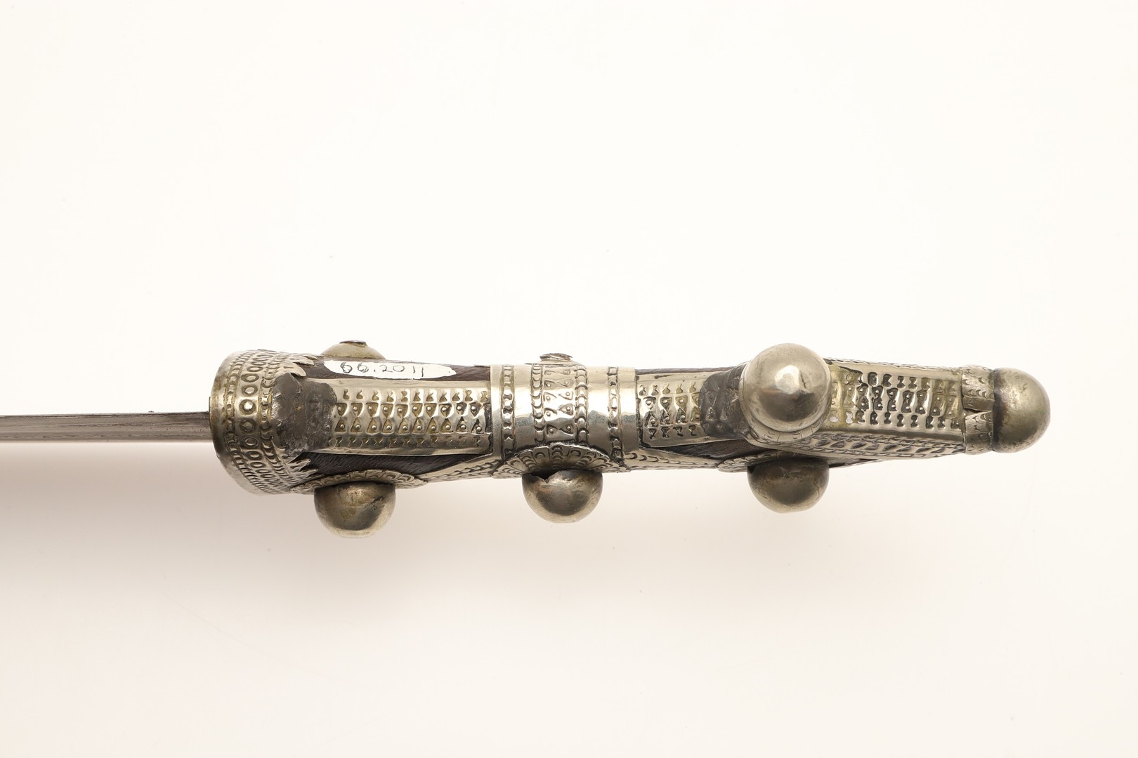 A FINE LONG BLADED JANBIYYA AND SCABBARD. A Janbiyya having a 37 cm curved blade with shallow fullers and repeated circular decoration towards the hilt. The hilt and scabbard with decorated white-metal mounts and bold round-headed fixings. 55 cm. "Janbiyya originate from both Hijaz and Asir Arabia. Bani Malik and Bani Shahr are both Arabia tribes that favoured this form.