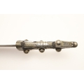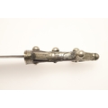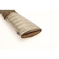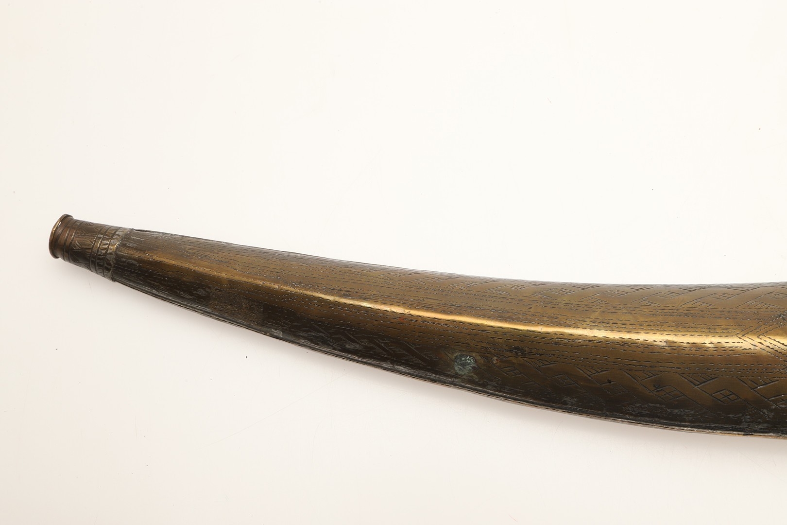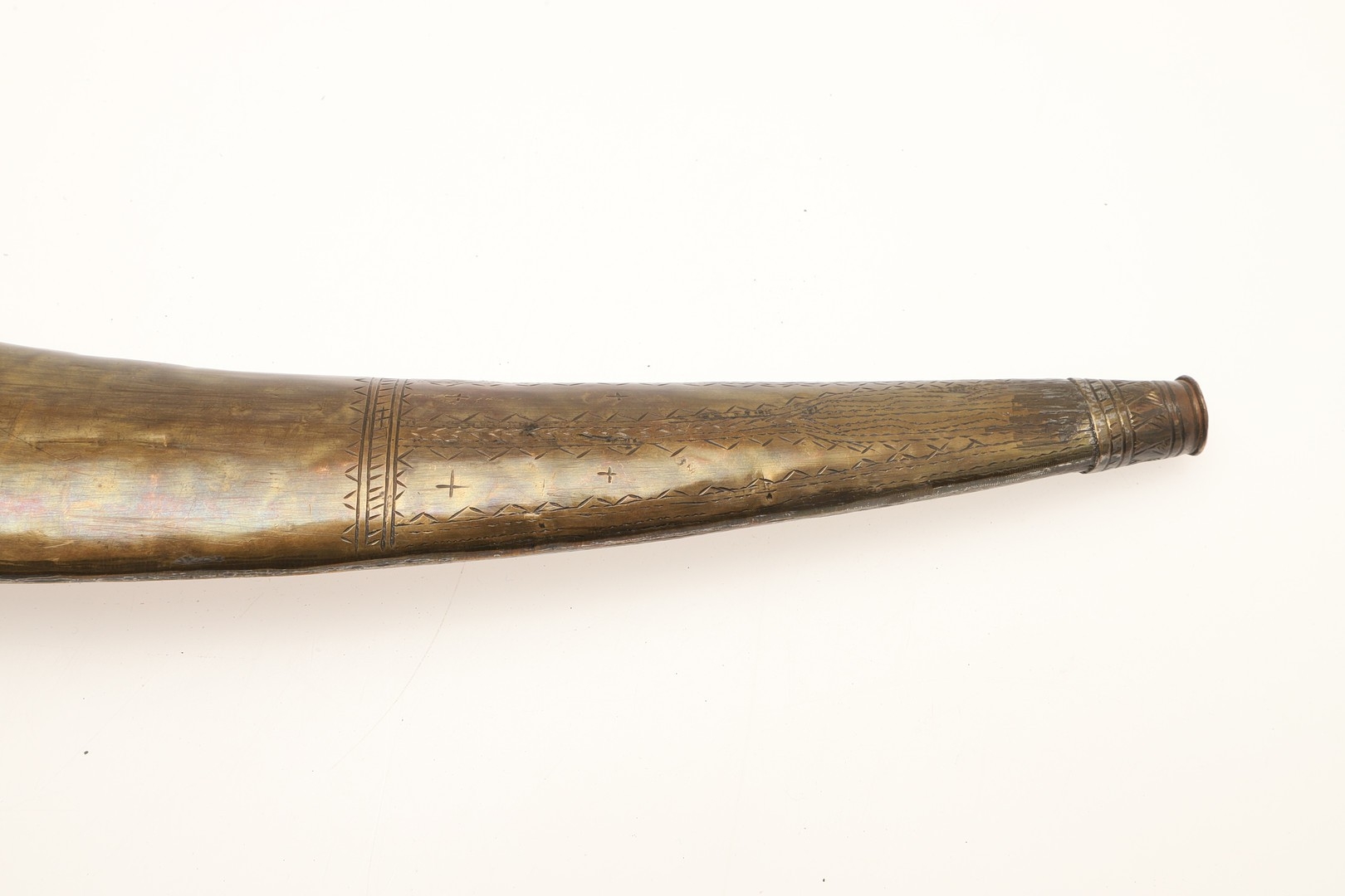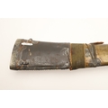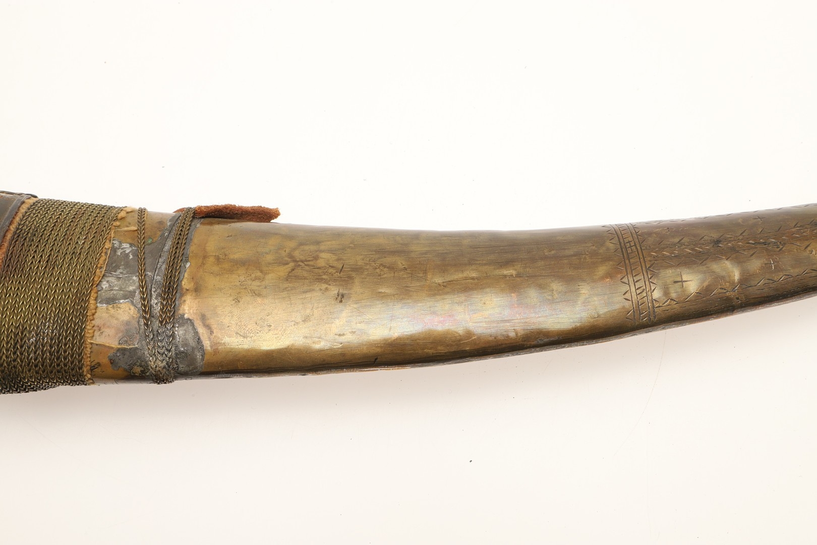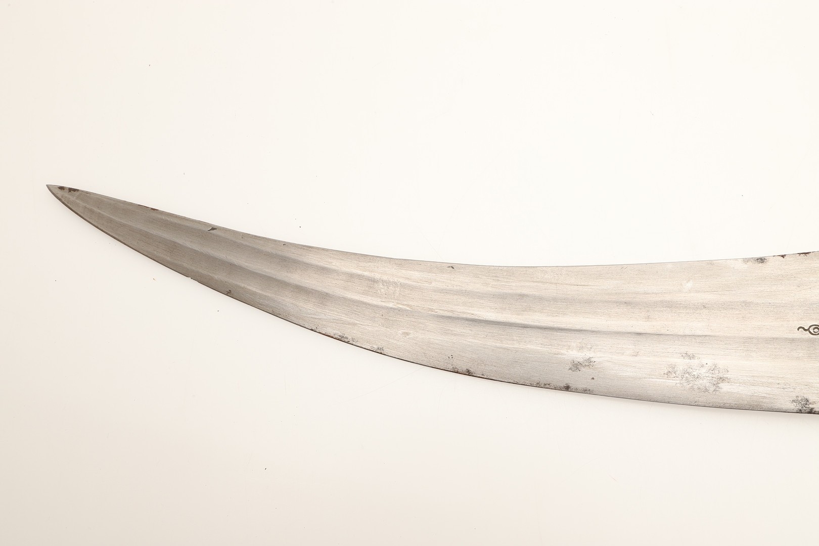 A FINE LONG BLADED JANBIYYA AND SCABBARD. A Janbiyya having a 37 cm curved blade with shallow fullers and repeated circular decoration towards the hilt. The hilt and scabbard with decorated white-metal mounts and bold round-headed fixings. 55 cm. "Janbiyya originate from both Hijaz and Asir Arabia. Bani Malik and Bani Shahr are both Arabia tribes that favoured this form.