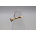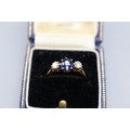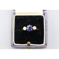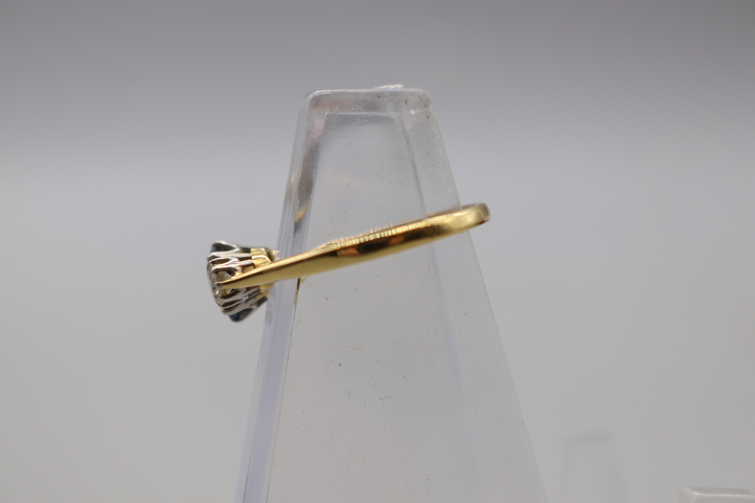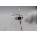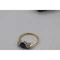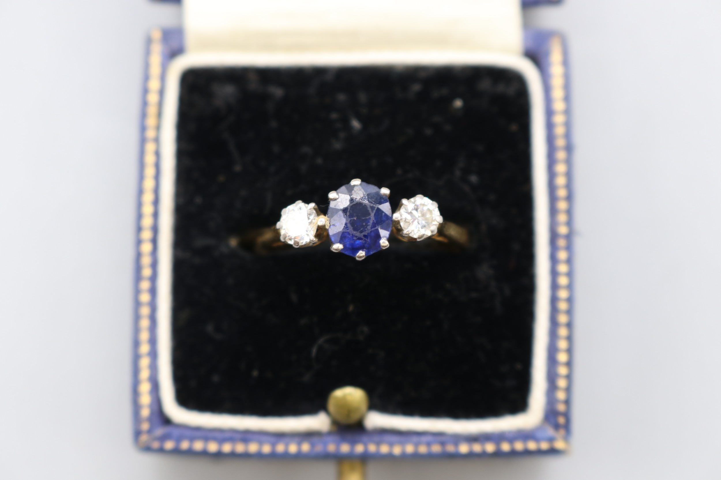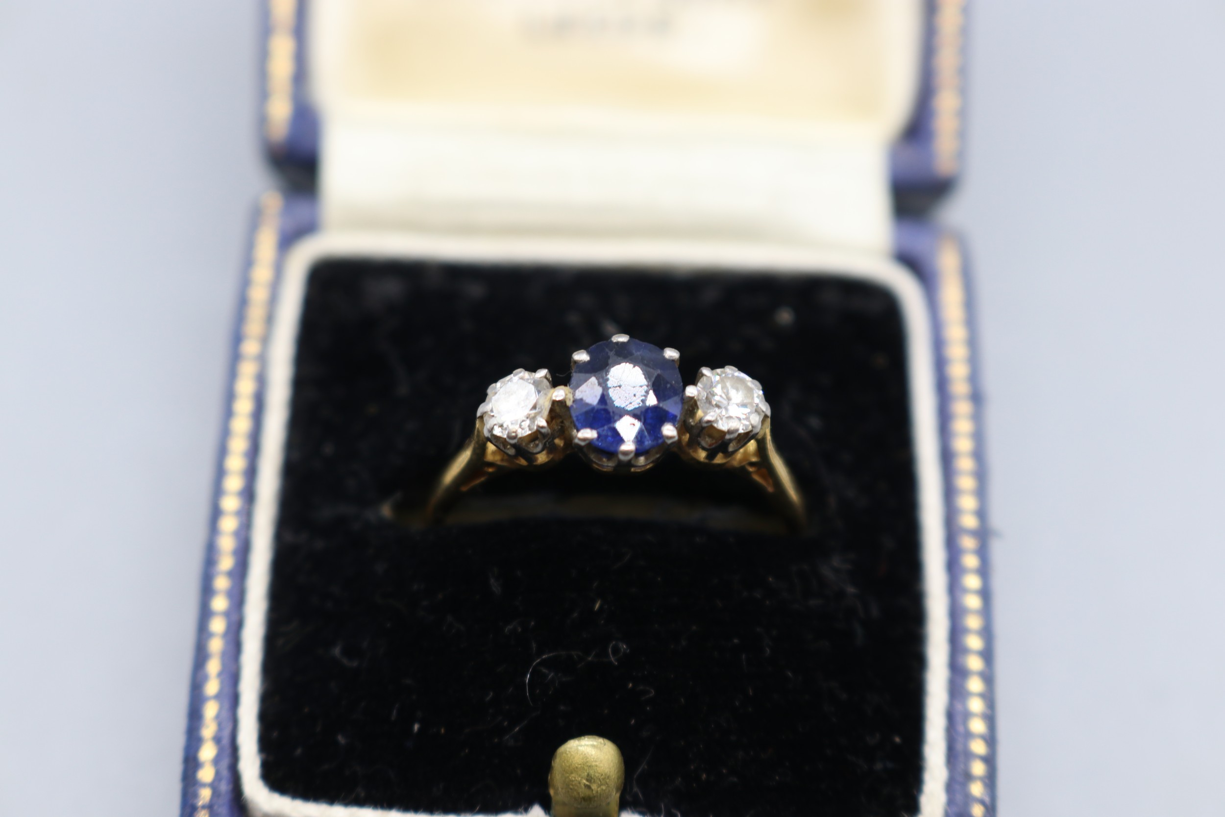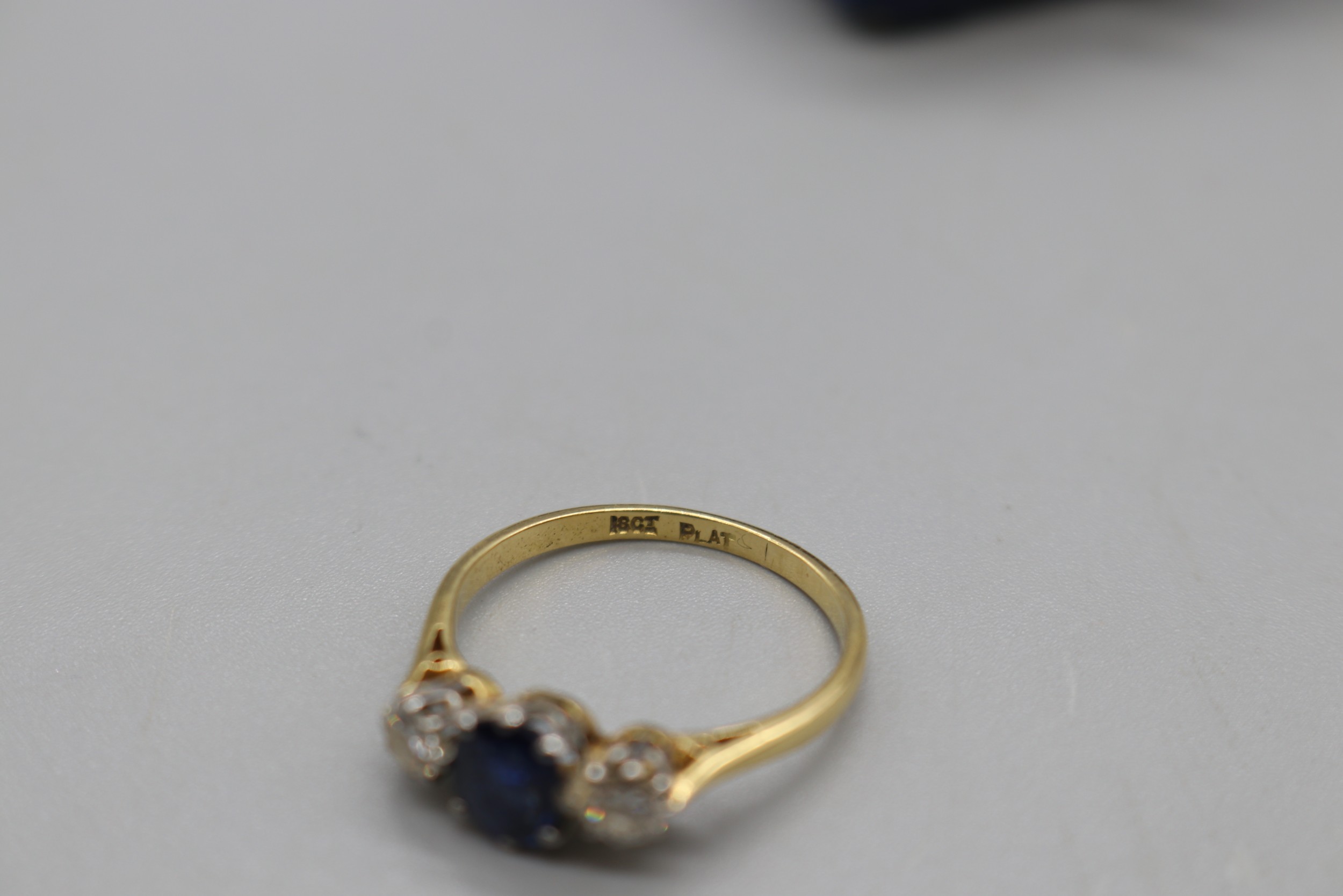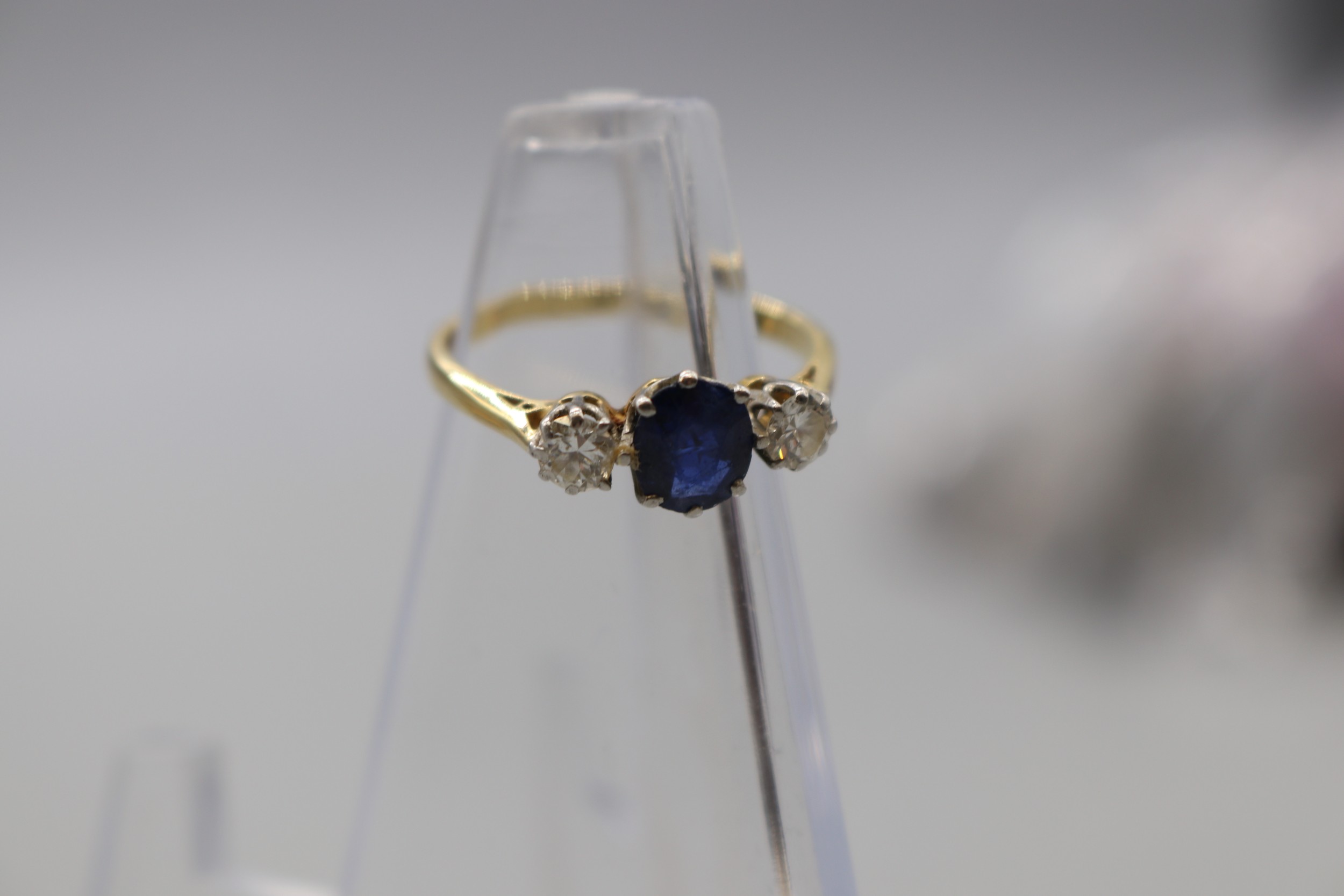 Stamped 18ct yellow gold sapphire and diamond trilogy ring with platinum head, set with a central oval faceted blue sapphire and two round brilliant cut diamonds to either side. Weight 2.56g, size O