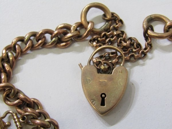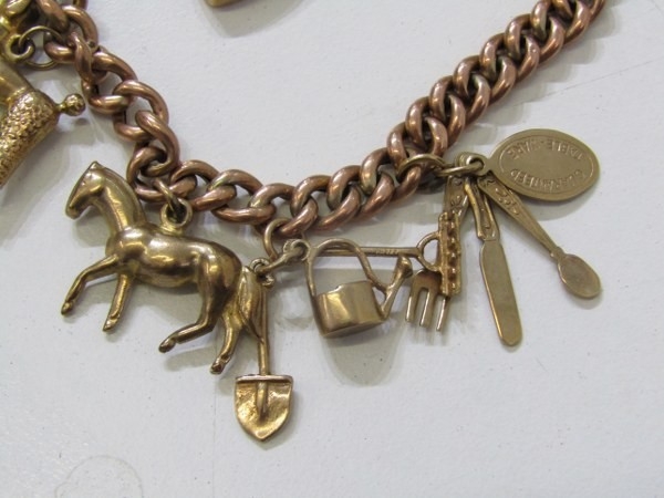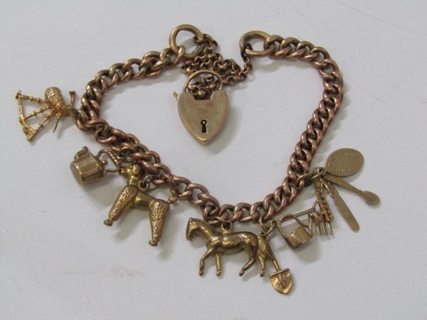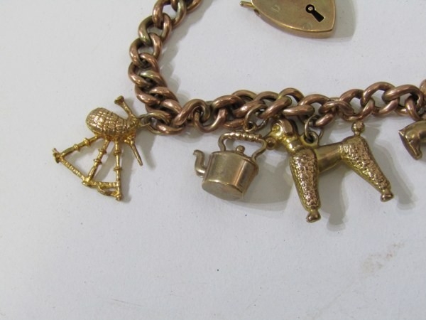 GOLD CHARM BRACELET, 9ct yellow gold charm bracelet with padlock clasp, charms including a poodle, horse, bagpipes, etc, 19.6 grams