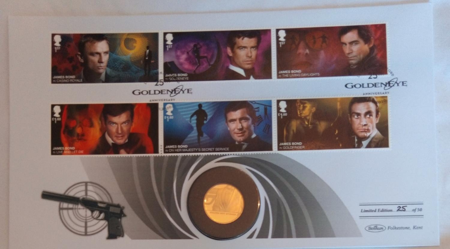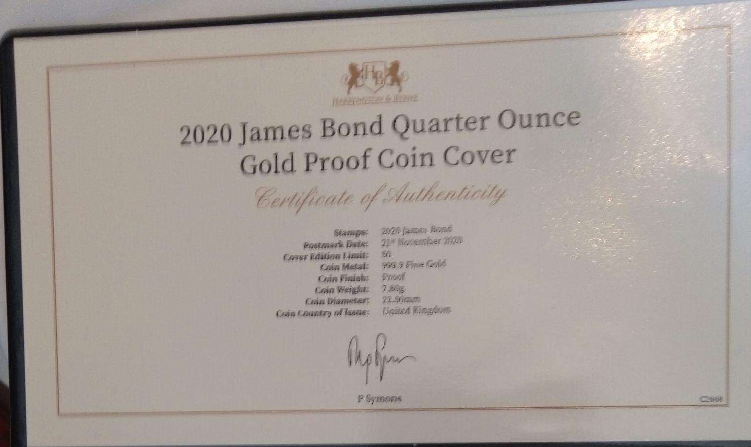 A 24CT GOLD 1/4OZ JAMES BOND PROOF COIN COVER, DATED 2020