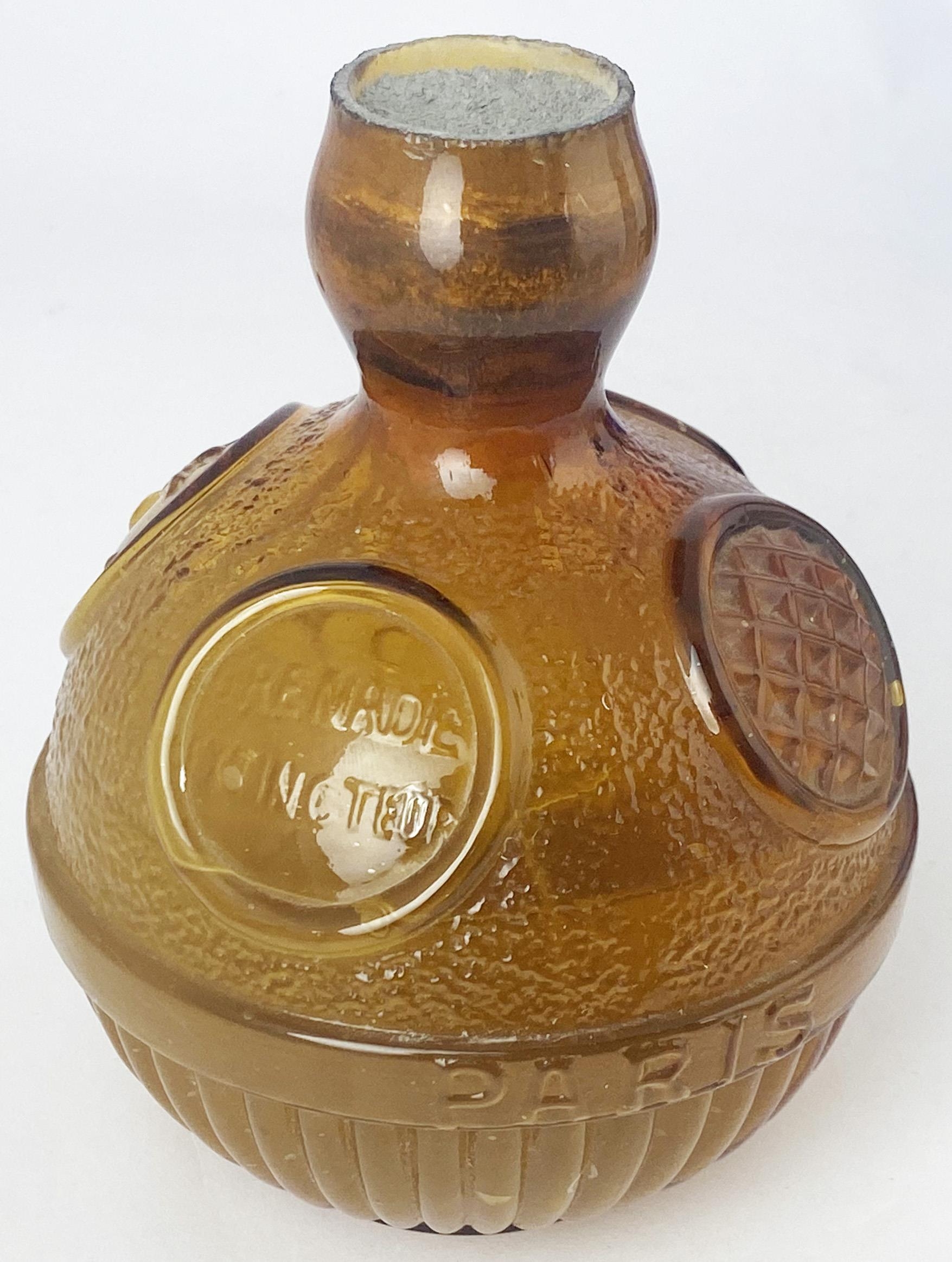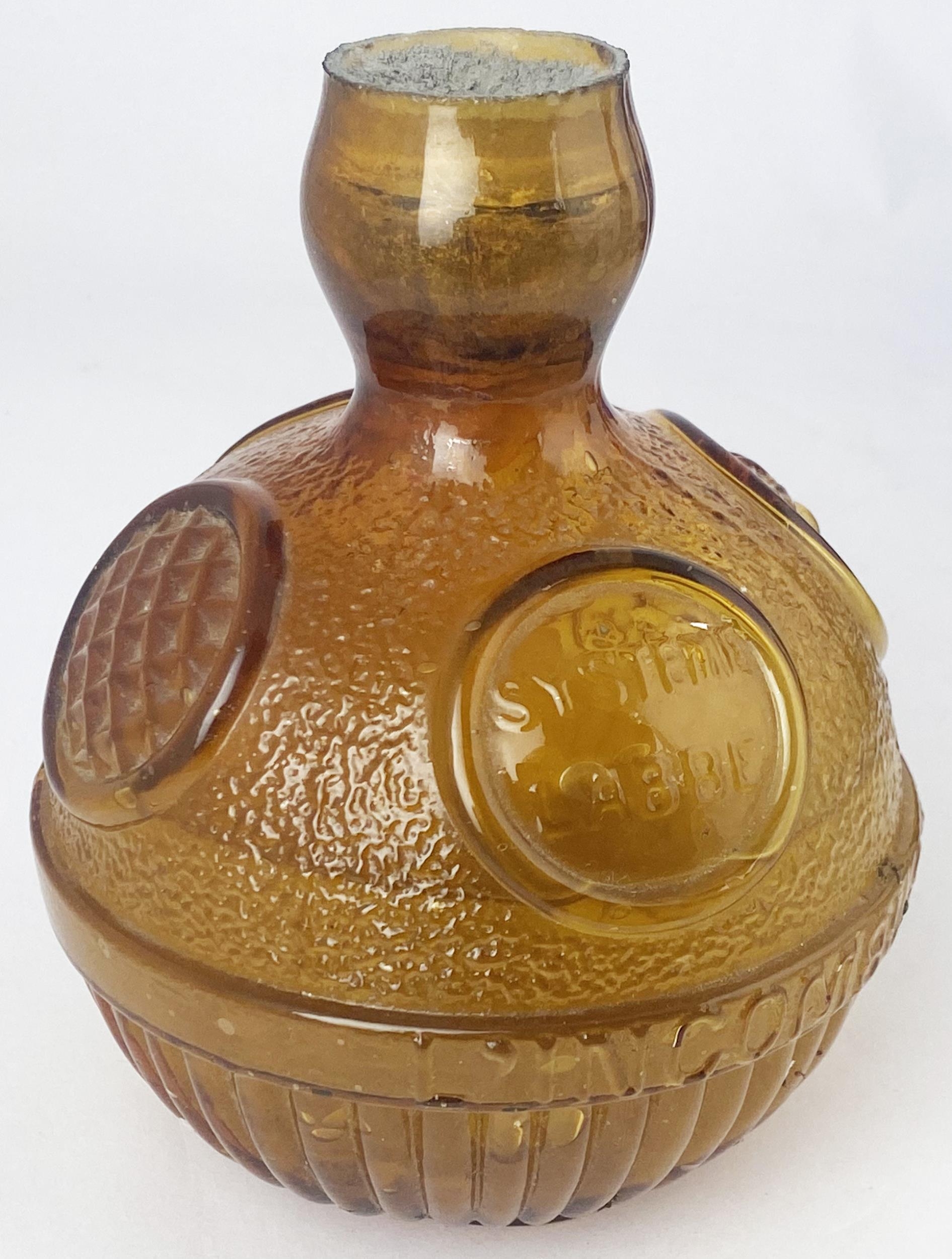 SYSTEM LABBE FIRE GRENADE.. 5.75ins tall. Light amber glass. Embossed centre band INCOMBUSTIBILITE/ PARIS. Four embossed raised round panels above centre band one embossed SYSTEME LABBE, another GRENADE/ EXTINGTEUR. Vertical ribbing to bottom half, top area stippled. Complete with sealed contents. A fine example/ survivor. Slight internal residue