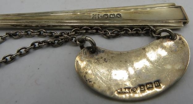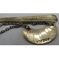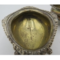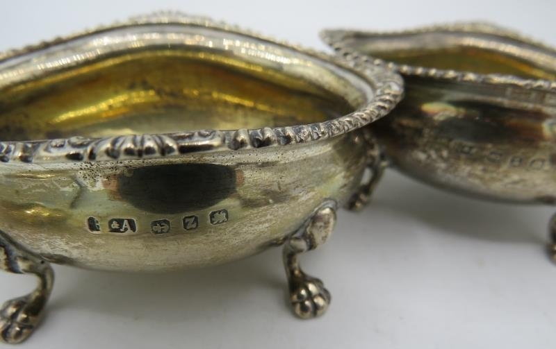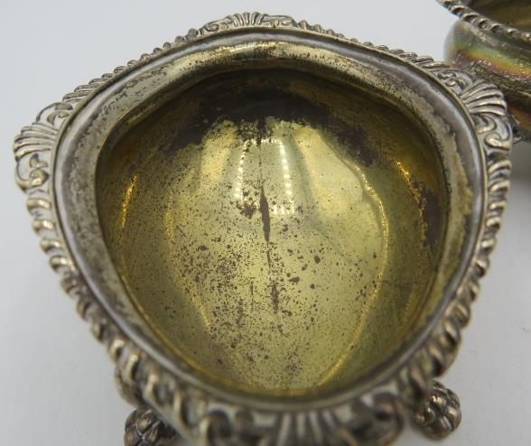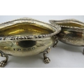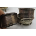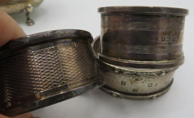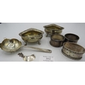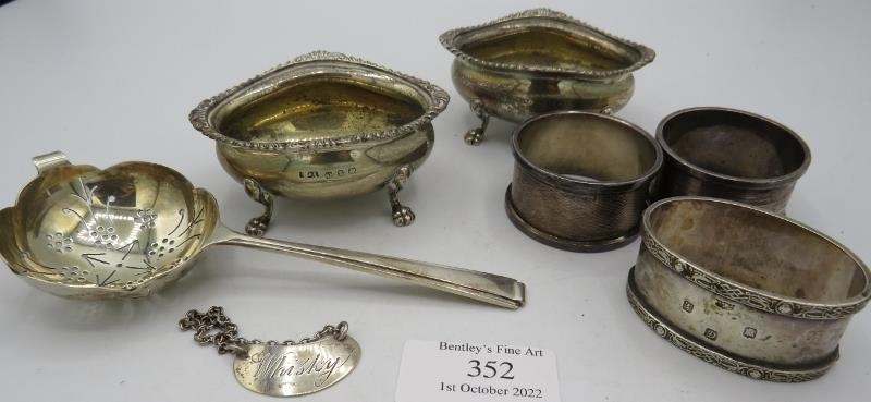 A pair of silver salts with cast lions paw feet. Birmingham 1899, a silver tea strainer, Sheffield 1965. A small silver Whisky label. Birmingham 1912 and three silver napkin rings all fully hallmarked, 7.5 troy oz/235 grams.