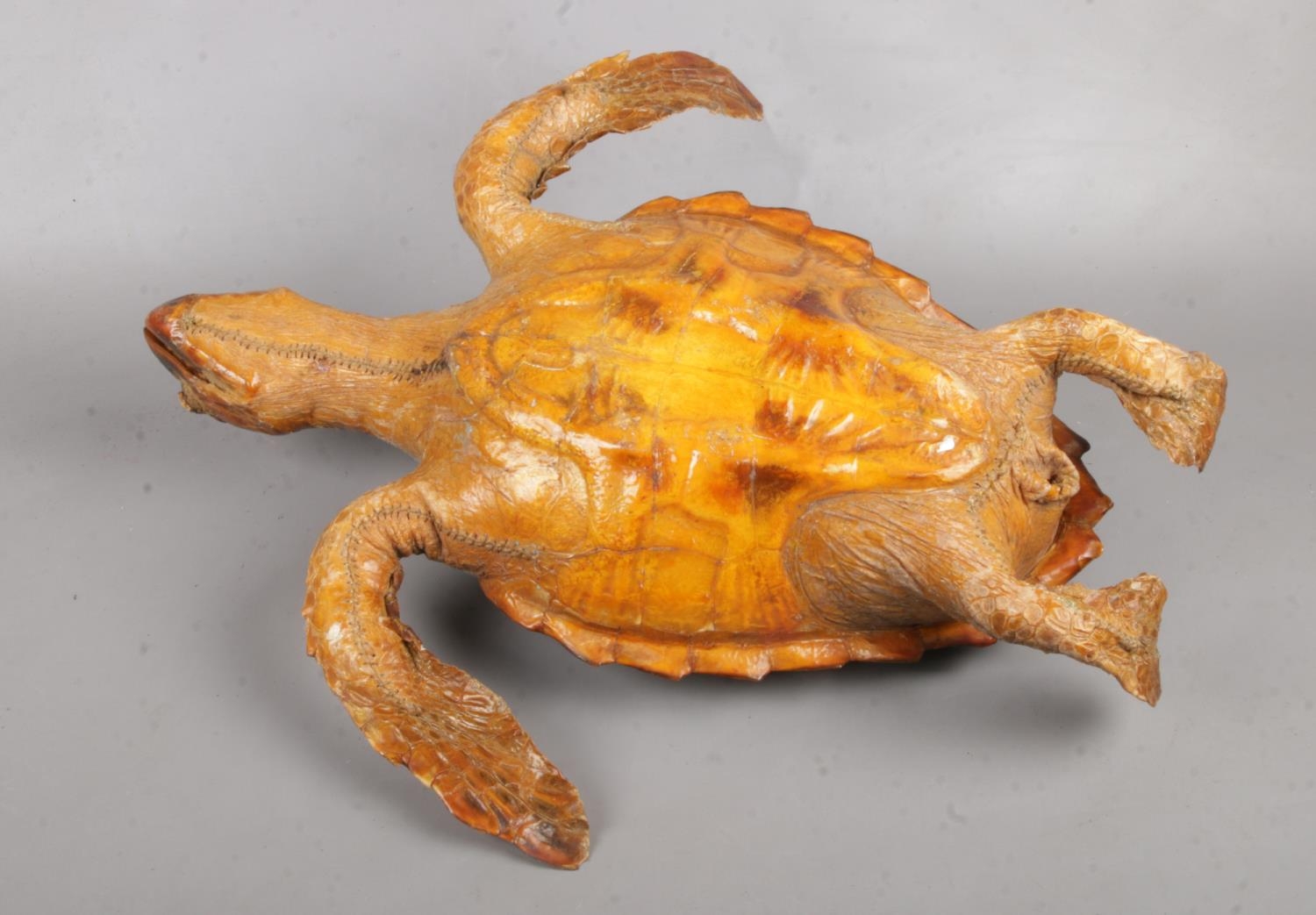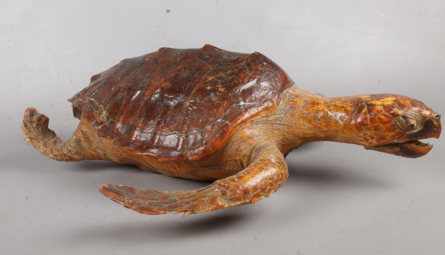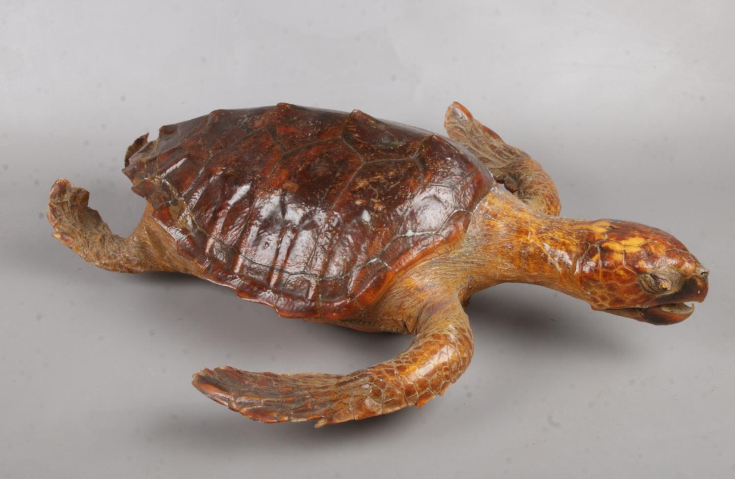 An antique taxidermy sea turtle. In swimming pose, 57cm length, 33cm width.