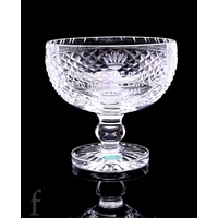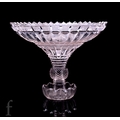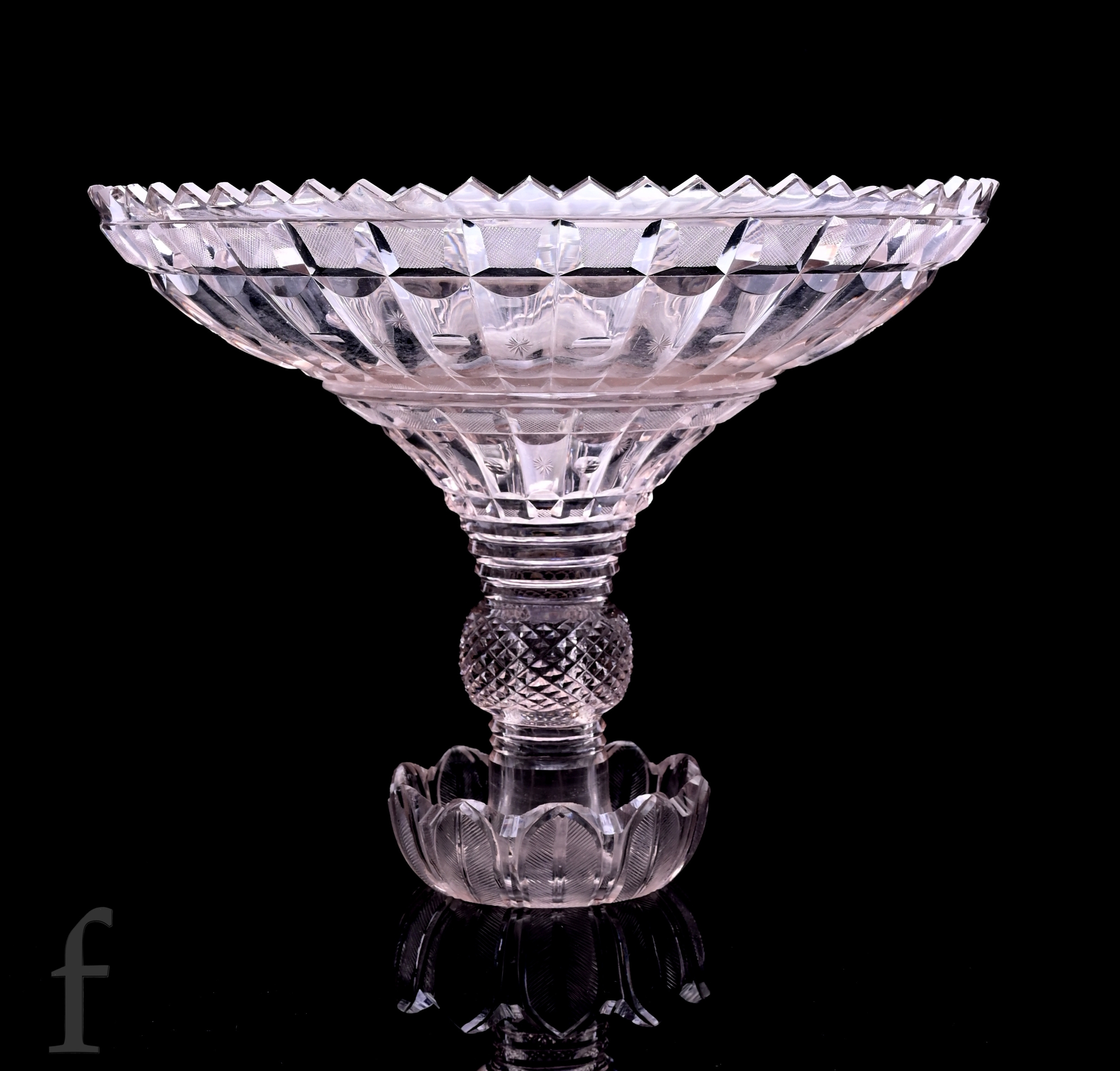 A large late Regency to William IV two piece table centre comport in the manner of John Blades, the shallow circular bowl with a cut chevron rim and panel cut body with fine secondary cutting, mounted to a pedestal stem with roll stiff leaf collar strawberry diamond cut knop and splayed base with matched decoration to the upper bowl, height 27cm by 34cm across, minor damage.