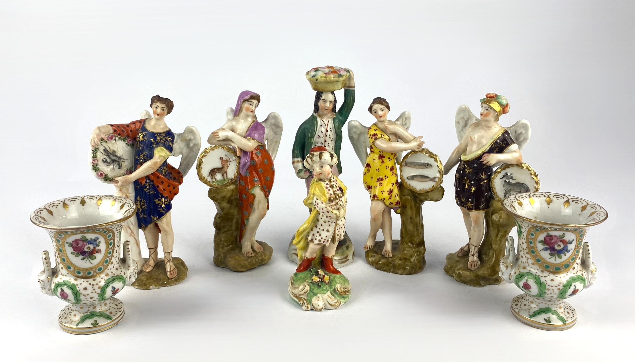 A pair of 19th century porcelain miniature models of urns with floral decoration and gilt embellishments, 6.5cm high, four porcelain 'Zodiac' figurines, 12.5cm, and two others (a/f)