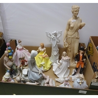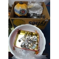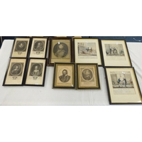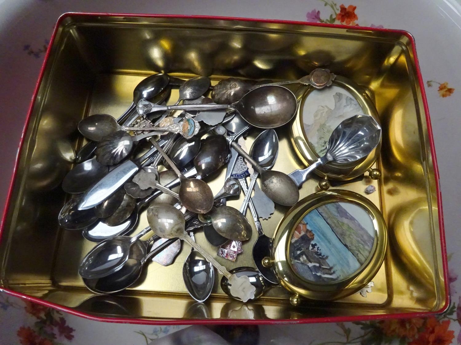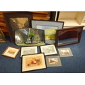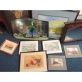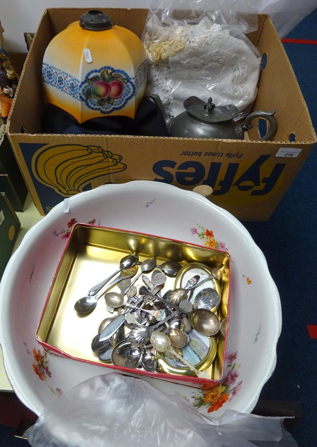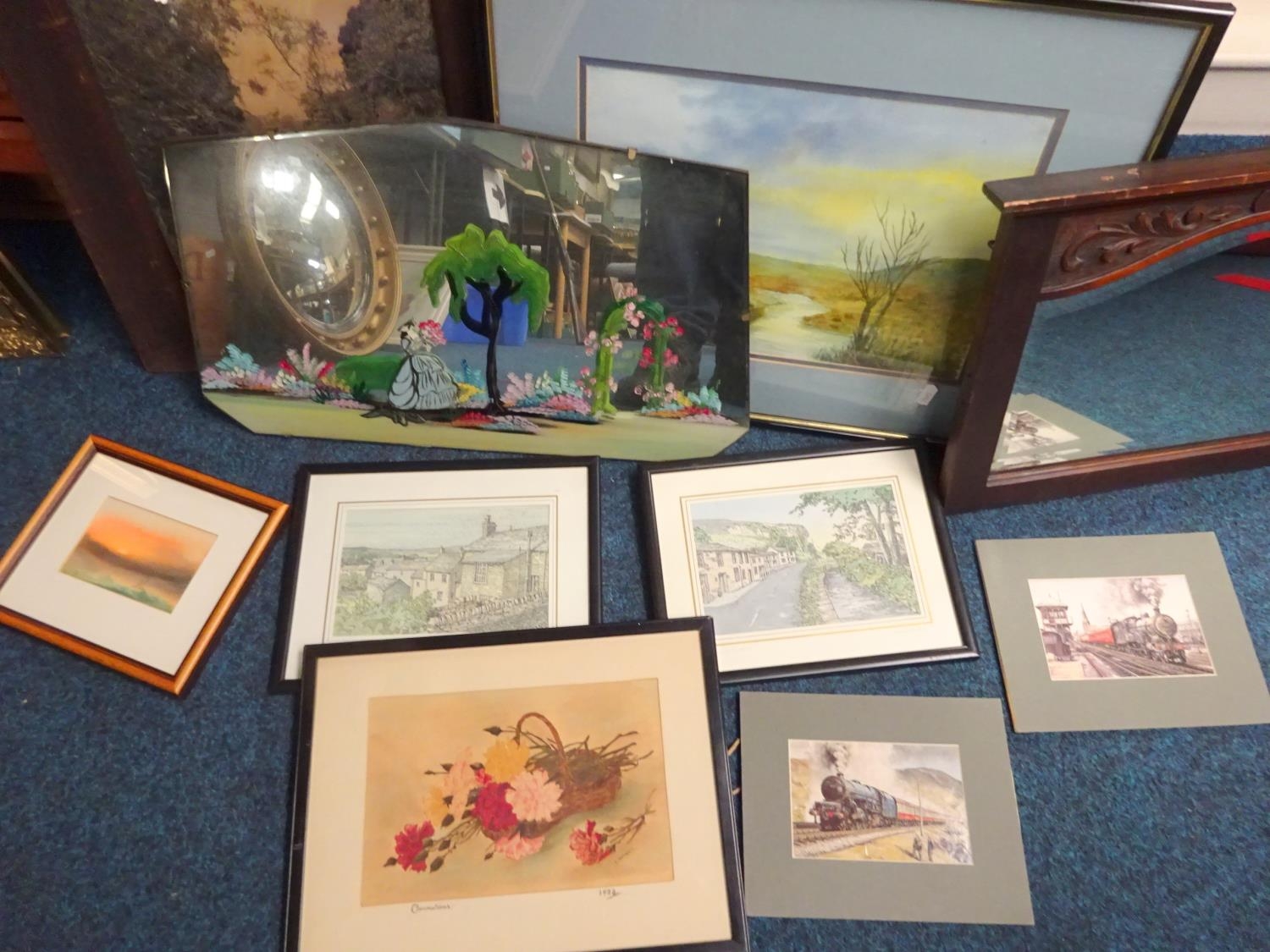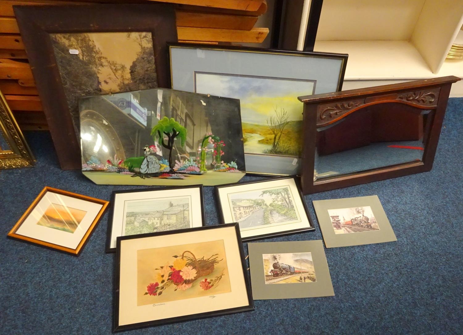 Two mirrors together with various pictures, a large floral bowl, spoons, thimbles, material, glass light shade etc.