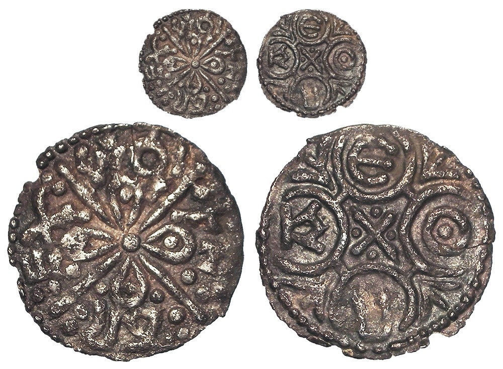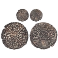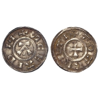 Anglo-Saxon: Offa, King of Mercia, Light Coinage silver Penny of Canterbury c.780-792, moneyer EOBA. Obv. Cross and saltire of lobes, +O FF AR EX in angles. / Rev: Moneyer's name in the angles of a Celtic cross, E O B A, with a cross and pellets at centre. Chick type 117; N.276; S.904. 1.16g. NVF with light porosity and chipping. Found Cambridgeshire.