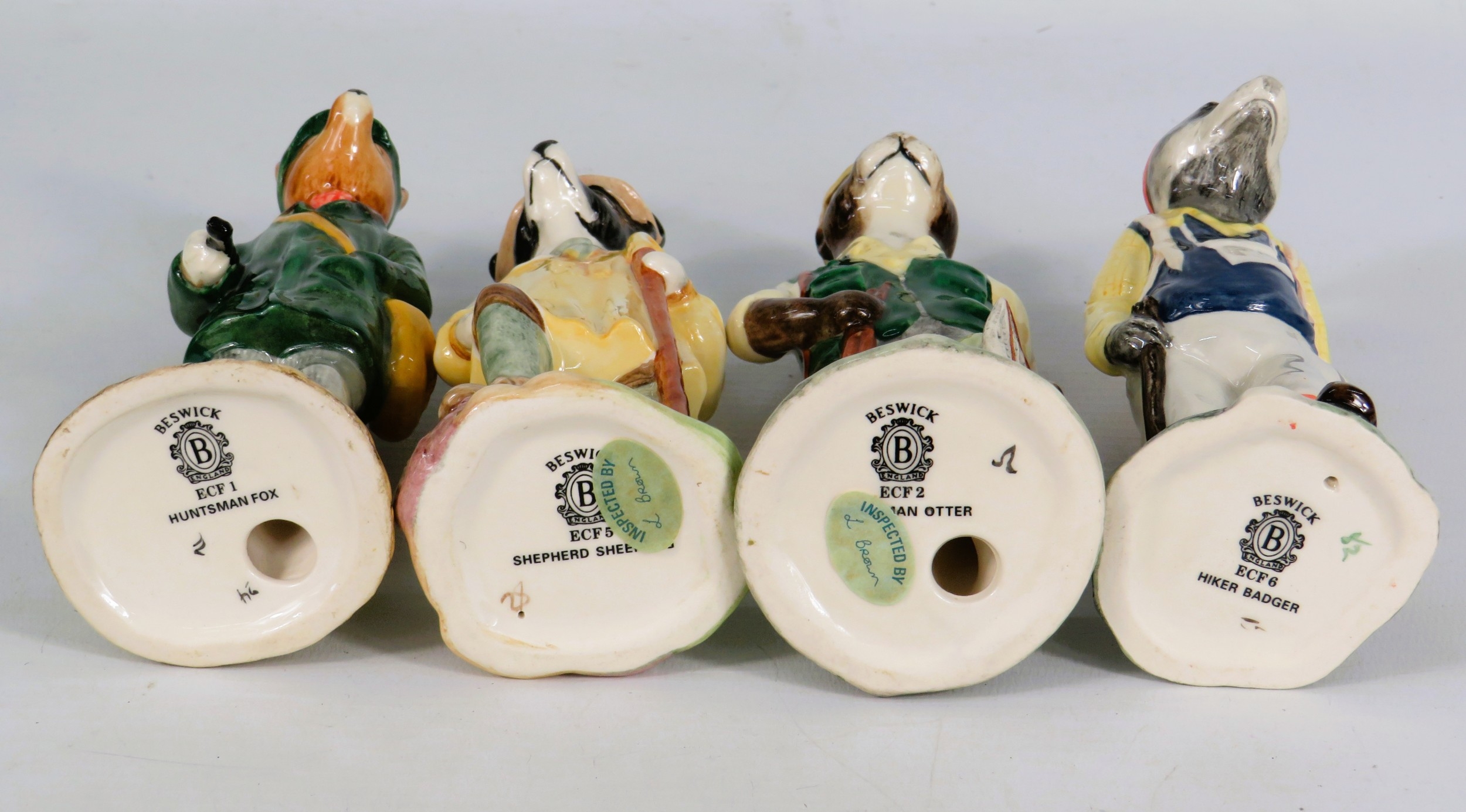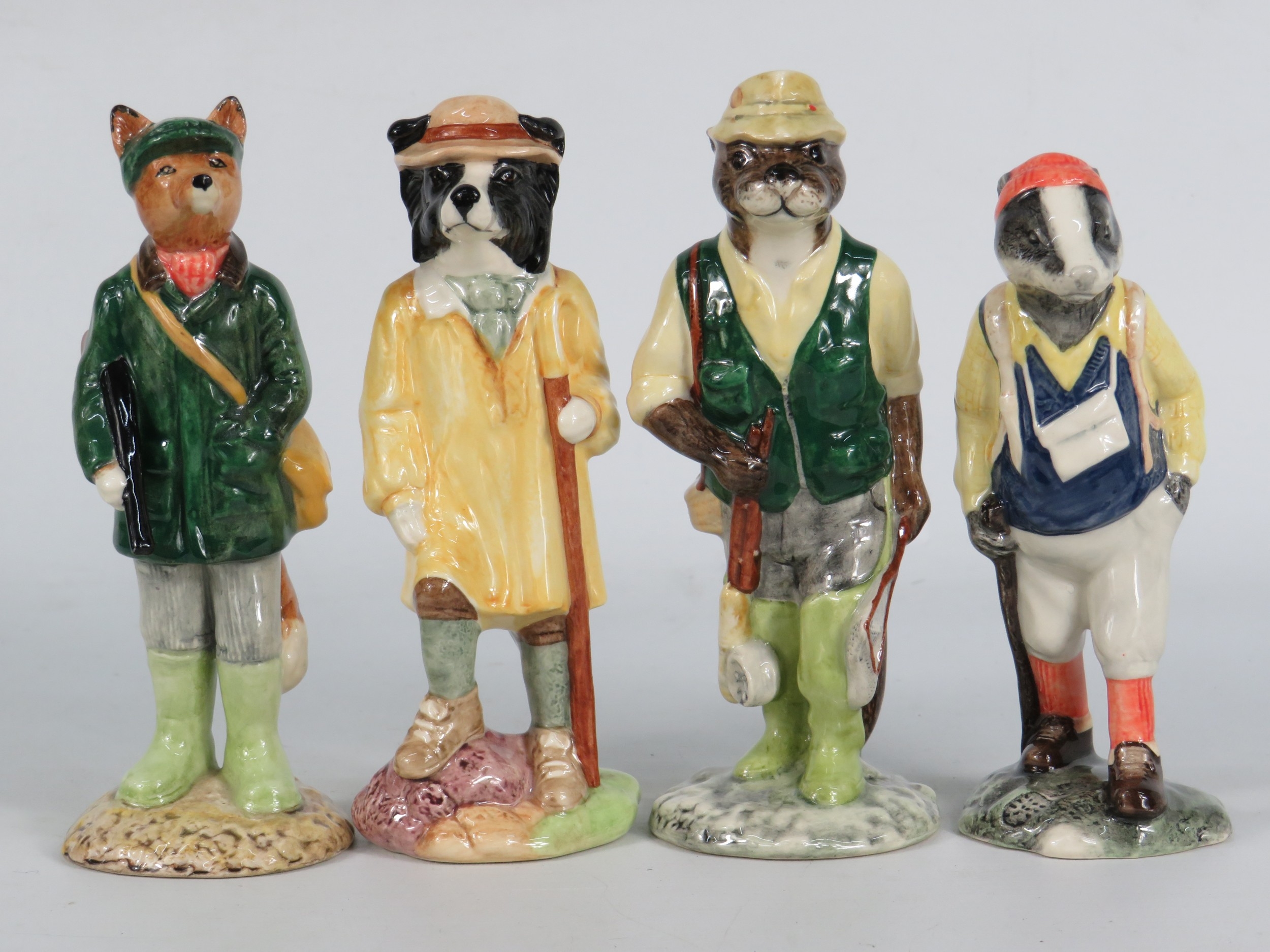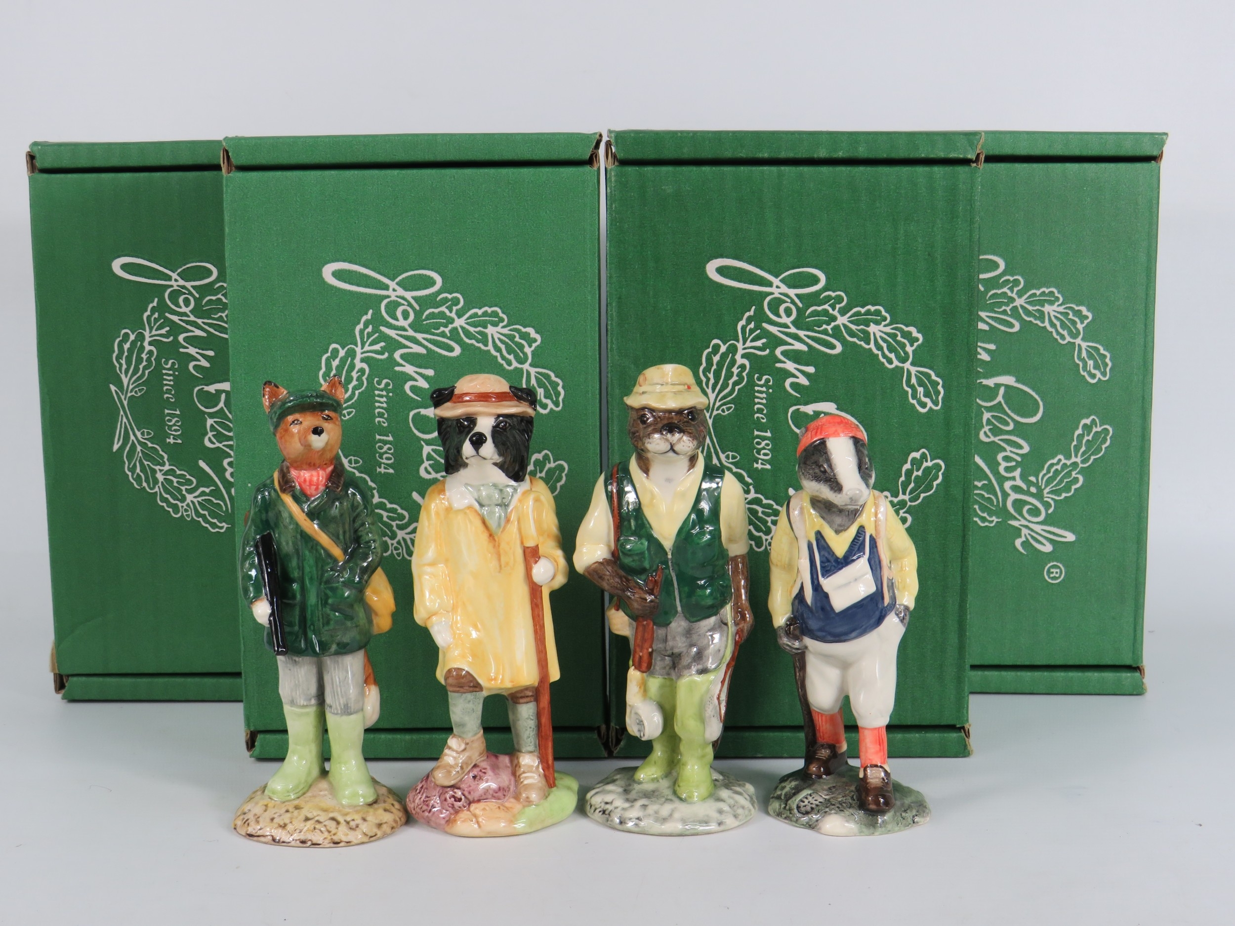 Four Beswick English Country Folk Figurines with Boxes - Shepherd Sheepdog Fisherman Otter Hiker Badger & Huntsman Fox - Height 14cm
