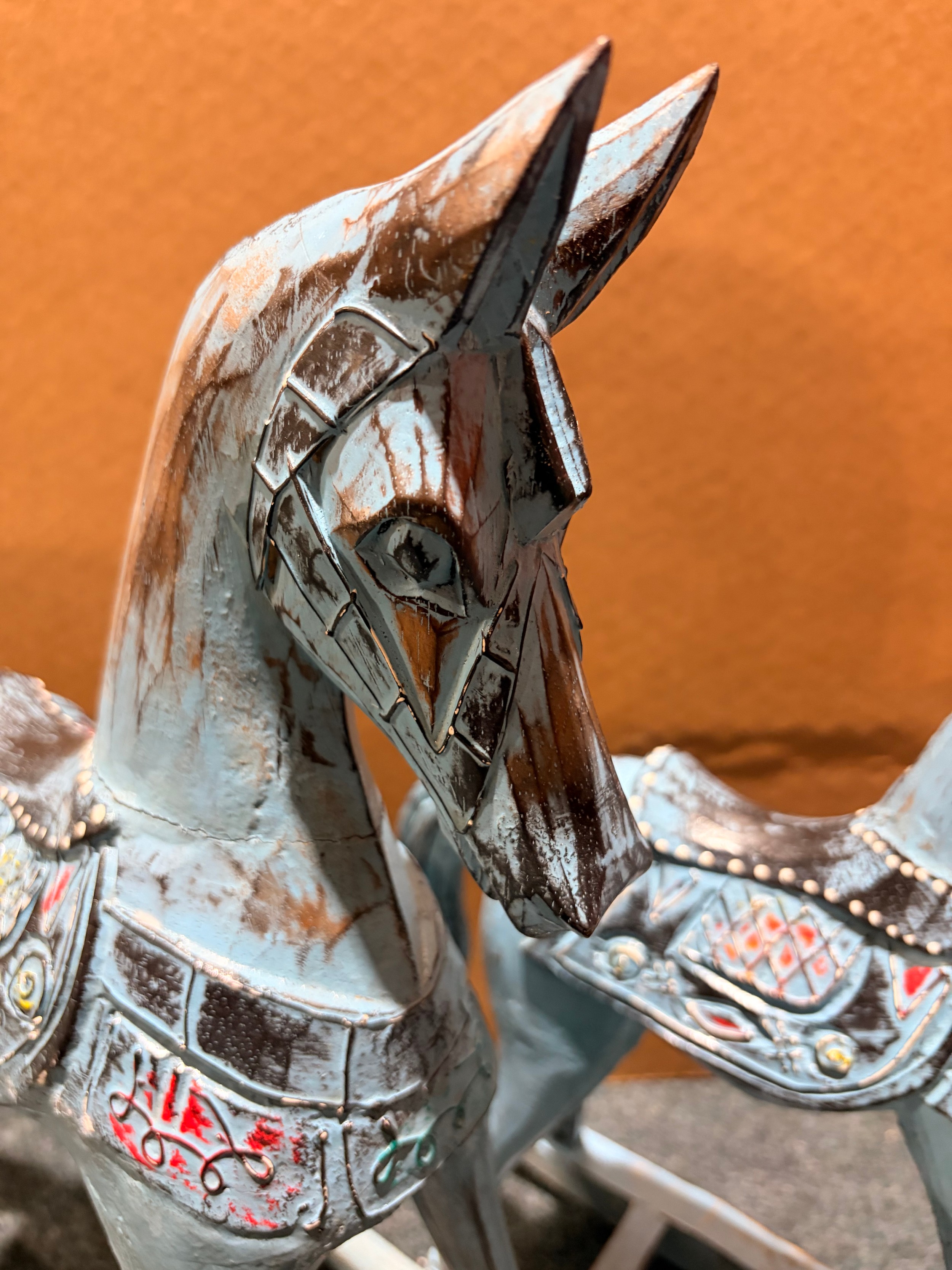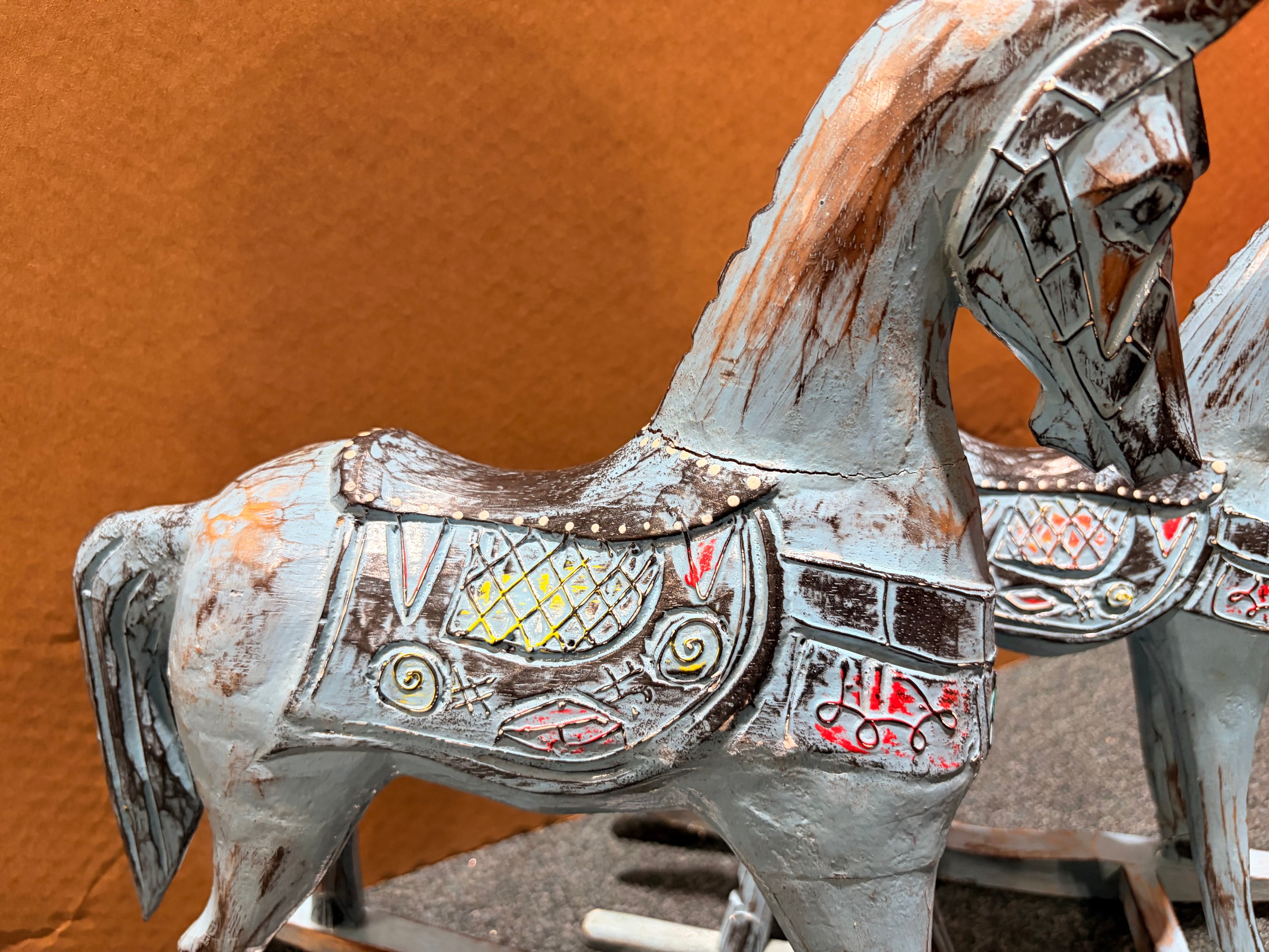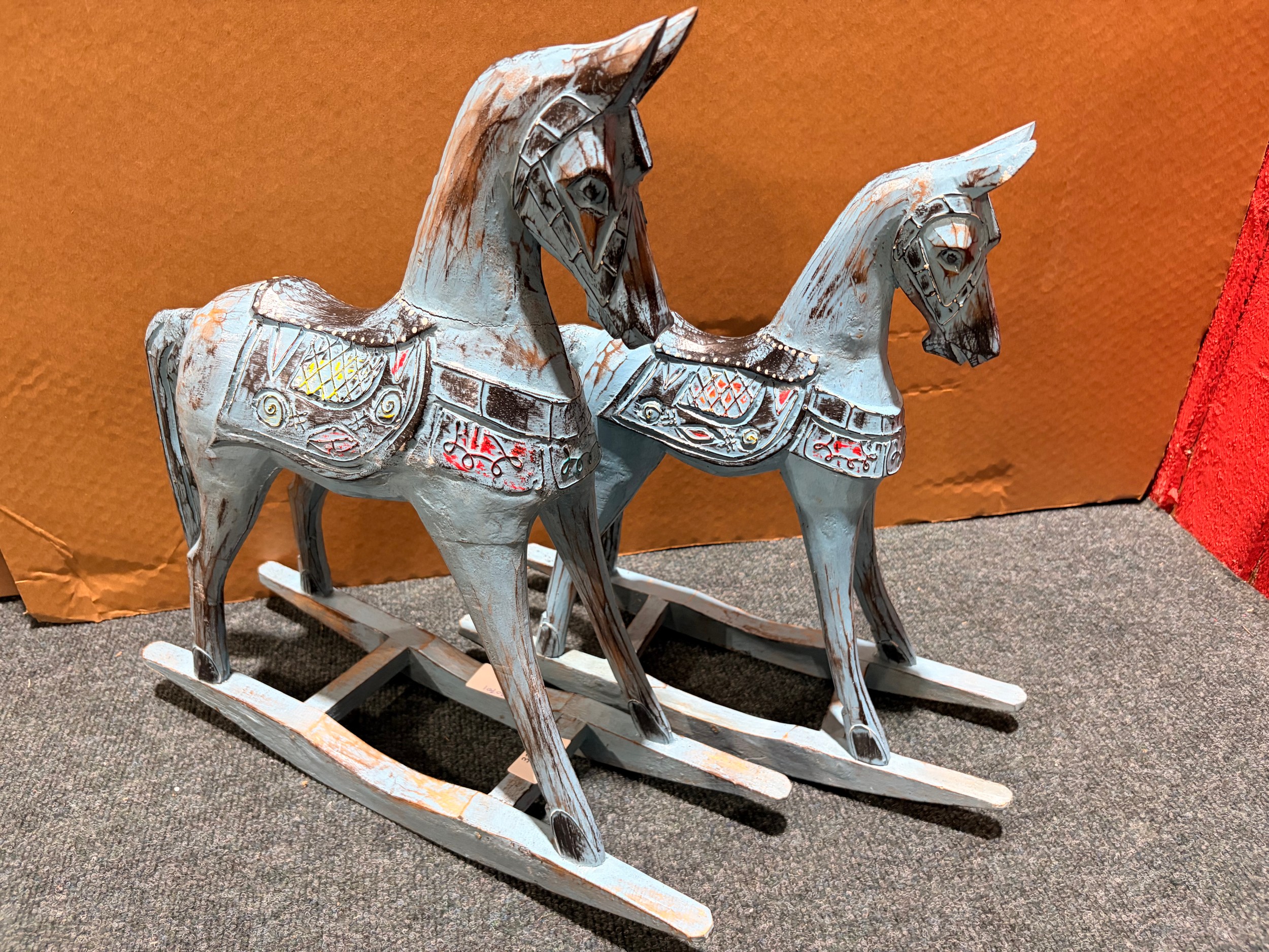 A pair of blue painted rocking horse decorations