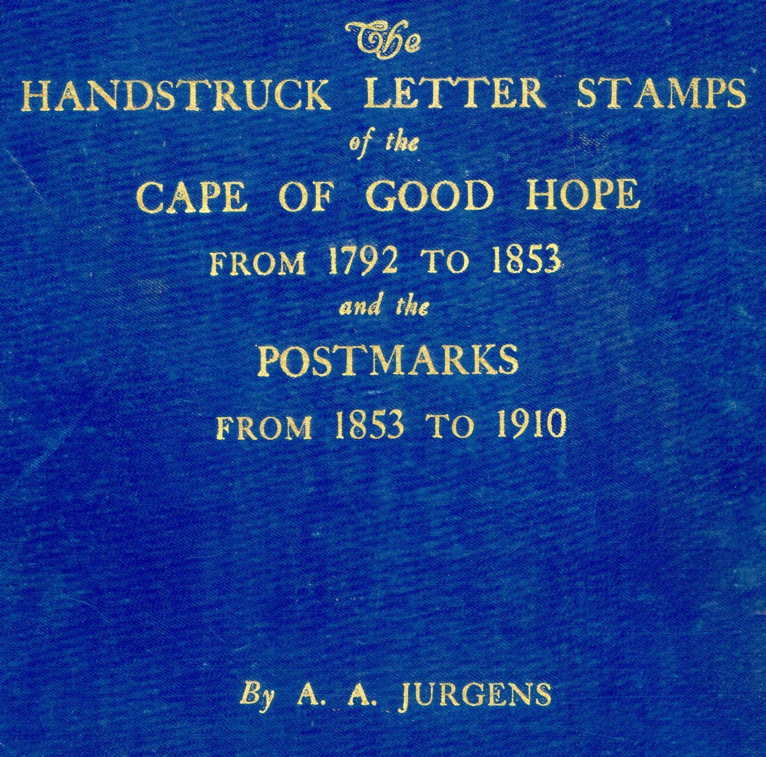 CAPE OF GOOD HOPE, The Handstruck Letter Stamps of the, 1792 to 1853 and the Postmarks from 1853 to 1910; by A. A. Jurgens, 1943. Minor fault at right foot of first 14 pages. Signed numbered copy 110 of 200. Cross Reference: CAPE OF GOOD HOPE