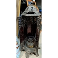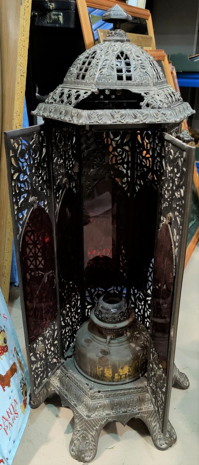 A 19th century hexagonal cathedral heater in pierced cast iron with red glass panels and oil heater (lid and 1 glass a.f.)