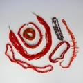 A selection of beads, including a strand of coral, of stylised fringe design, 50cm long, two further coral strands, and four further beaded necklaces (7)