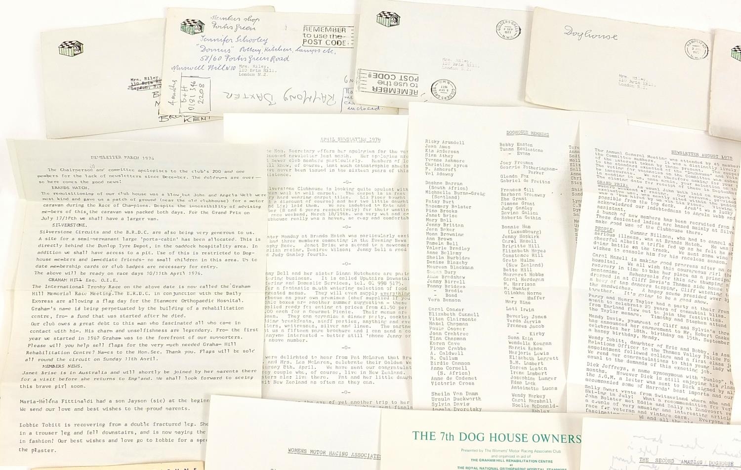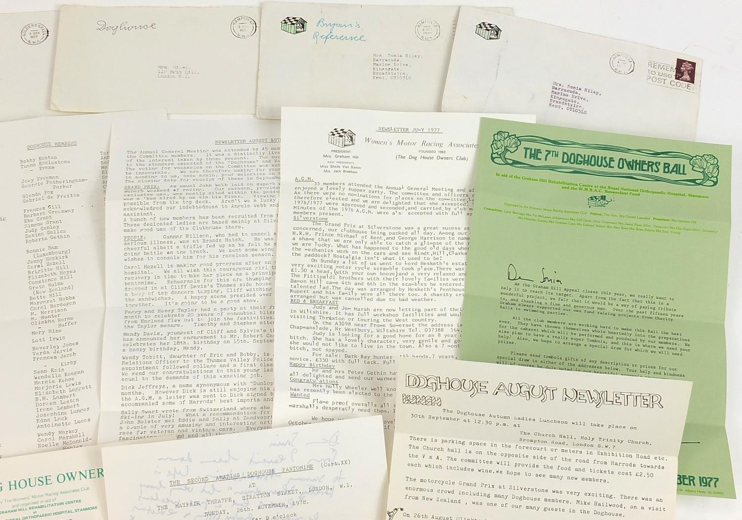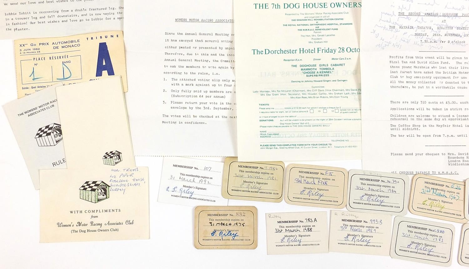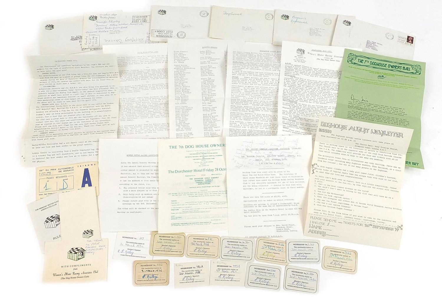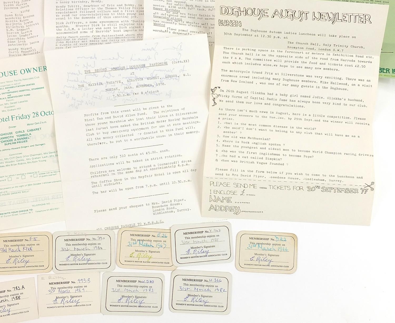 Vintage motoring interest ephemera relating to The Women's Motor Racing Associates Club known as The Doghouse Owner's Club including membership cards and letters