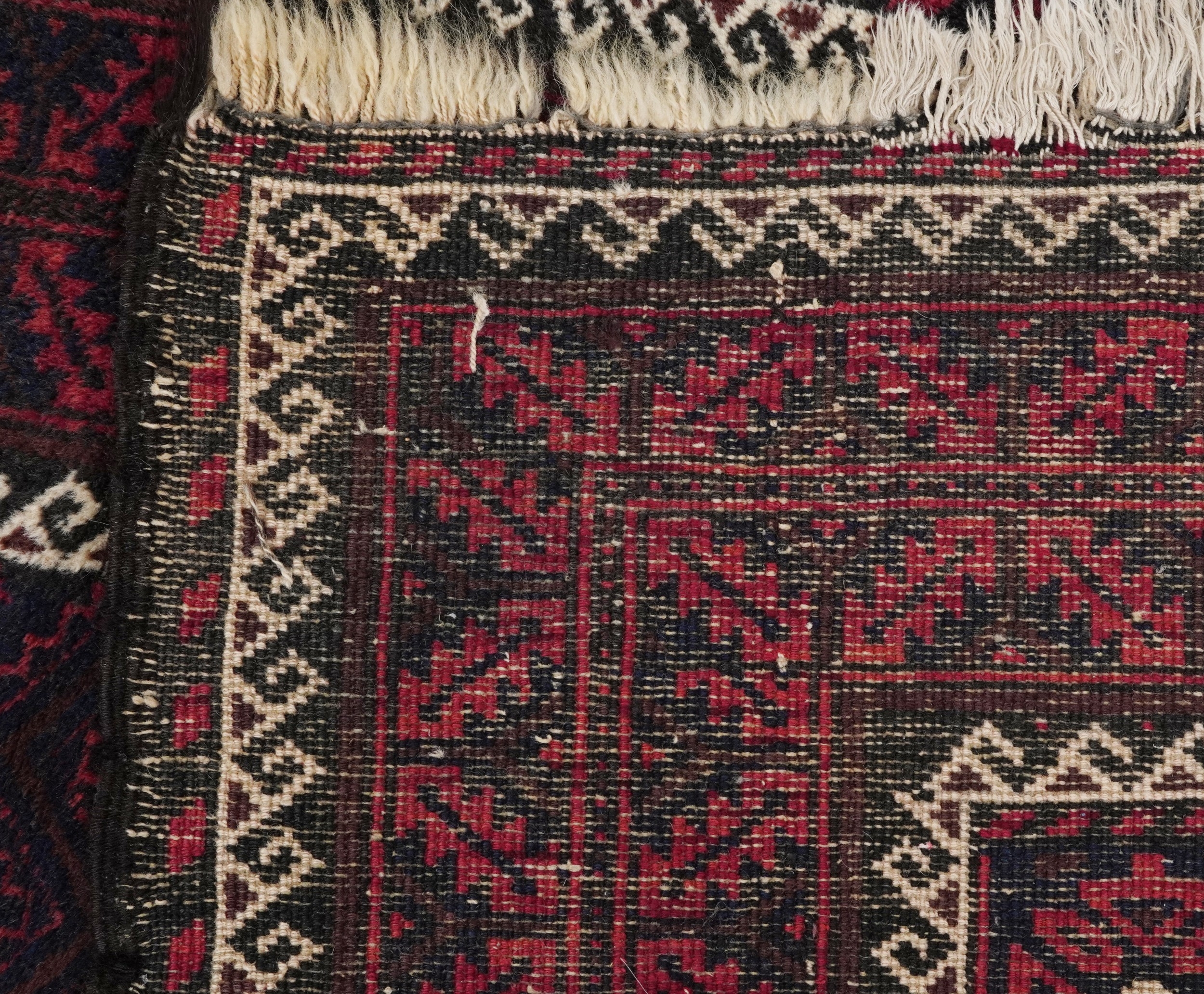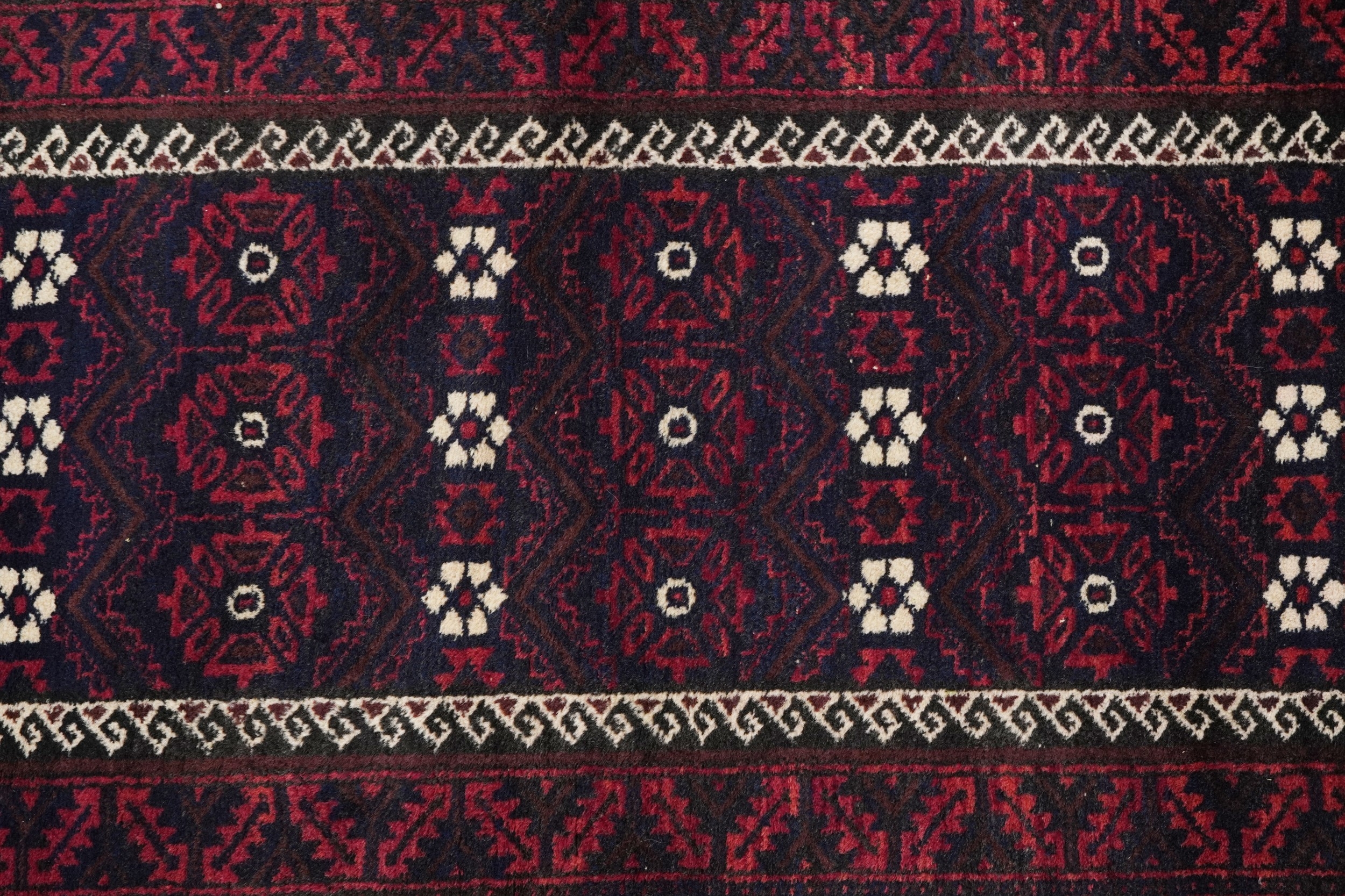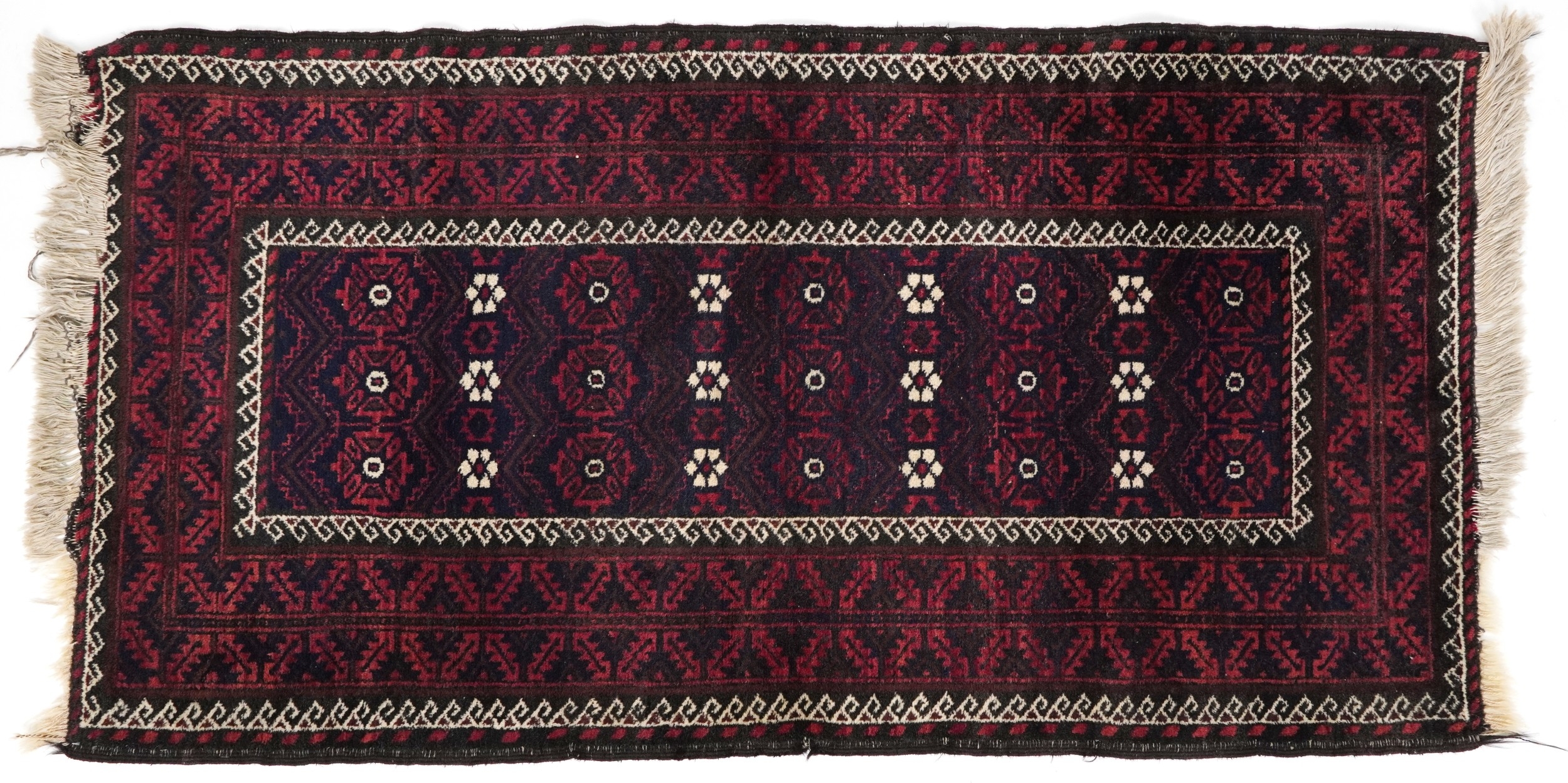 A Baluch rug, 20th century, the midnight blue field with a central rectangular panel within a complementary border, 172cm x 90cm.