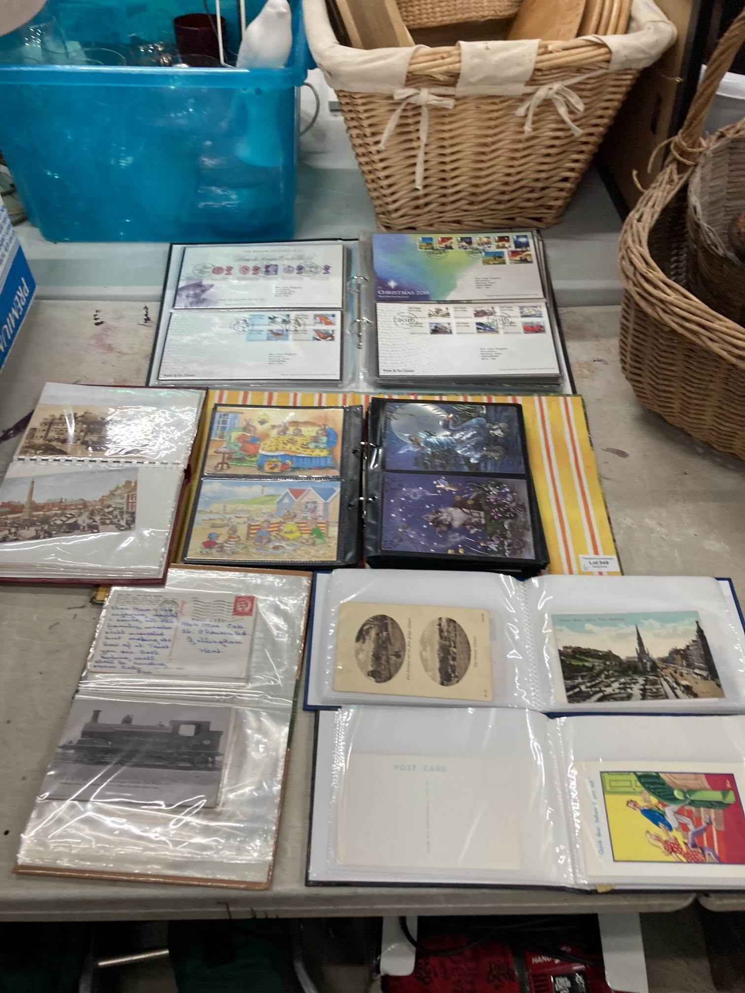 Albums containing vintage humerous and black and white and coloured scenic postcards, Molly Brett nostalgic postcards, Jean Henry fairy postcards, and an album of First Day covers incl. Tale of Beatrix Potter, Seaside Architecture etc