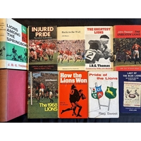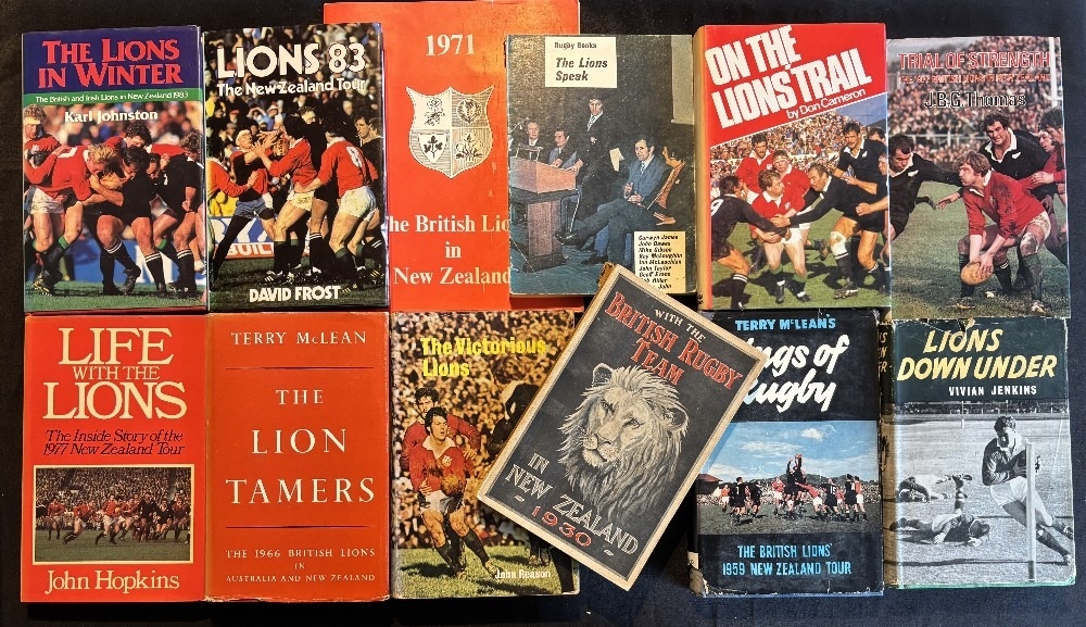 1930-1983 British and I Lions Rugby Tours to NZ Books (12): 1930 Alley’s With the British Team in NZ, splendid s/back; 1959 Lions Down Under, VGJ Jenkins and Kings of Rugby, T McLean; 1966 The Lion Tamers, McLean; 1971 The Victorious Lions and The Lions Speak, both J Reason and The British Lions in NZ, RU Writers’ Club; 1977 Trial of Strength, JBG Thomas and Life With The Lions, J Hopkins; 1983 Lions, D Frost, The Lions In Winter, K Johnston and On The Lions’ Trail, D Cameron. VG