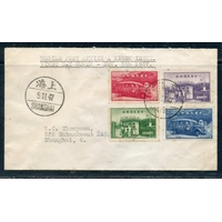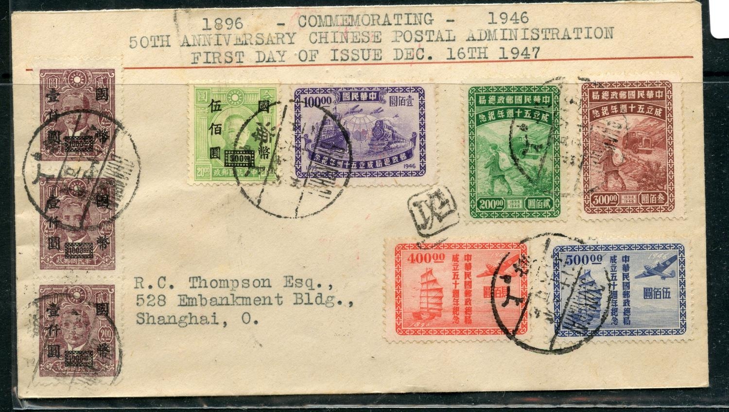 CHINA 1947 Postal Administration set on plain FDC. Good condition. SG 985 - 989 with an additional SG 858 x 3 added.