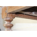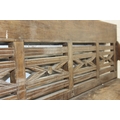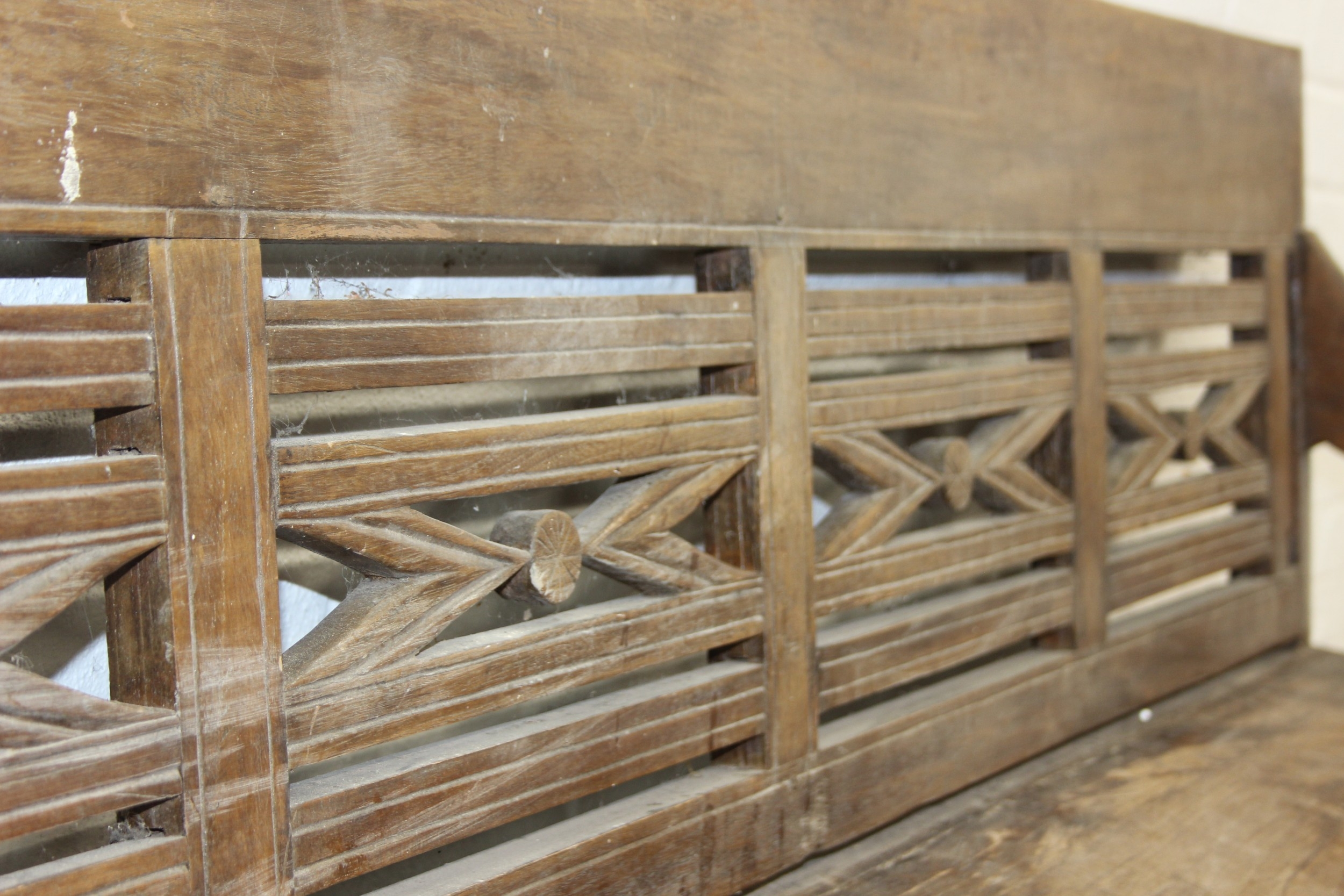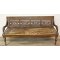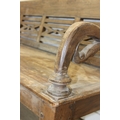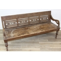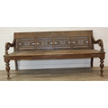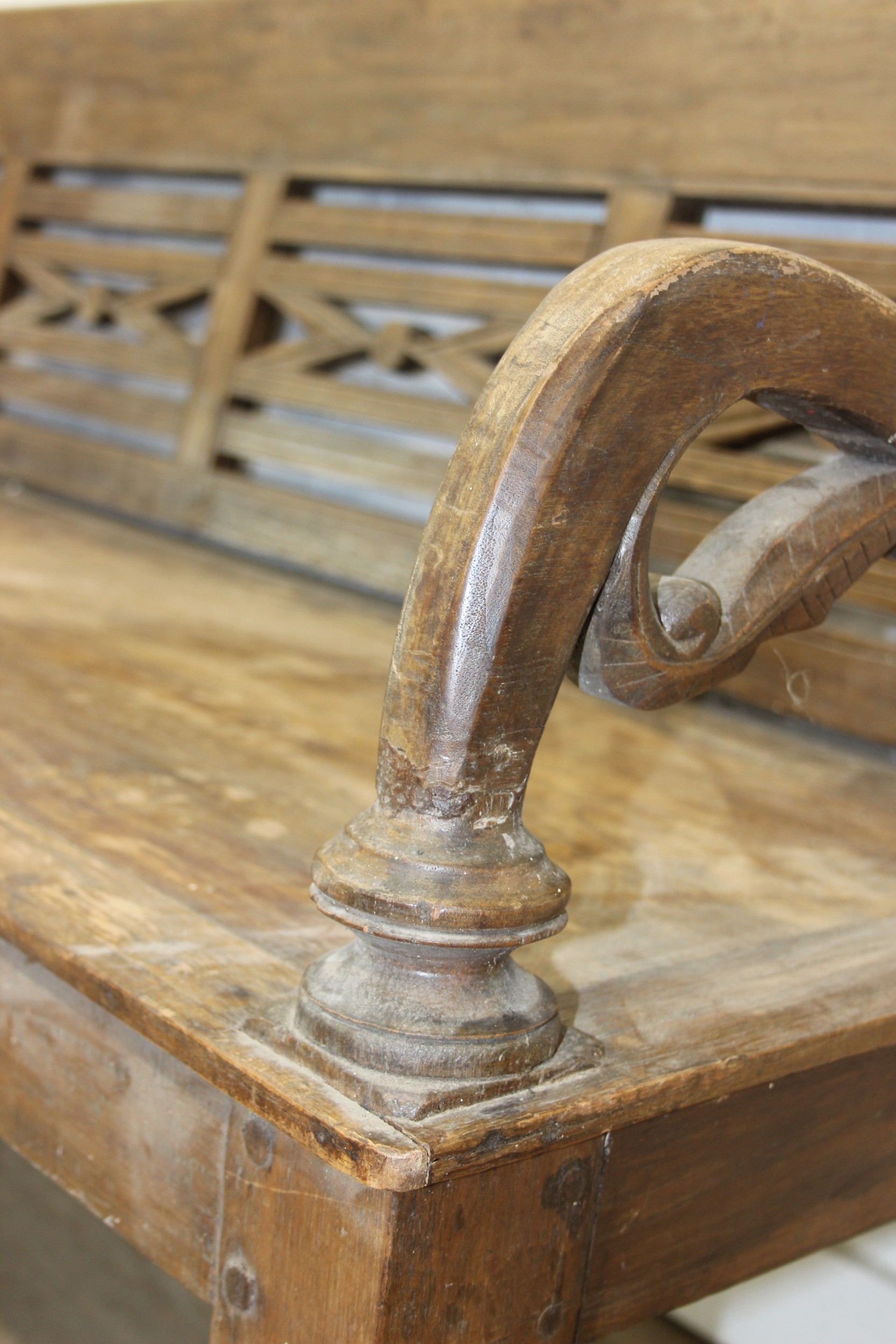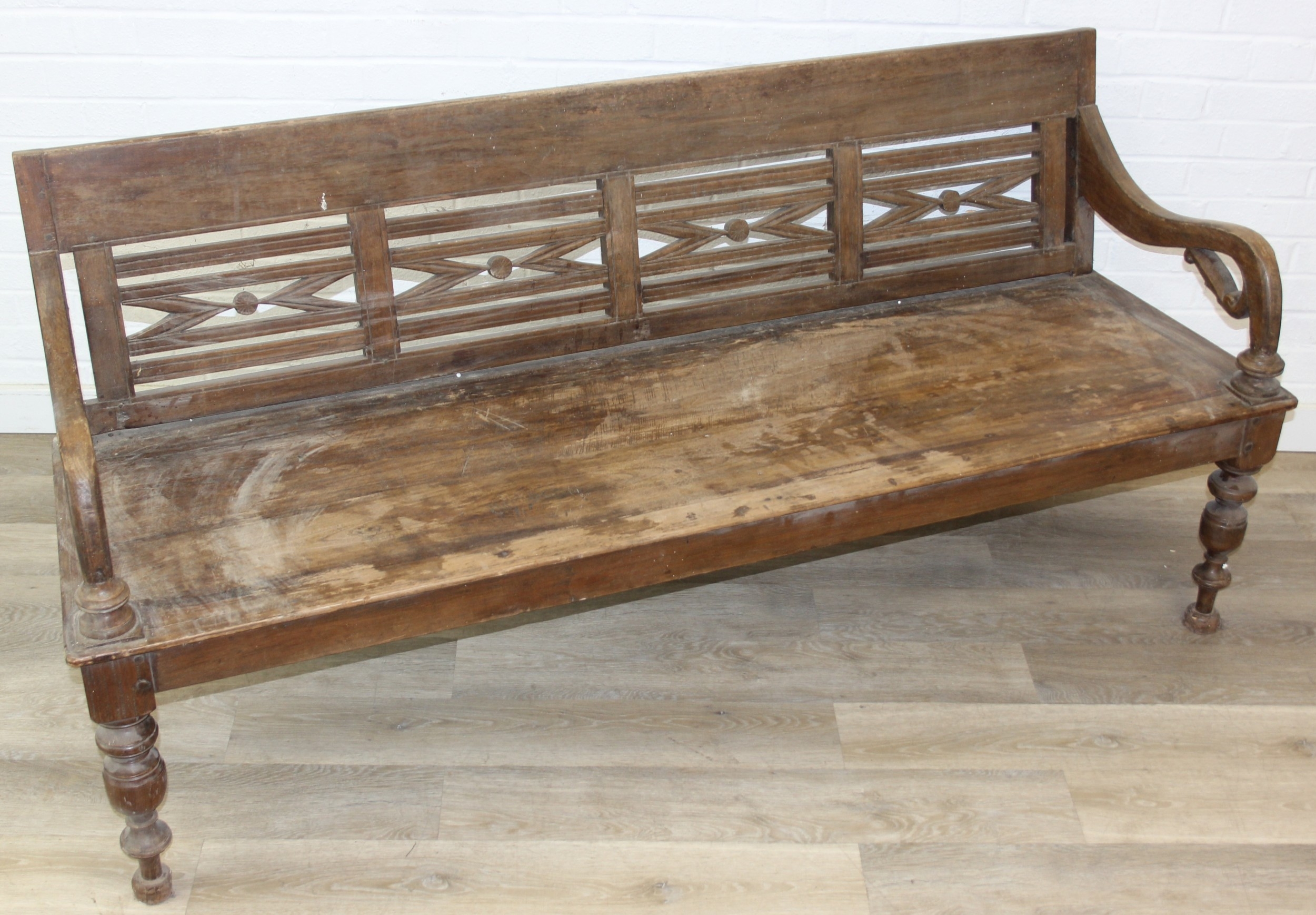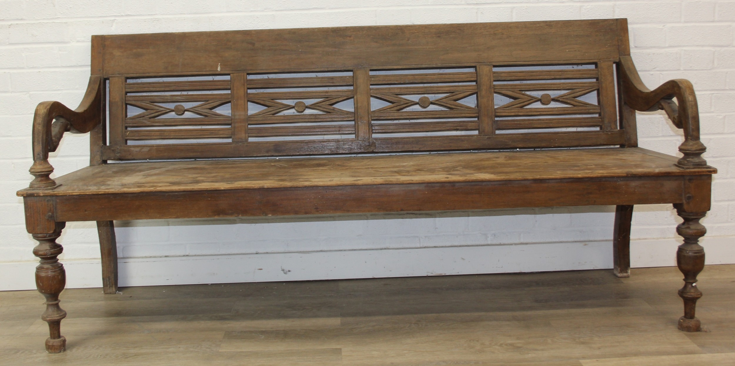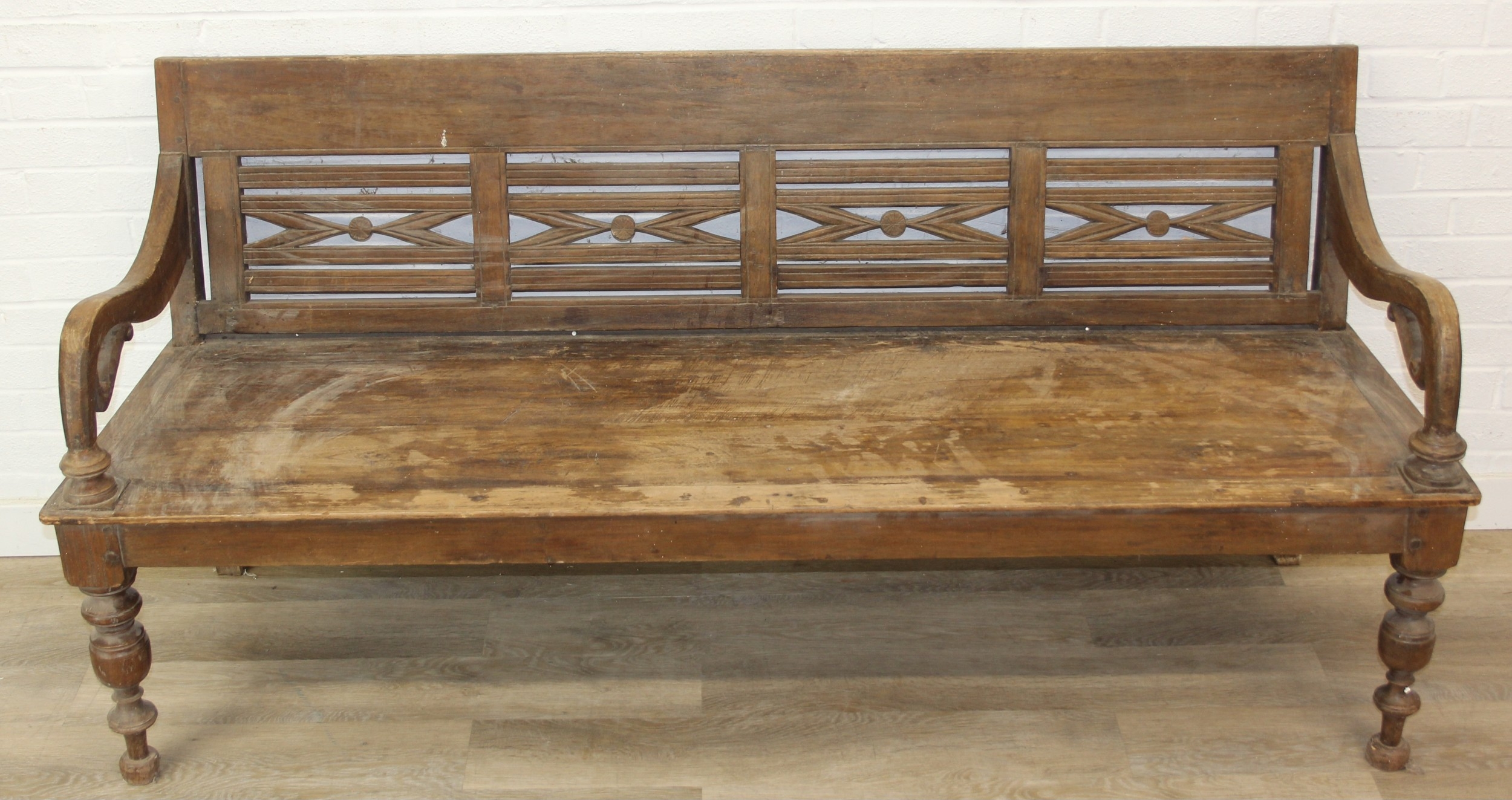 A large hallway or conservatory garden bench with cut our back, scroll arms and turned legs, 20th century, 182cm wide x 84cm tall