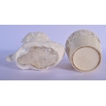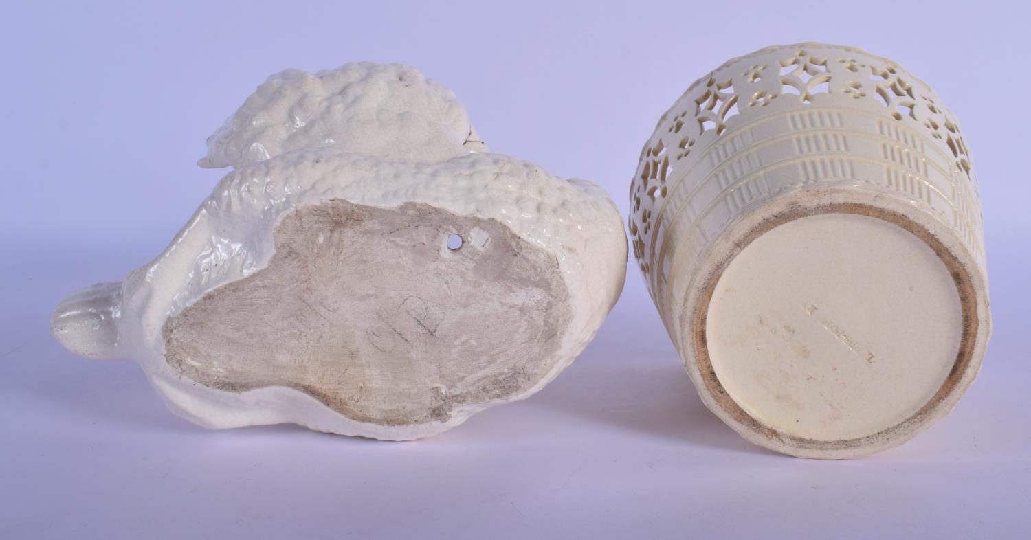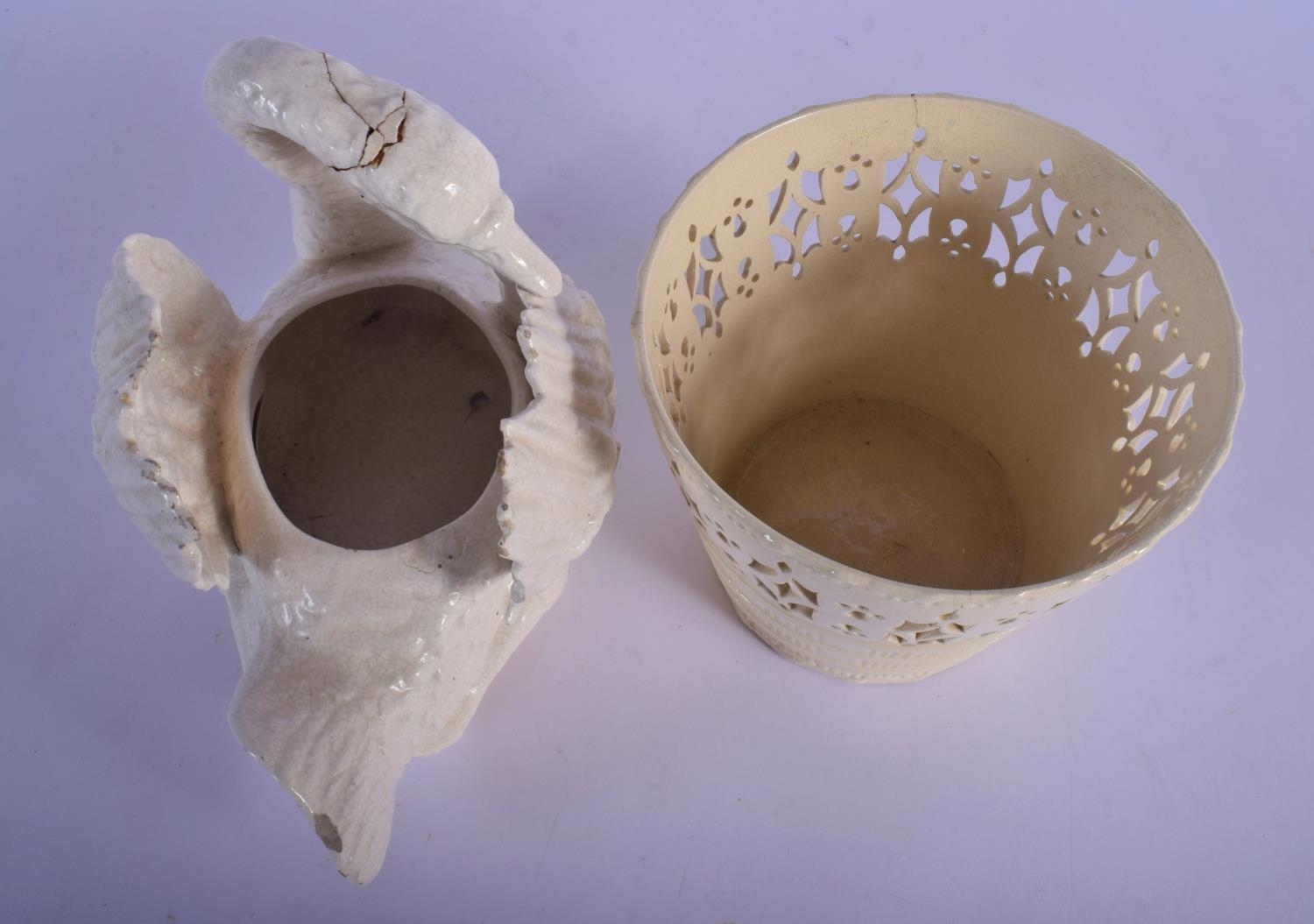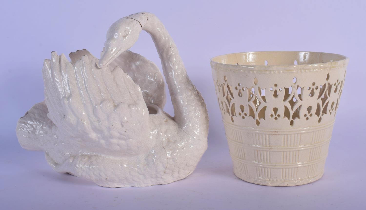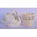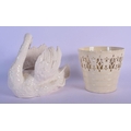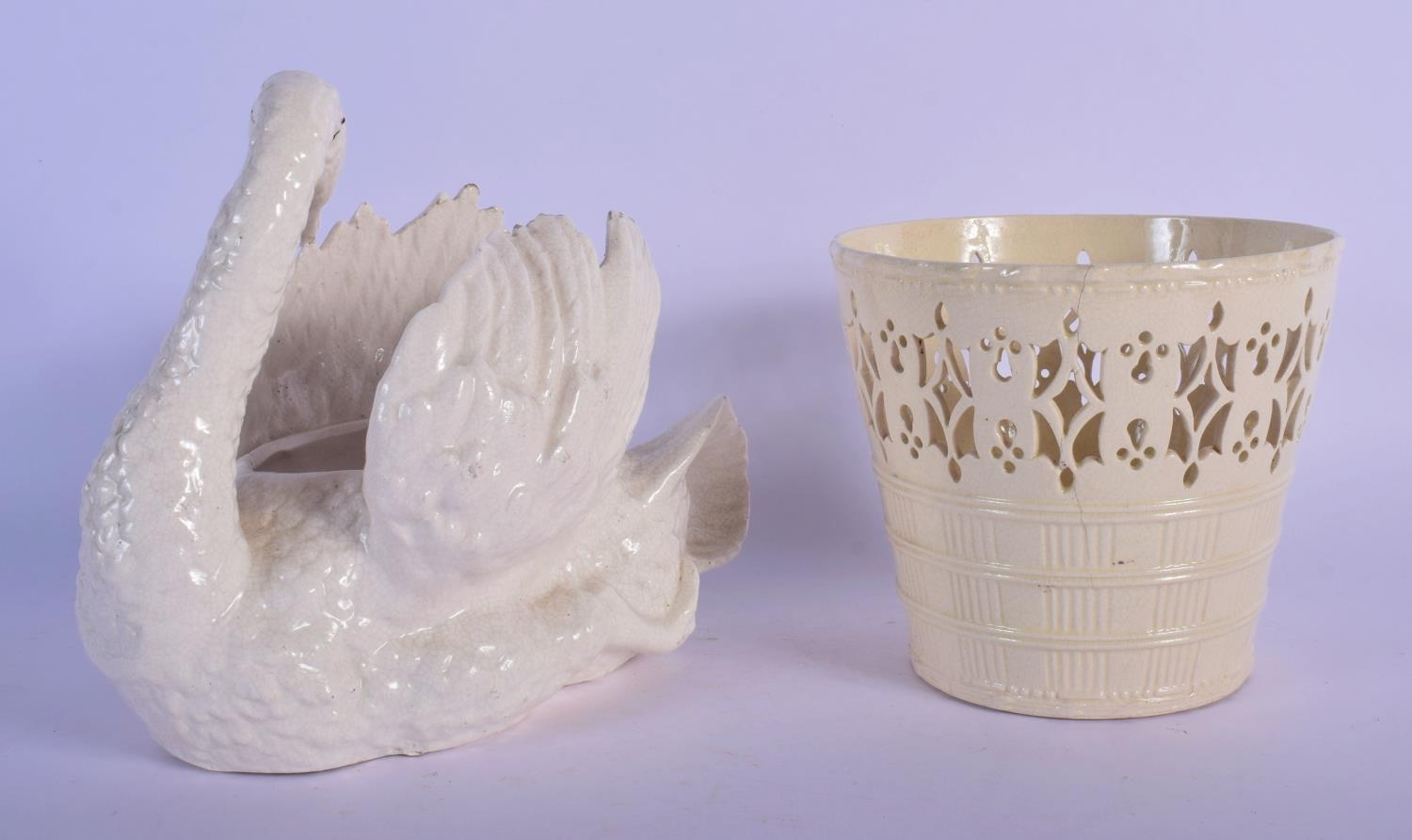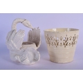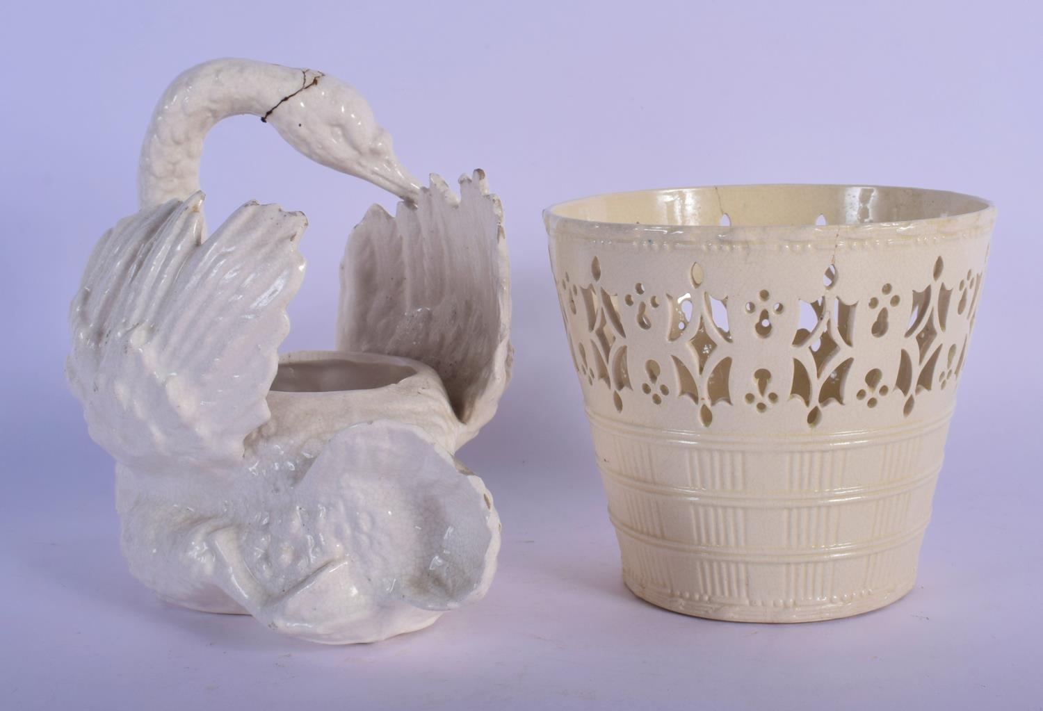 A LATE 18TH CENTURY LEEDS CREAMWARE OPENWORK BASKET VASE together with an early Continental pottery swan. Largest 19 cm x 17 cm. (2)