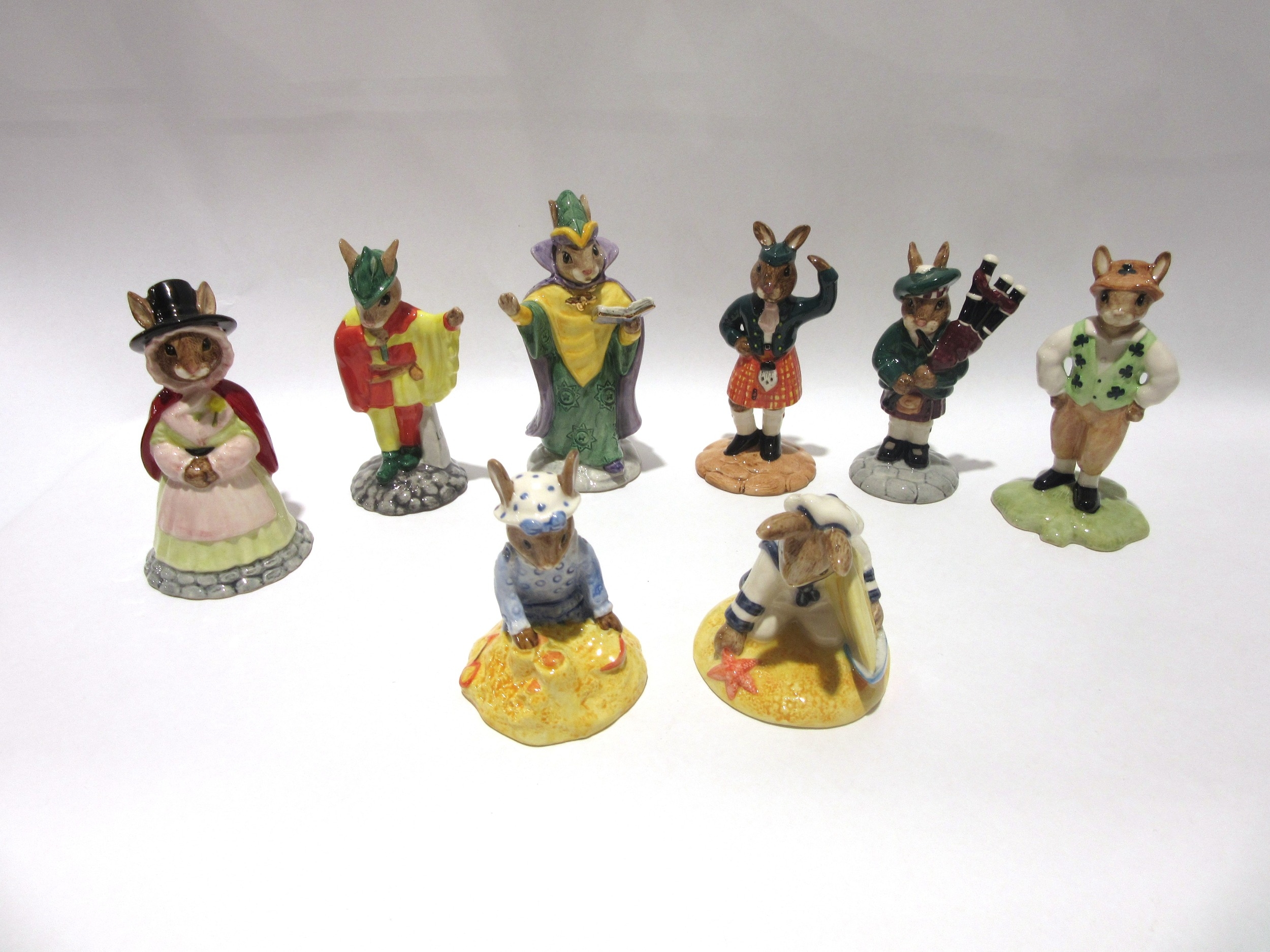 Eight Royal Doulton Bunnykins figures - "Mystic Bunnykins", "Welsh lady Bunnykins", "Scotsman Bunnykins" "Piper Bunnykins", "Irishman Bunnykins", "Sailor Bunnykins", "Seaside Bunnykins" and "Minstrel Bunnykins"