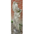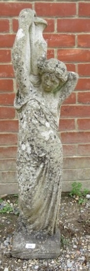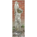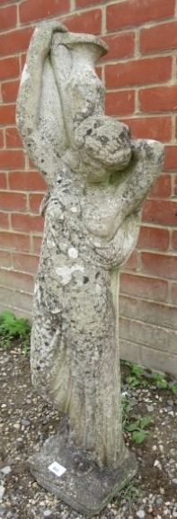 A weathered reconstituted stone garden statue modelled as a Classical Grecian maiden with a water jar, on a plinth base.