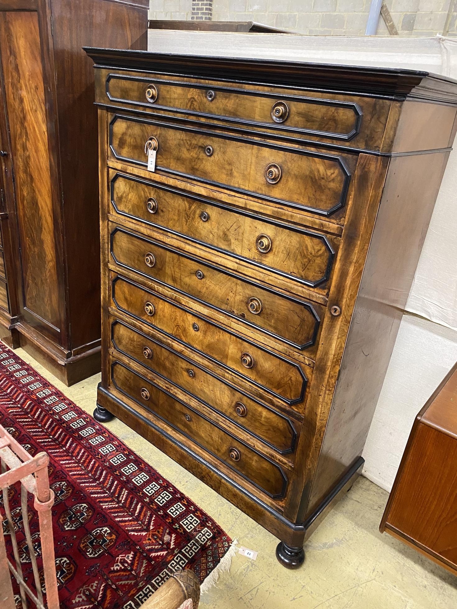 A 19th century French walnut seven drawer chest, with side locking bar, width 127cm, depth 57cm, height 167cm