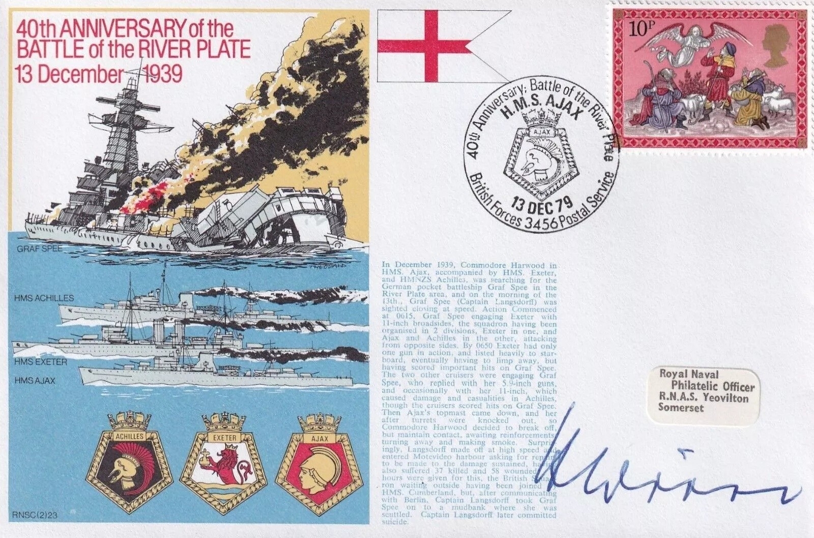 WW2 Capt Helmut Witte KC U159 signed Battle of the River Plate Navy cover 2RN23. 13 Dec 79 - BFPS 3456 - 40th Anniversary of Battle of the River Plate. Personally Signed by Captain Helmut Witte Knights Cross Died 2005, U boat Commander U - 159 during WW11 With German Detailed Cachet on the back. Enclosed Black and White Photo's enclosed with details. Numbered 8 of 42 . Single Vendor RAF cover collection. Good condition. All autographs come with a Certificate of Authenticity. We combine postage on multiple winning lots and can ship worldwide. UK postage from £5.99, EU from £7.99, Rest of World from £9.99