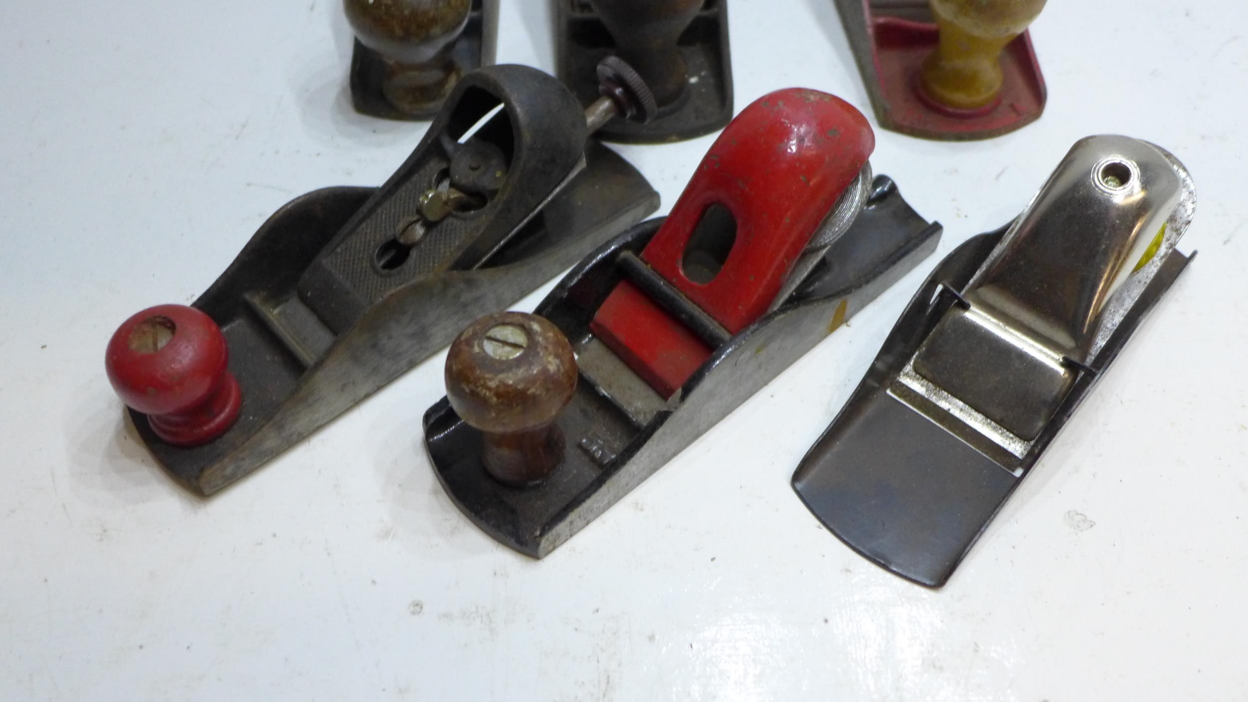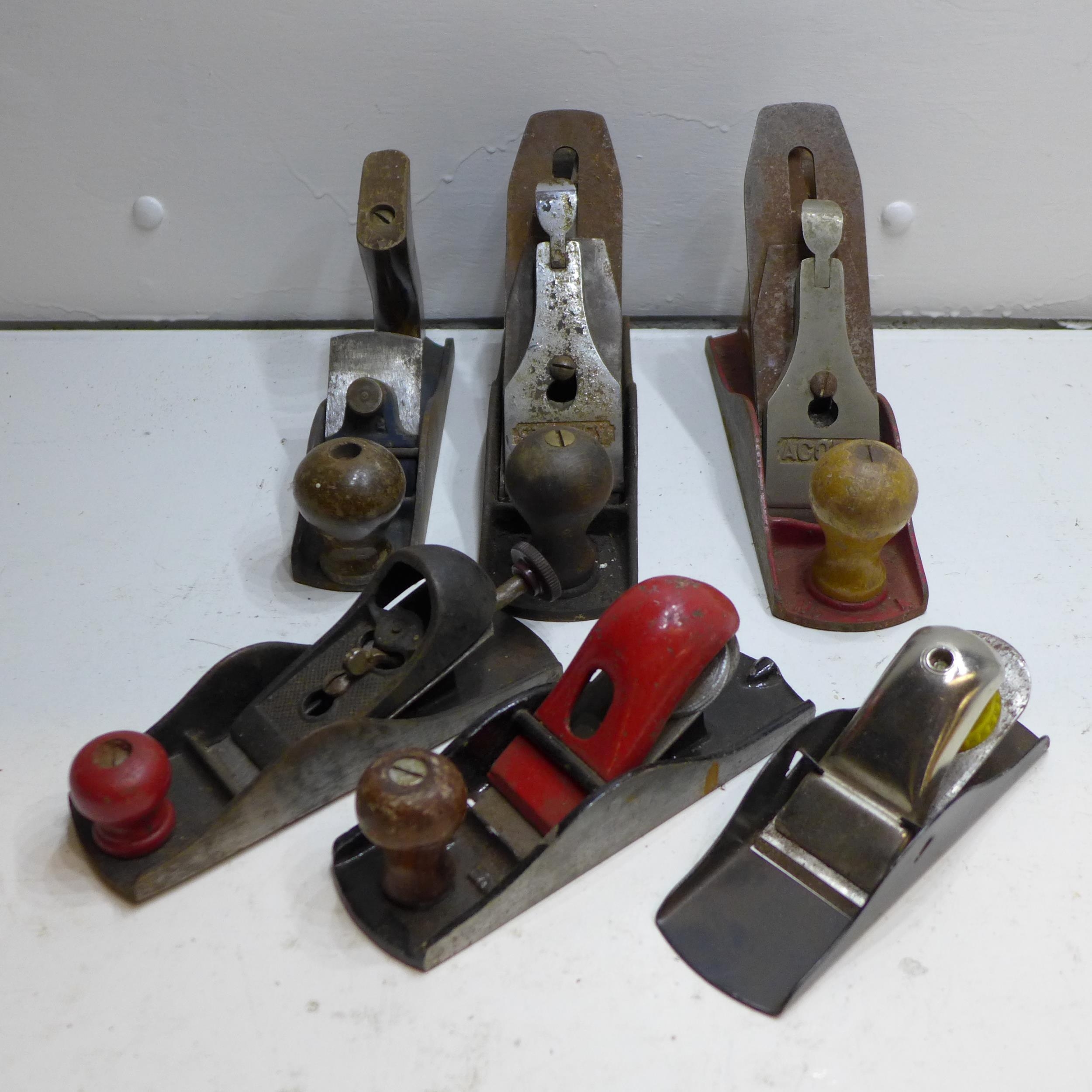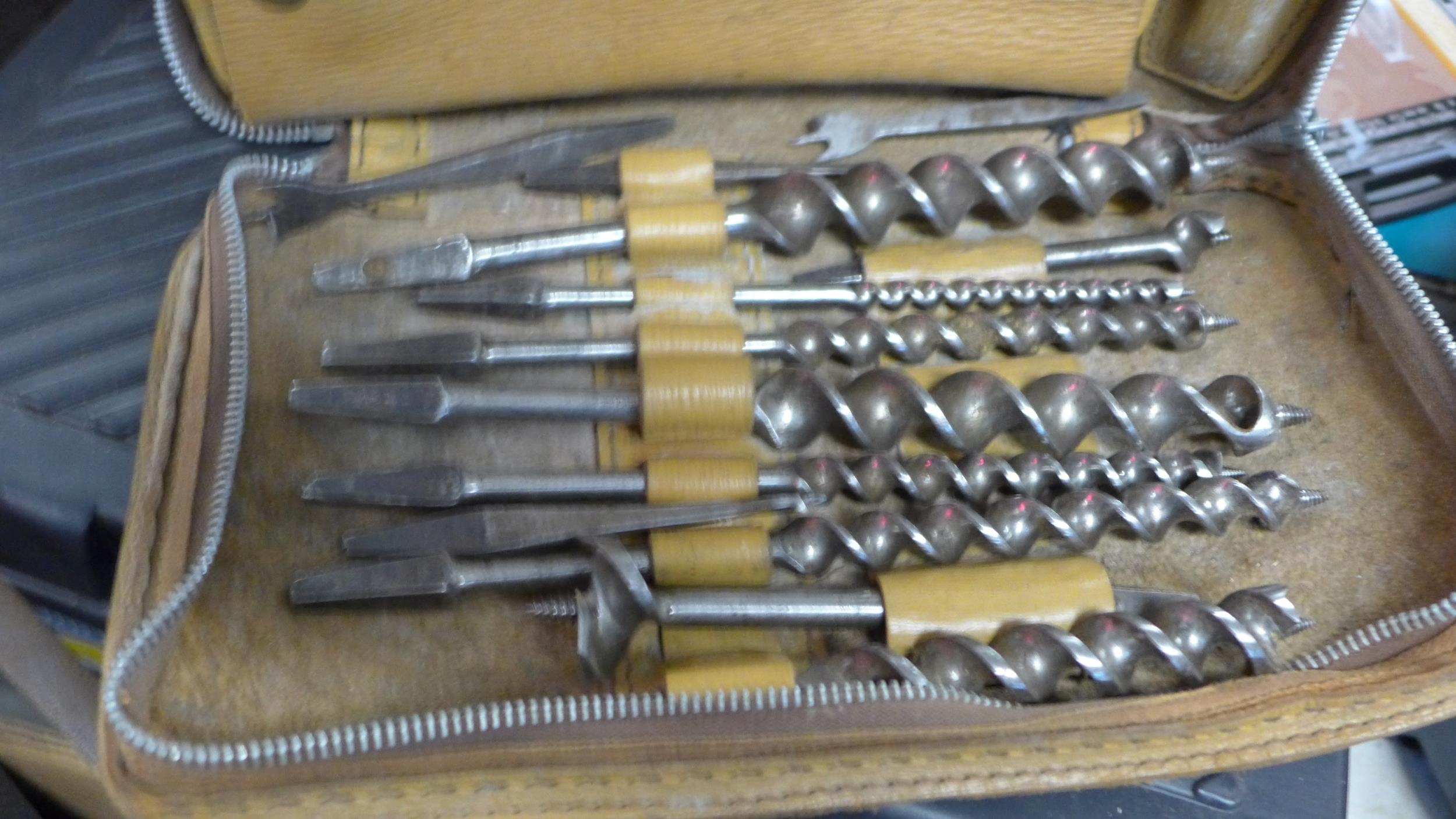 Leather wallet of large gauge drill bits, with qty. of joiners tools inc. planes, some vintage tools inc. Stanley, Rabbone, Draper yellow & black toolbox containing sockets & spanners