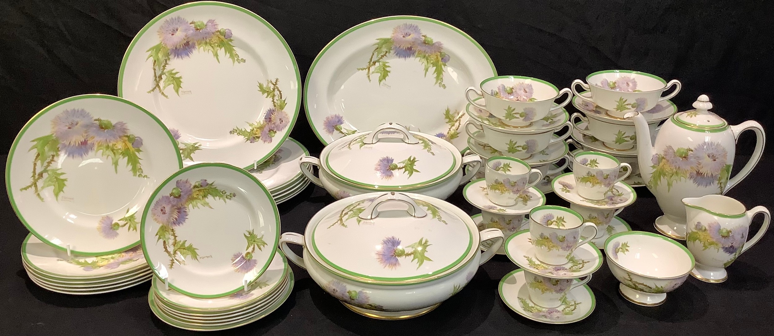 A Royal Doulton Glamis Thistle dinner and coffee service for six comprising vegetable dishes, dinner plates, dessert plates, side plates, soup bowls and stands, coffee pot, cream jug, sugar bowl, coffee cans and saucers, etc
