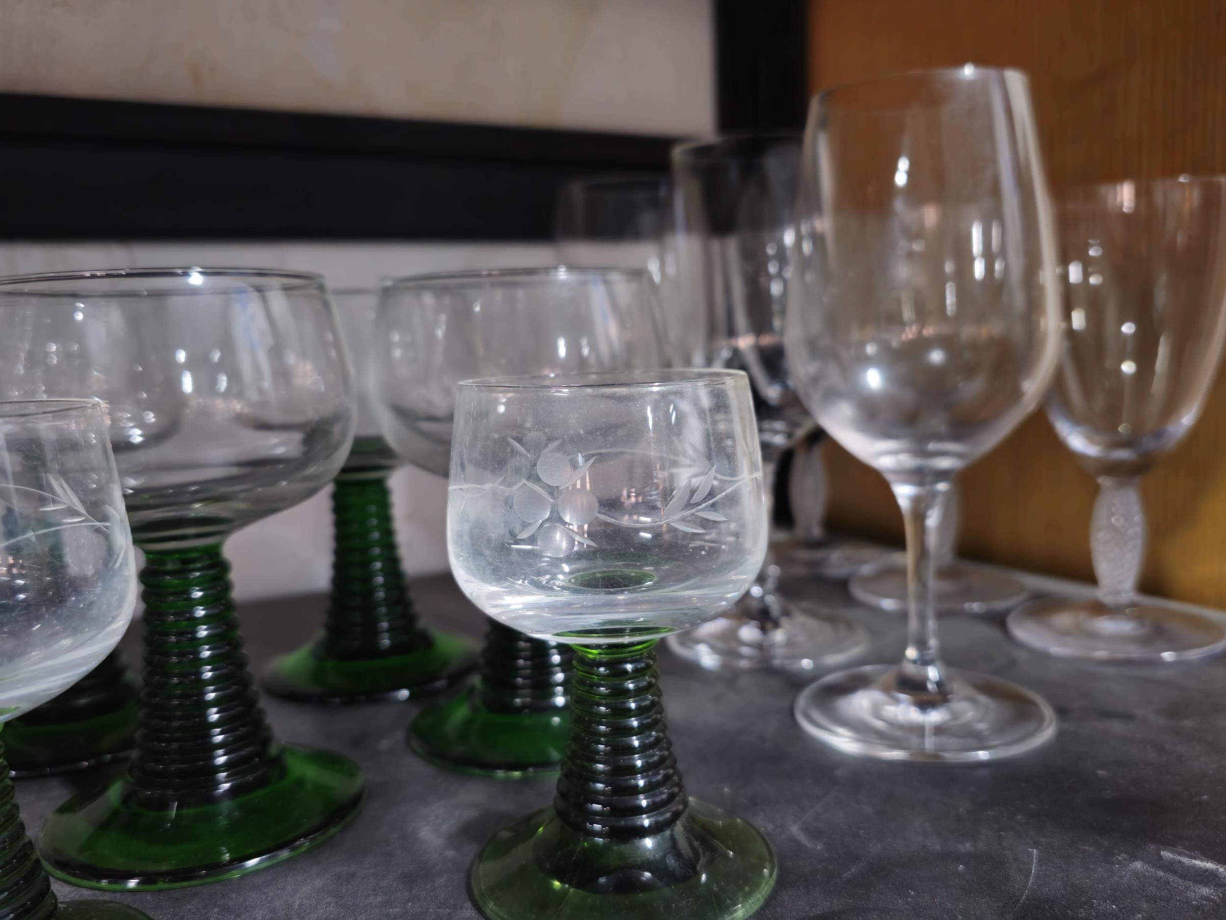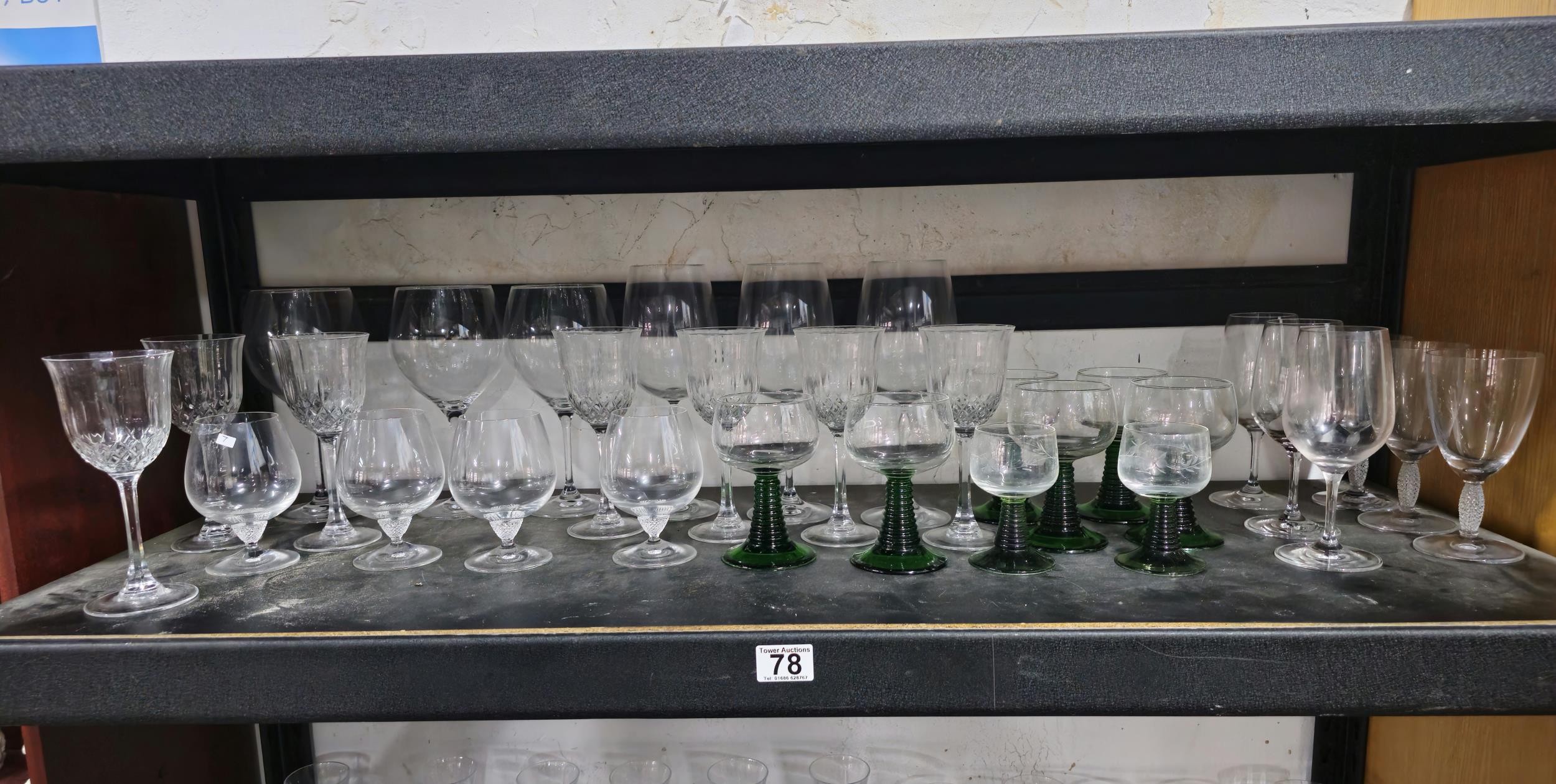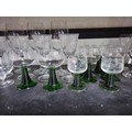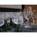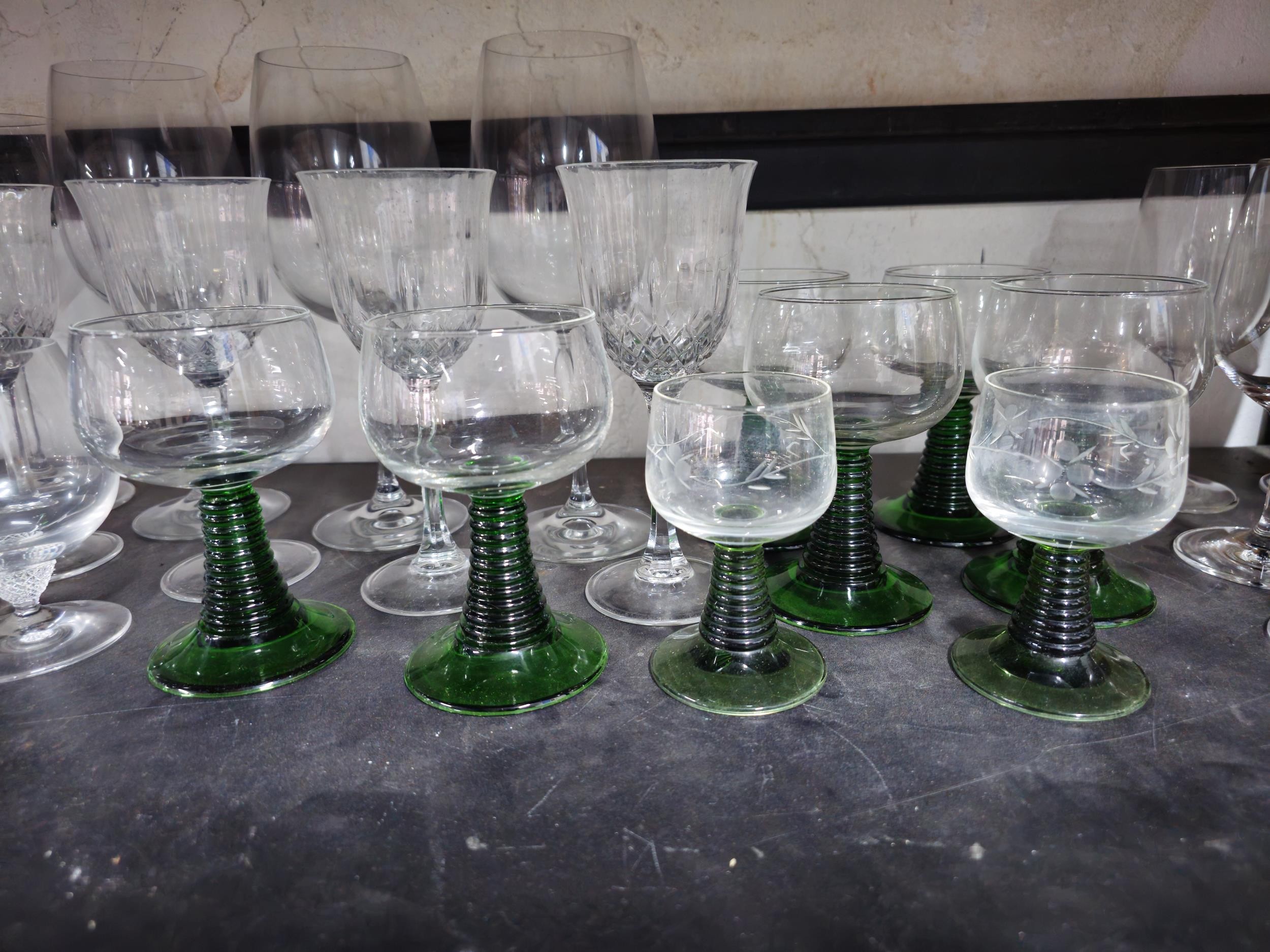 A shelf full of a large collection of drinking glasses to include 9x Villeroy and Boch glasses of various sizes along with a collection of glasses stamped with a crown over an S for Swedish glass and a collection of 8x Luminar French green stemmed glasses, tallest glasses stands at 26cm high