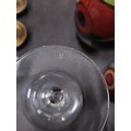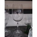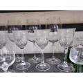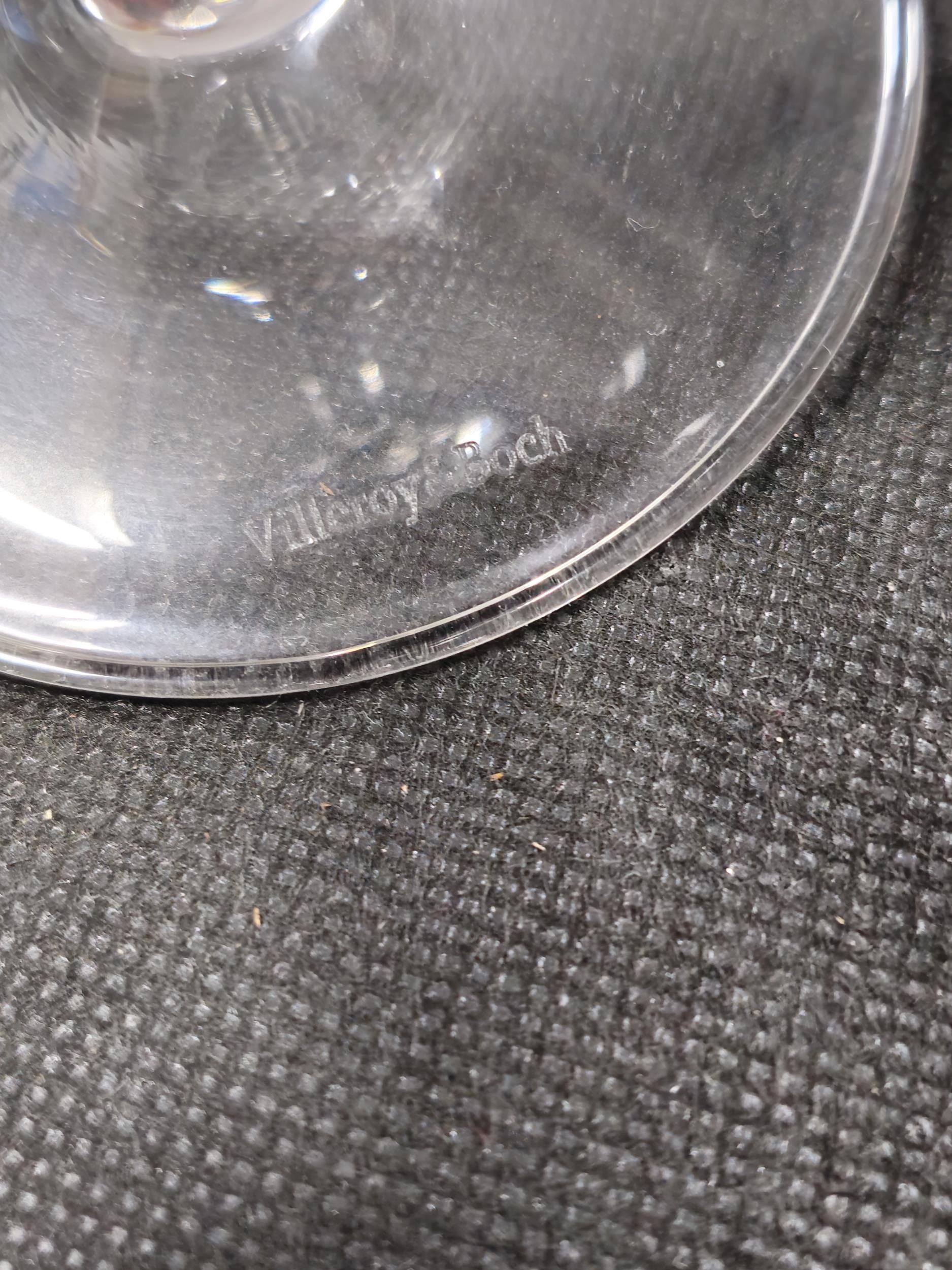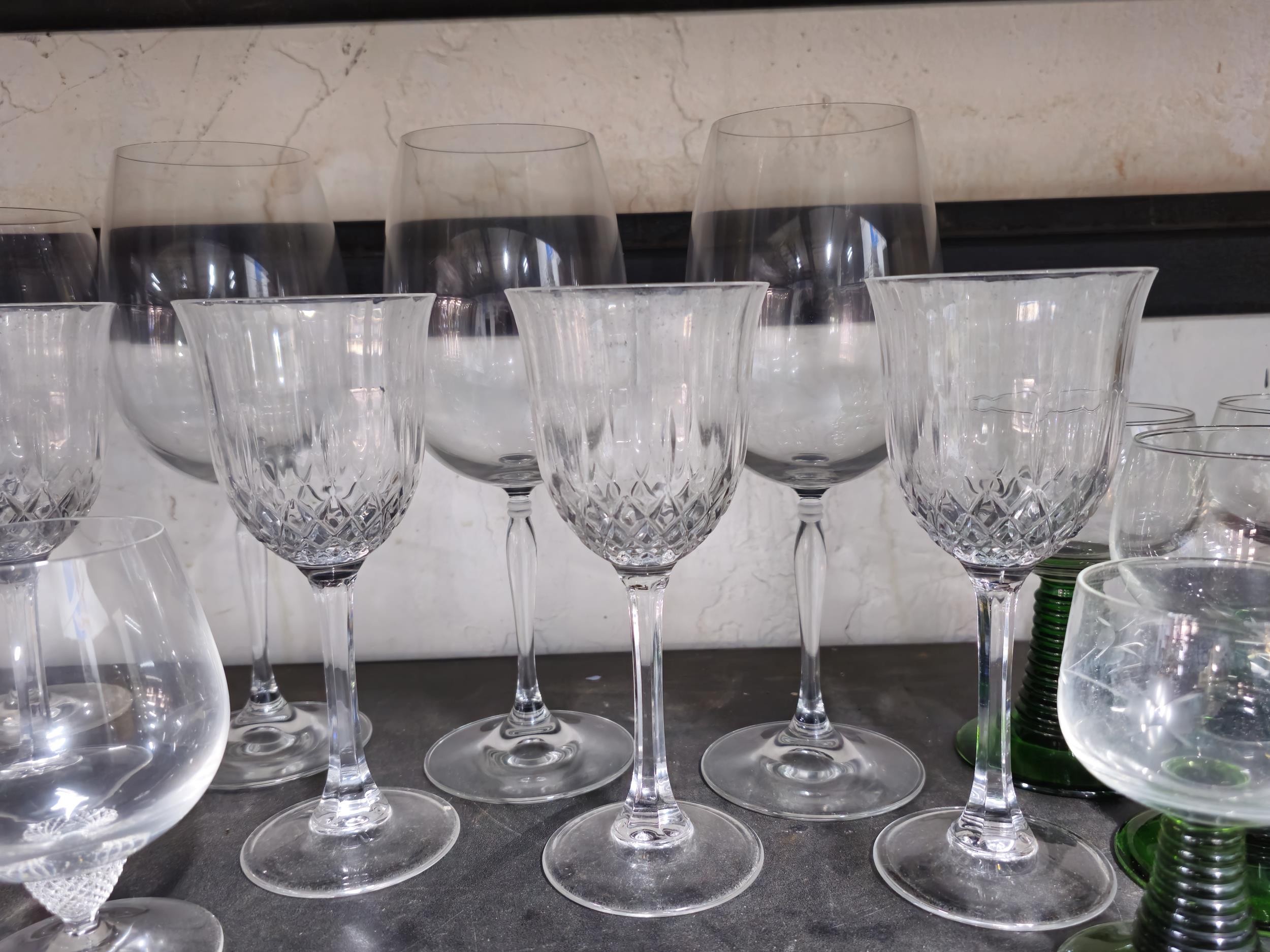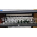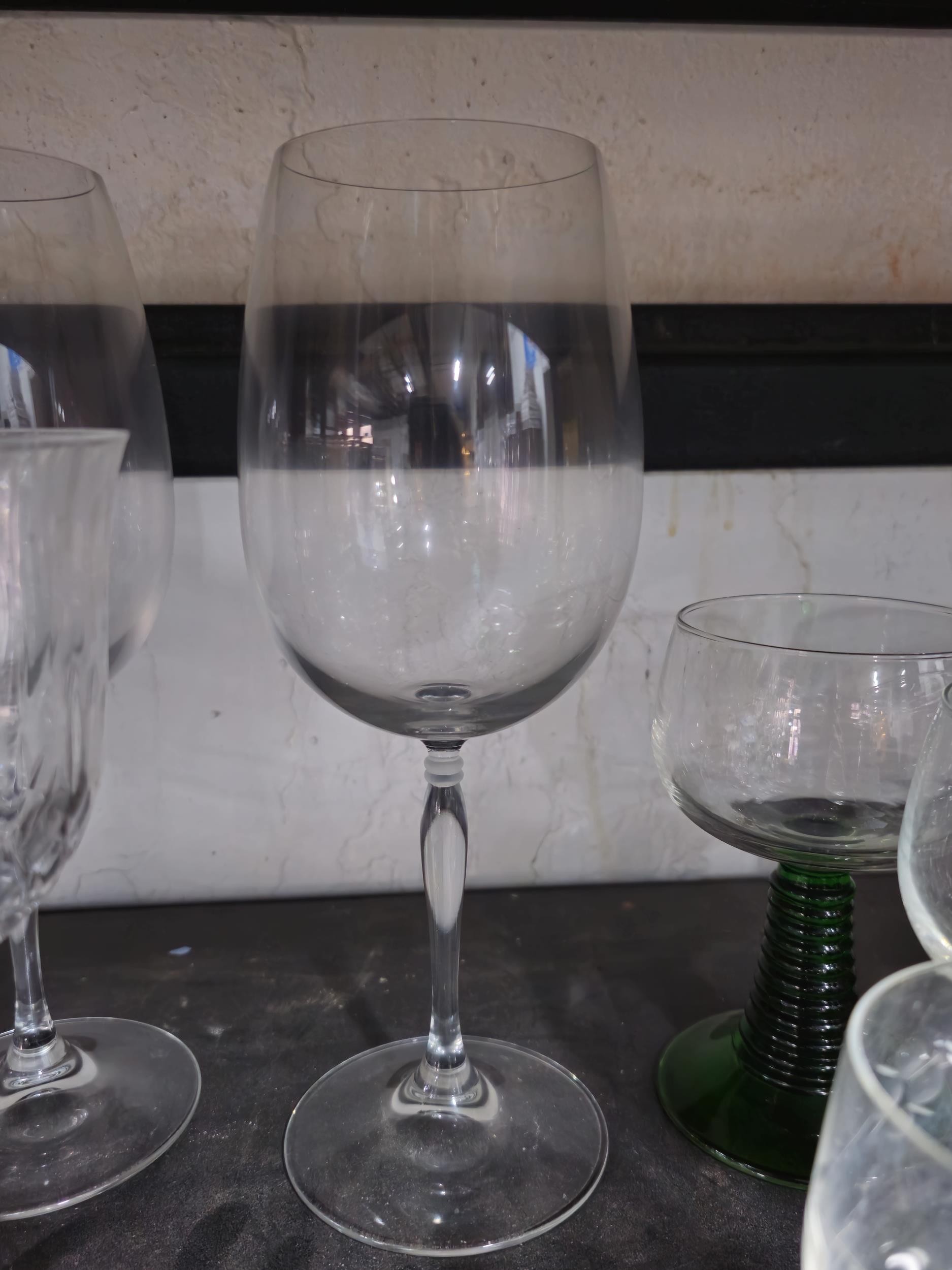 A shelf full of a large collection of drinking glasses to include 9x Villeroy and Boch glasses of various sizes along with a collection of glasses stamped with a crown over an S for Swedish glass and a collection of 8x Luminar French green stemmed glasses, tallest glasses stands at 26cm high