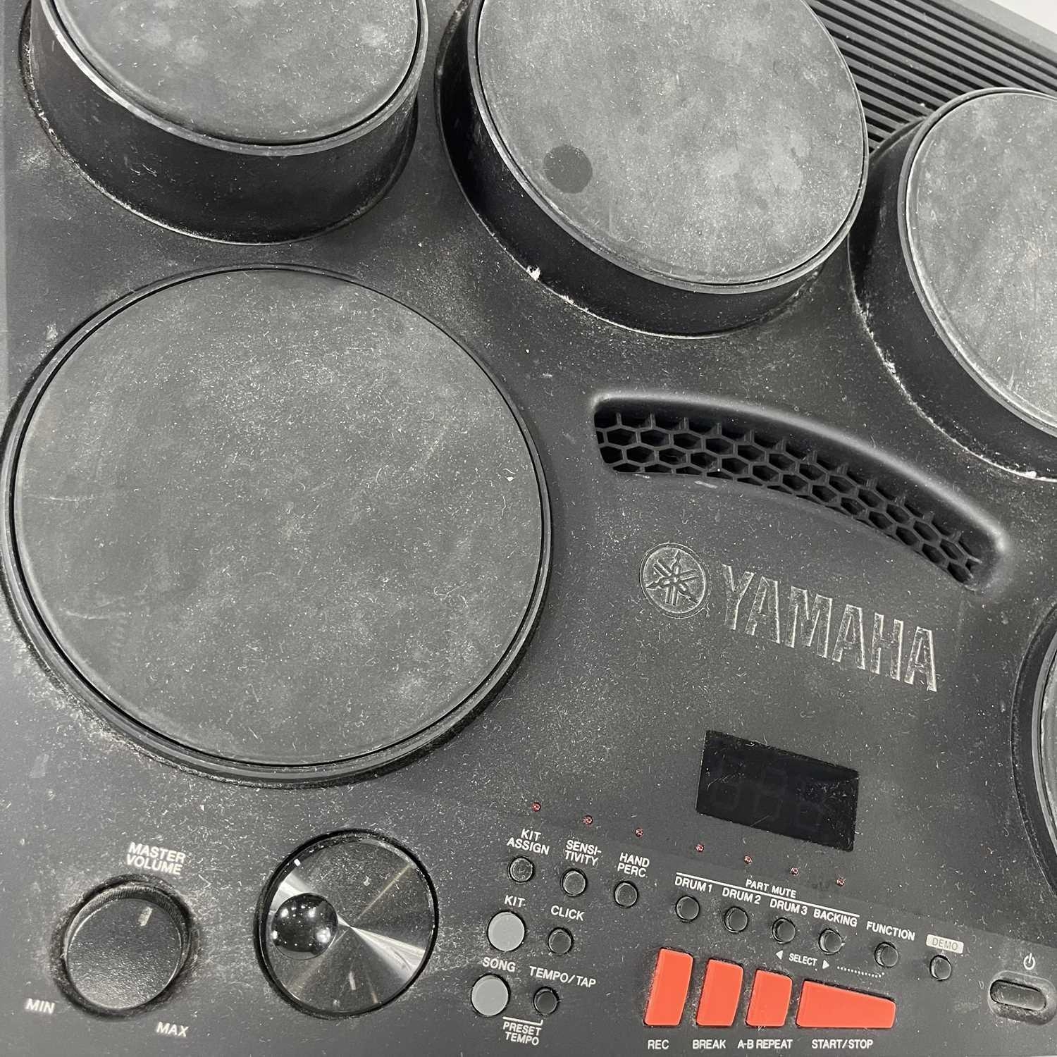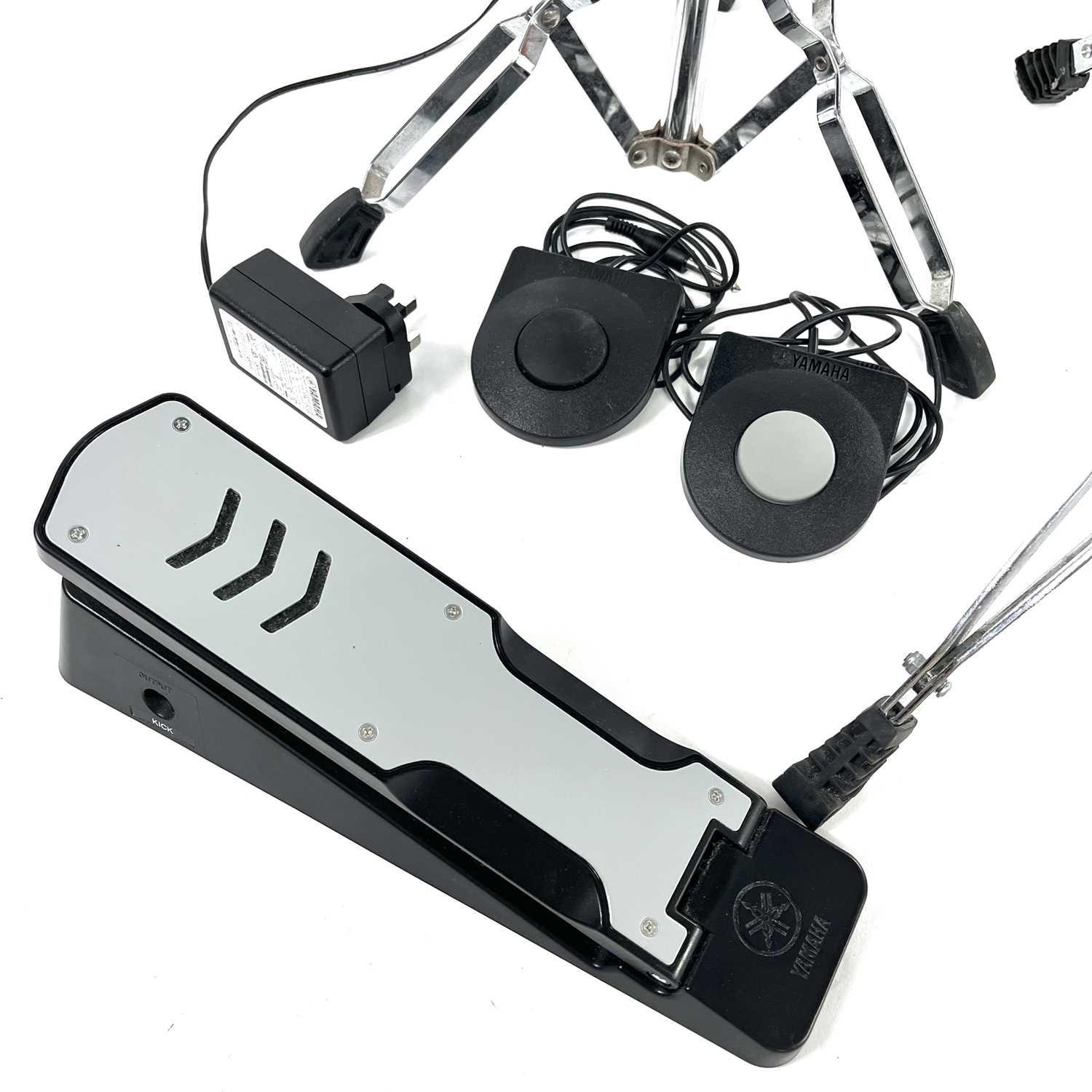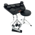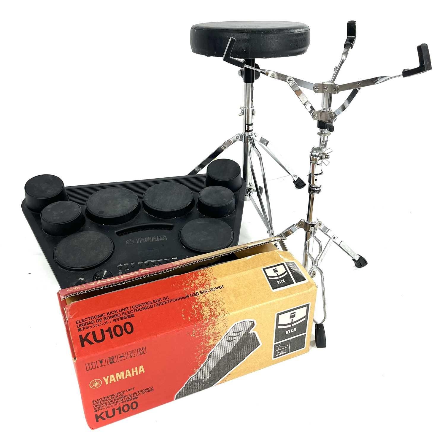 Yamaha DD-75 portable digital drum set and a KU100 silent kick pedal. Also included is a stand for the DD-75 and a drum stool. (4)