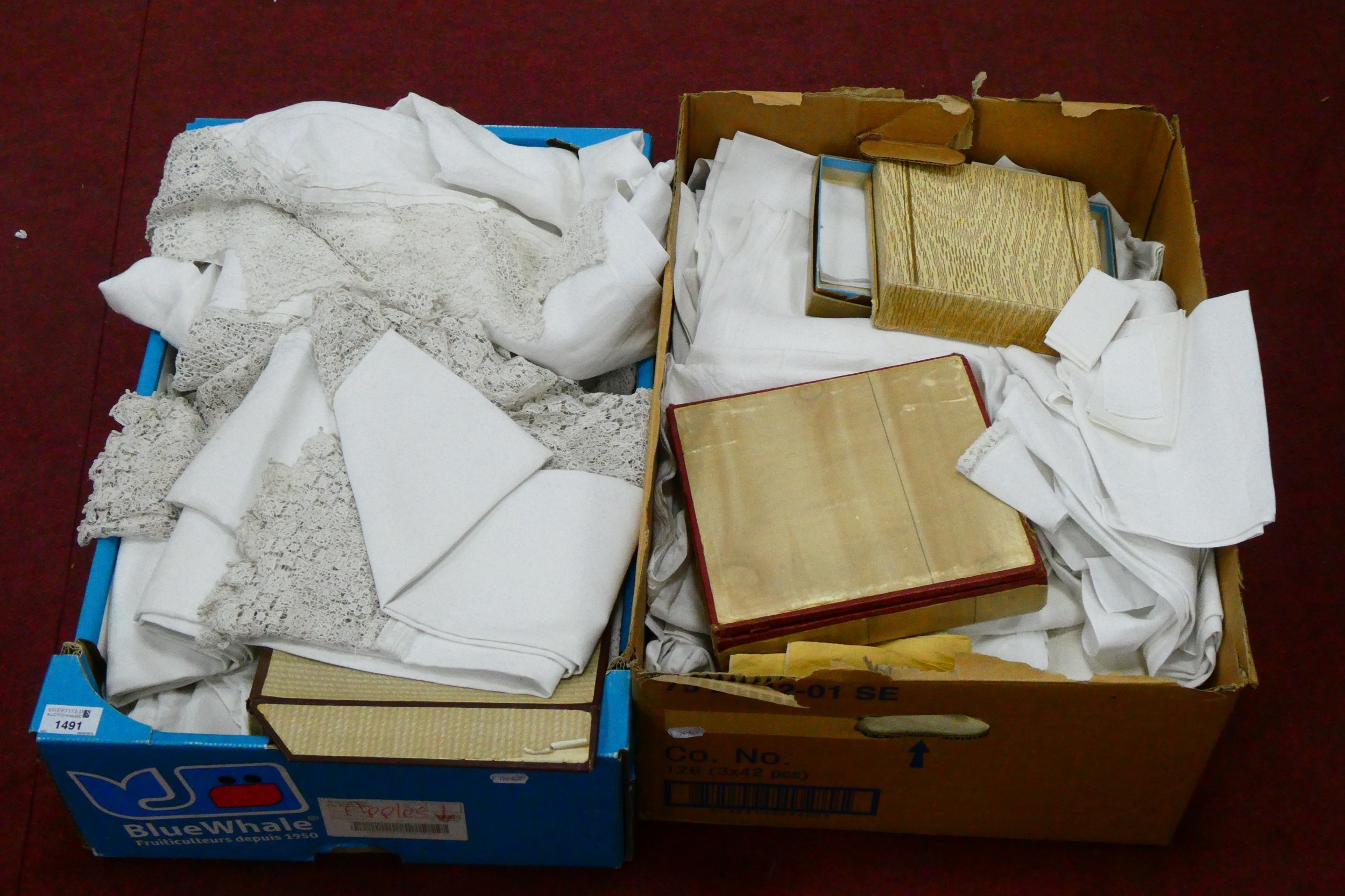 A Large Quantity of Linen Altar Cloths, some with lace and crochetwork borders, other white linen etc:- Two Boxes