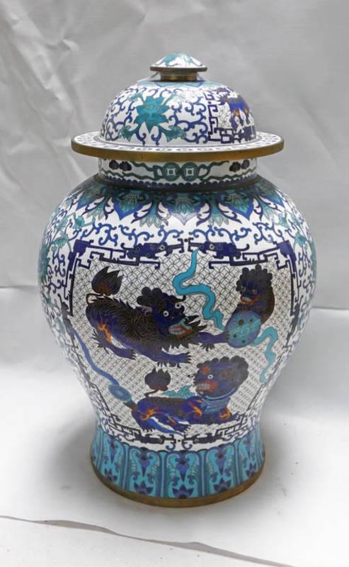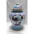 CHINESE BLUE & WHITE CLOISONNE BALUSTER GINGER JAR WITH SEAL MARK TO BASE - 37CM