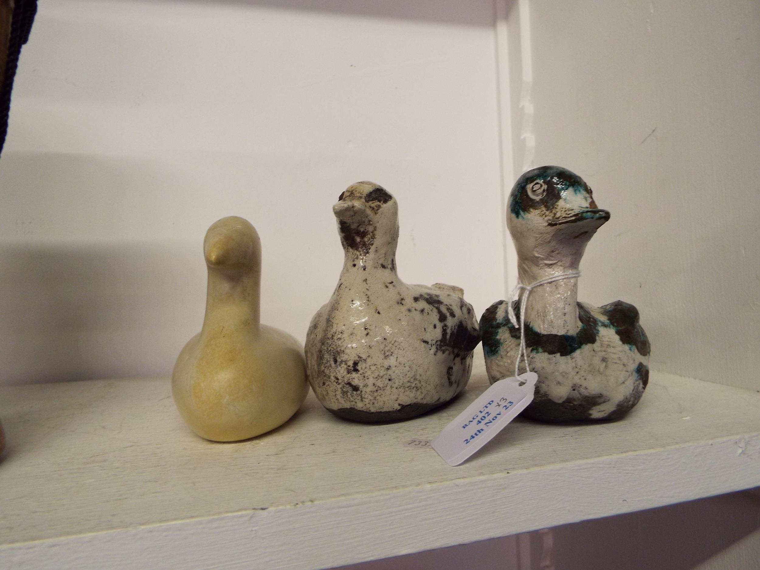 A soapstone figurine of a bird together with two pottery birds
