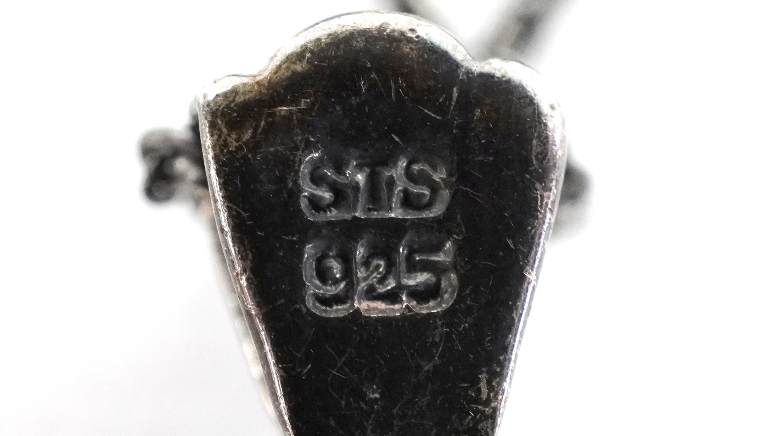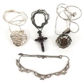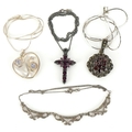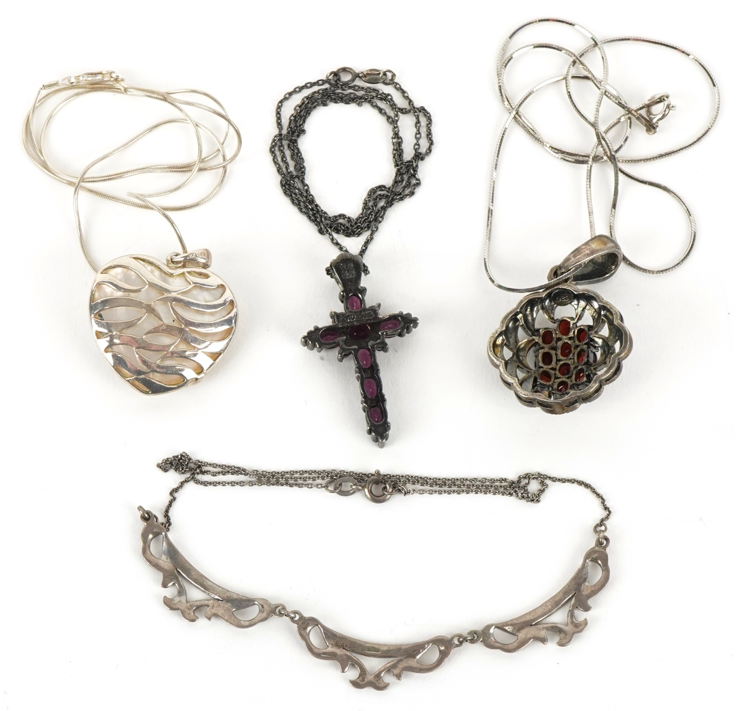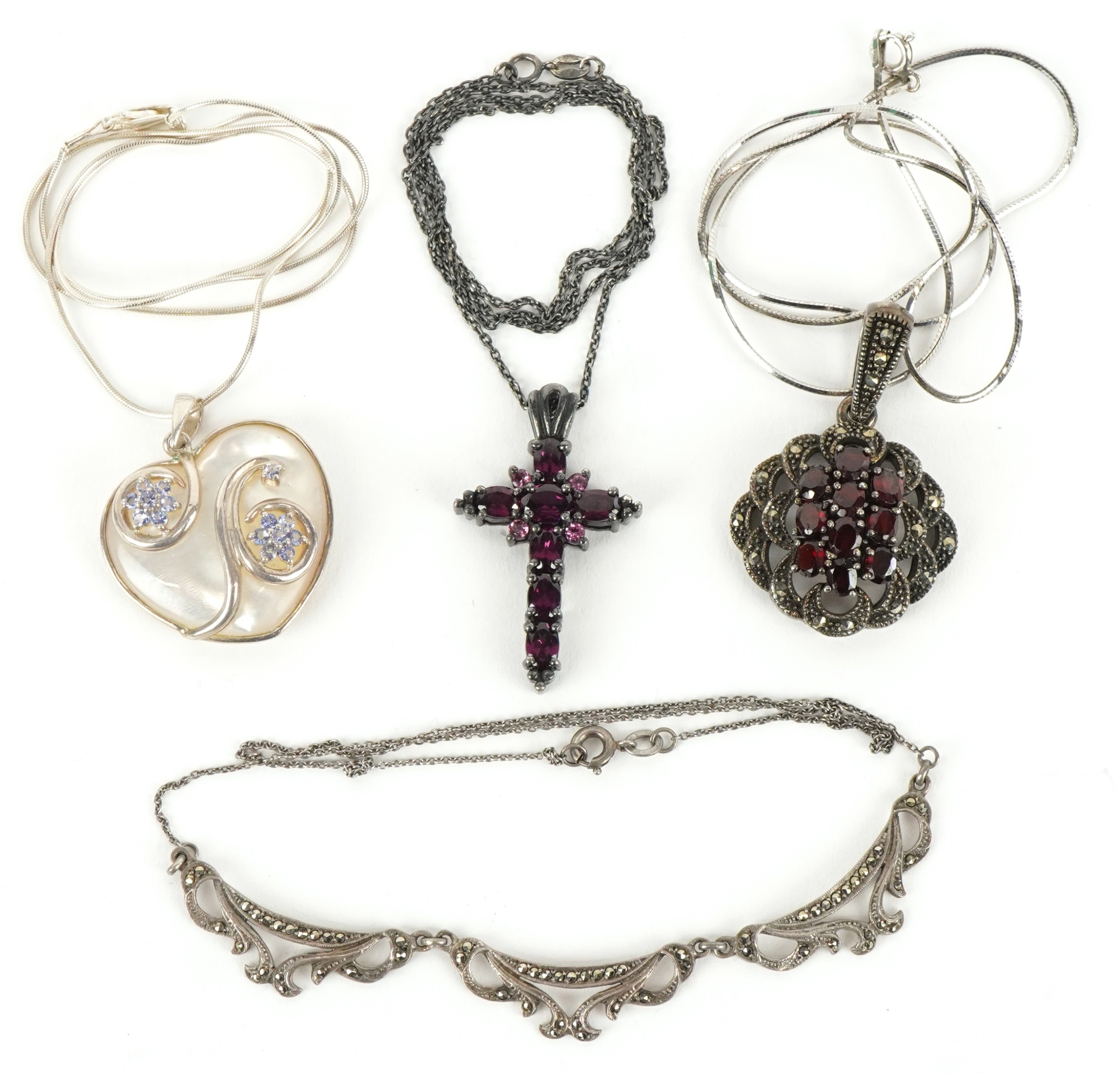 Four silver necklaces including an amethyst cross pendant and a garnet and marcasite cluster pendant, the largest 48cm in length, total 48.4g.
