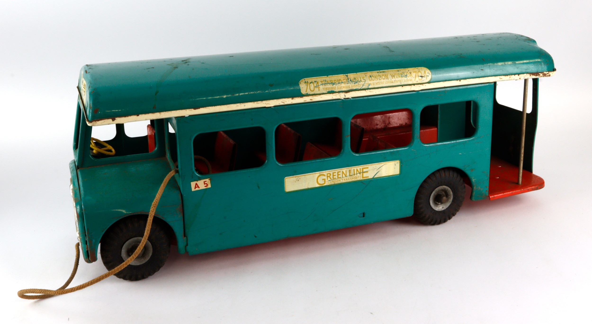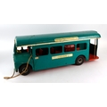 Triang large green press steel pull along London bus, with operating bell, number plate reads 'LIB 4242'